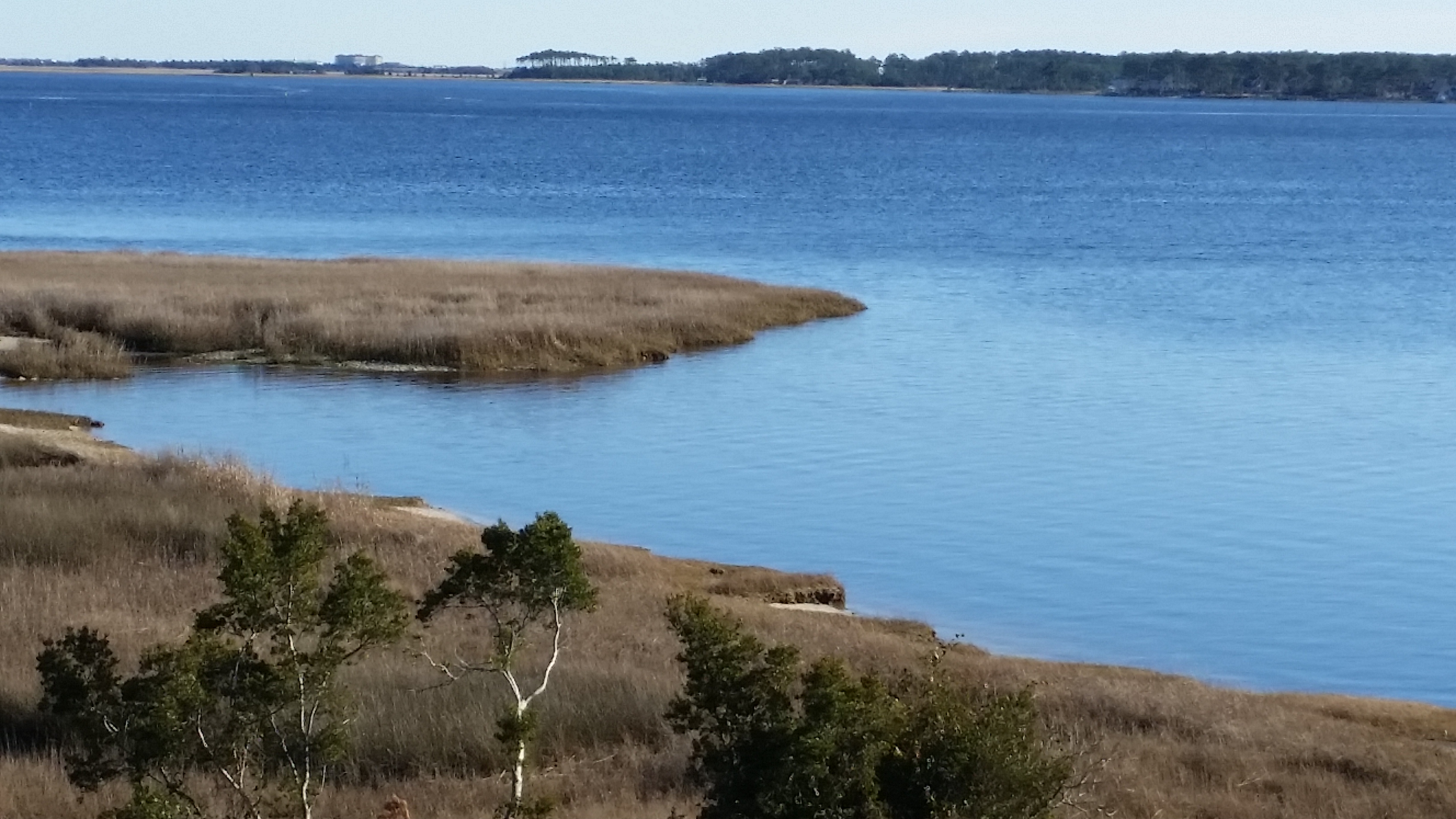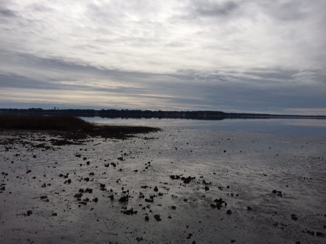 View of point from 3rd FL deck on gray day in late January - oyster leases marked with stakes
