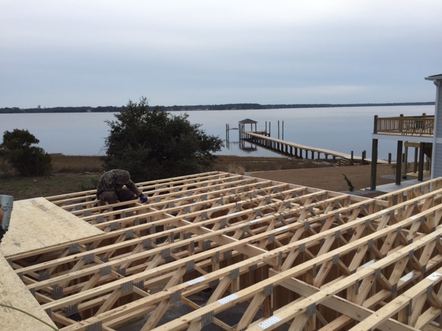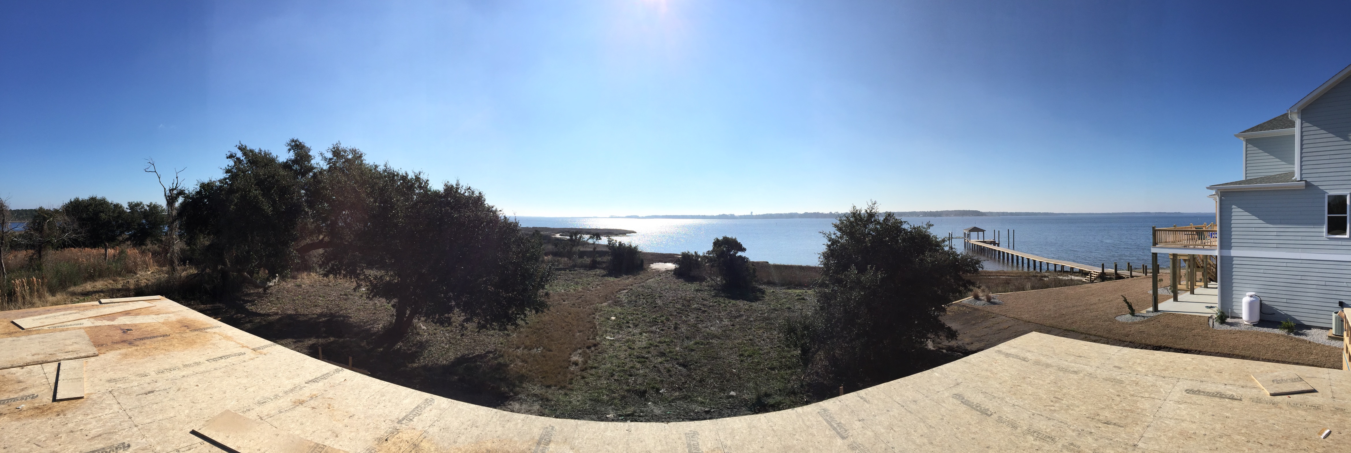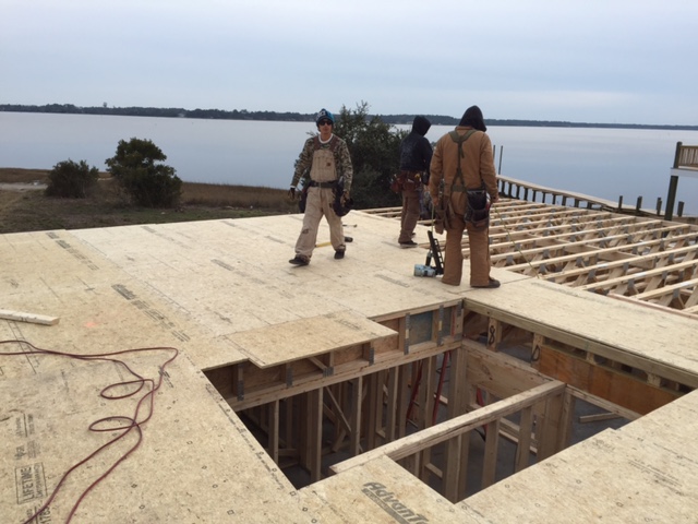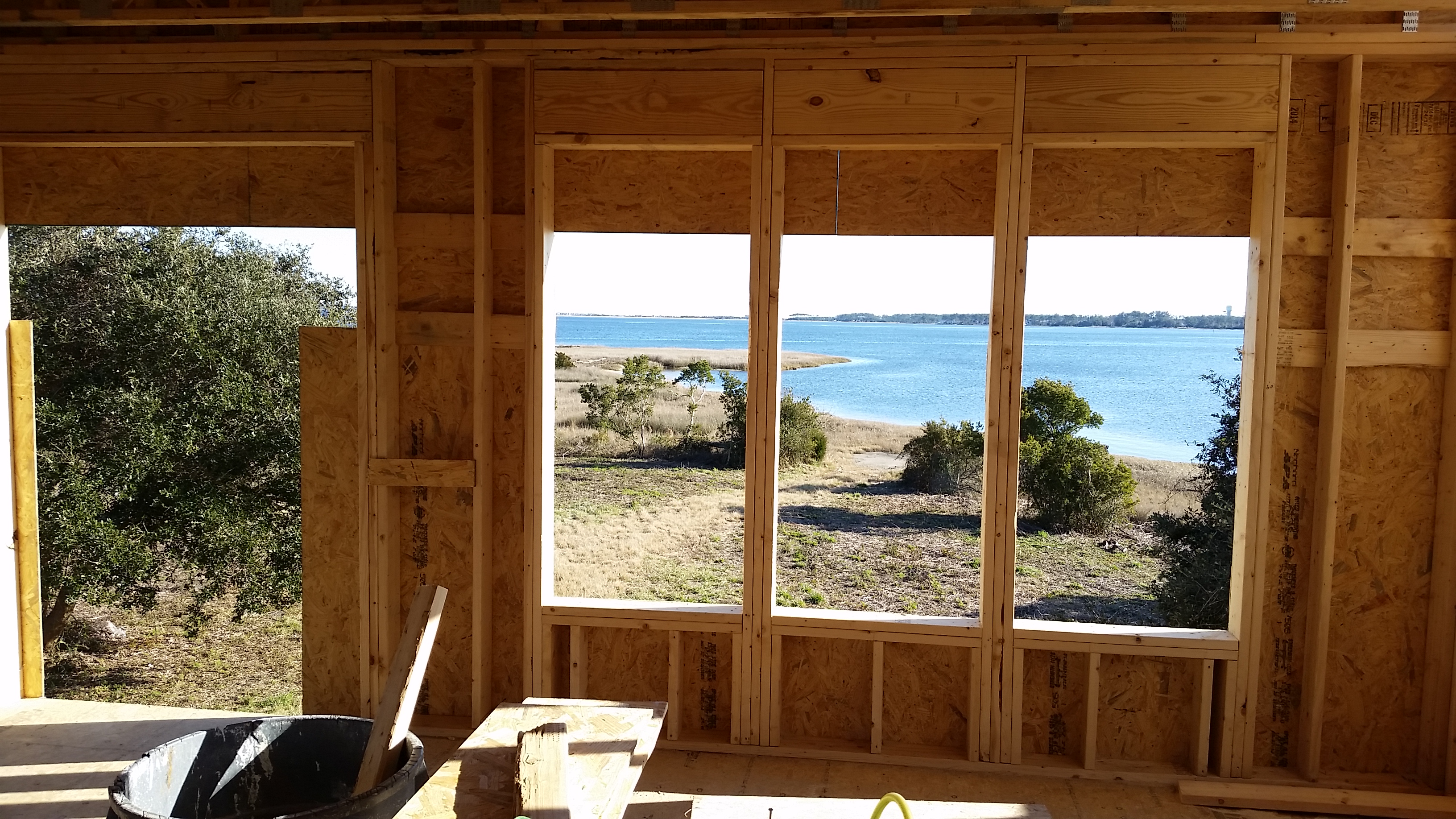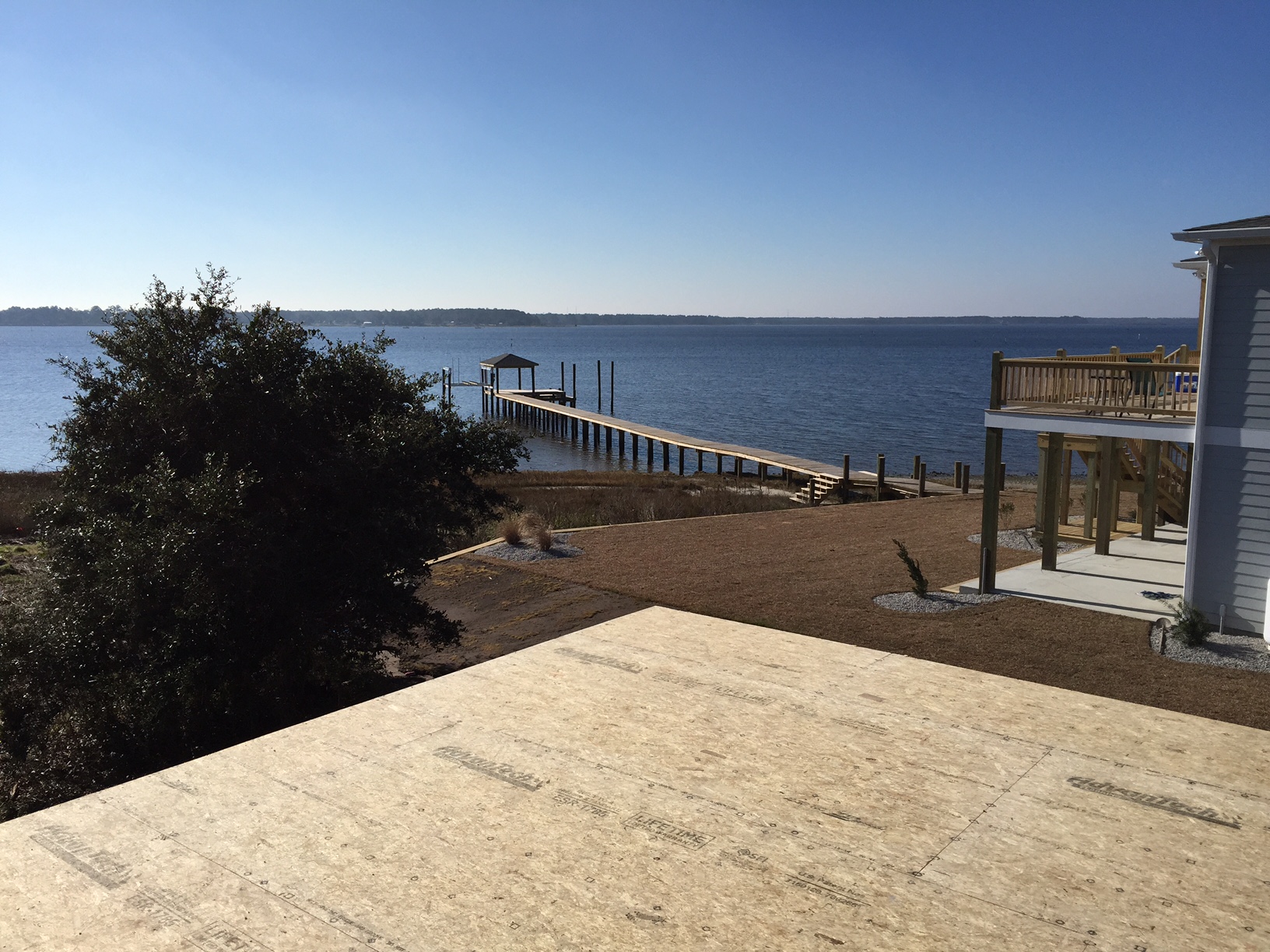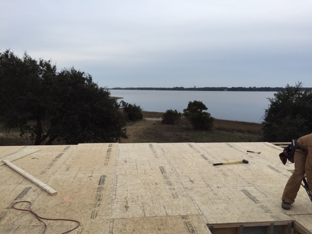 By the end of January, the framers had completed the decking on the third floor. The framing throughout is exceptional and clearly designed for extreme weather. Floor joists and subfloors are rock solid although a bit complicated to accommodate long internal spans and the dormers and large porch on the third floor. The builder ordered the windows and doors and will be starting on the water side porch on Monday, 2 February. This porch is a key element of the hip roof system. The views are simply amazing! The master bedroom, with 5 windows and a door is so well screened by the live oak that, under normal conditions, curtains probably will not be necessary.