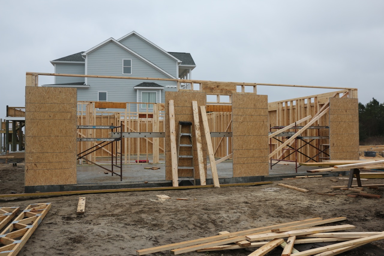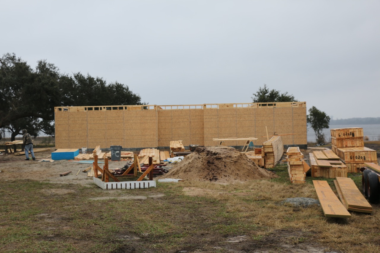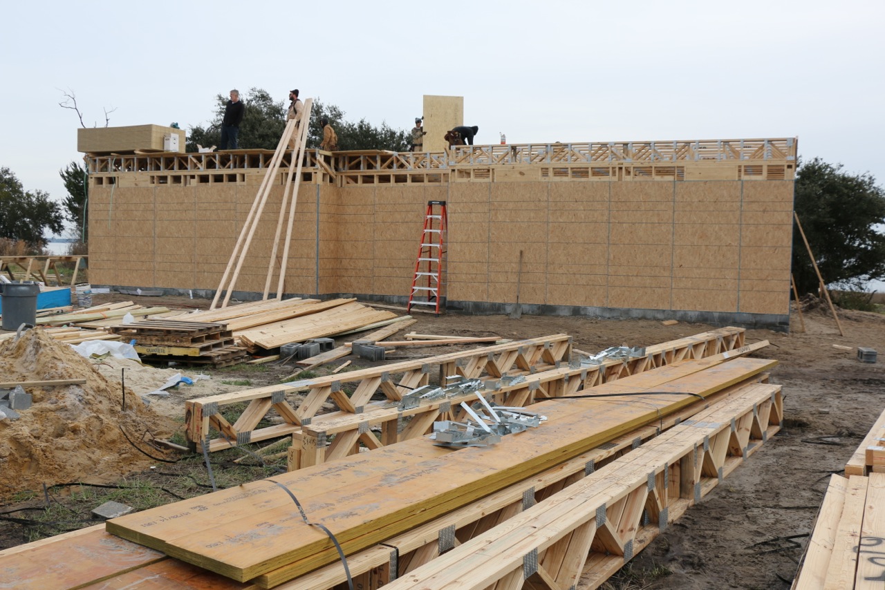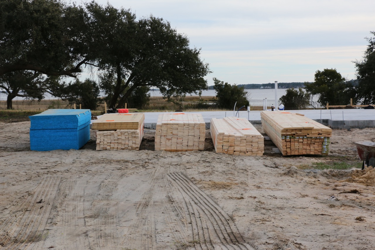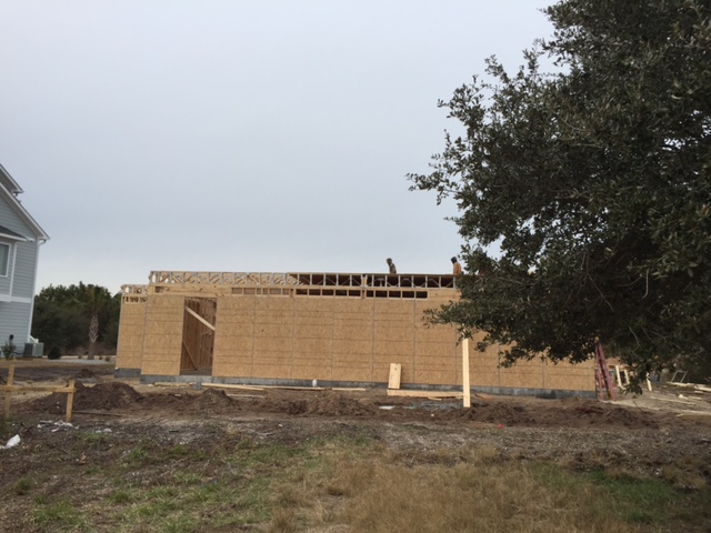 By the end of January, the framers had completed the decking on the third floor. The framing throughout is exceptional and clearly designed for extreme weather. Floor joists and subfloors are rock solid although a bit complicated to accommodate long internal spans and the dormers and large porch on the third floor. The builder ordered the windows and doors and will be starting on the water side porch on Monday, 2 February. This porch is a key element of the hip roof system. The views are simply amazing! The master bedroom, with 5 windows and a door is so well screened by the live oak that, under normal conditions, curtains probably will not be necessary.