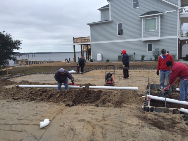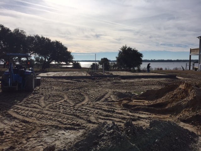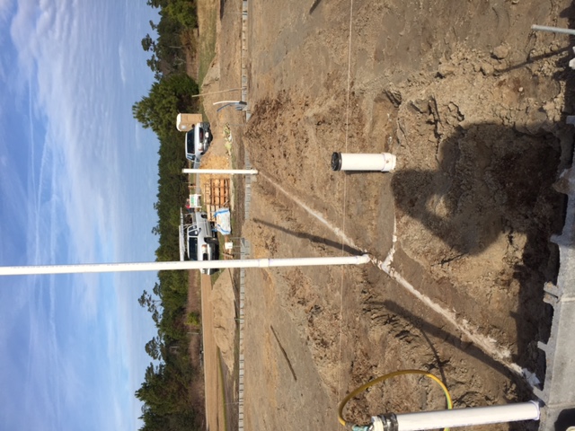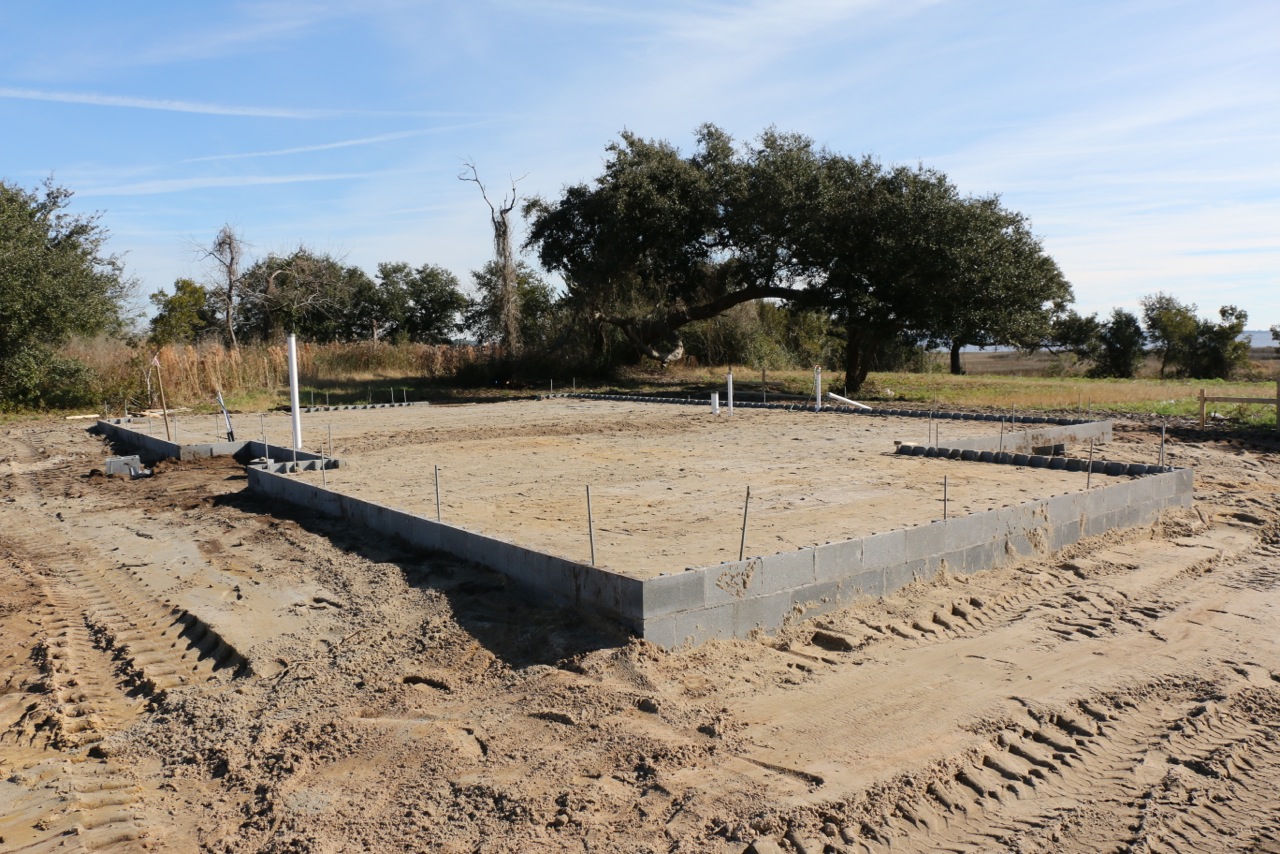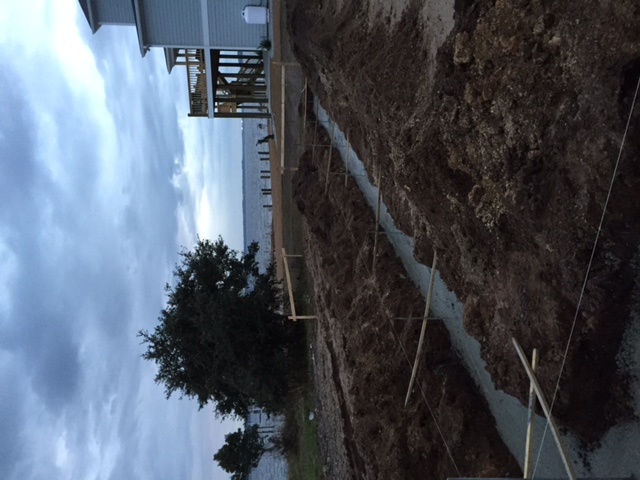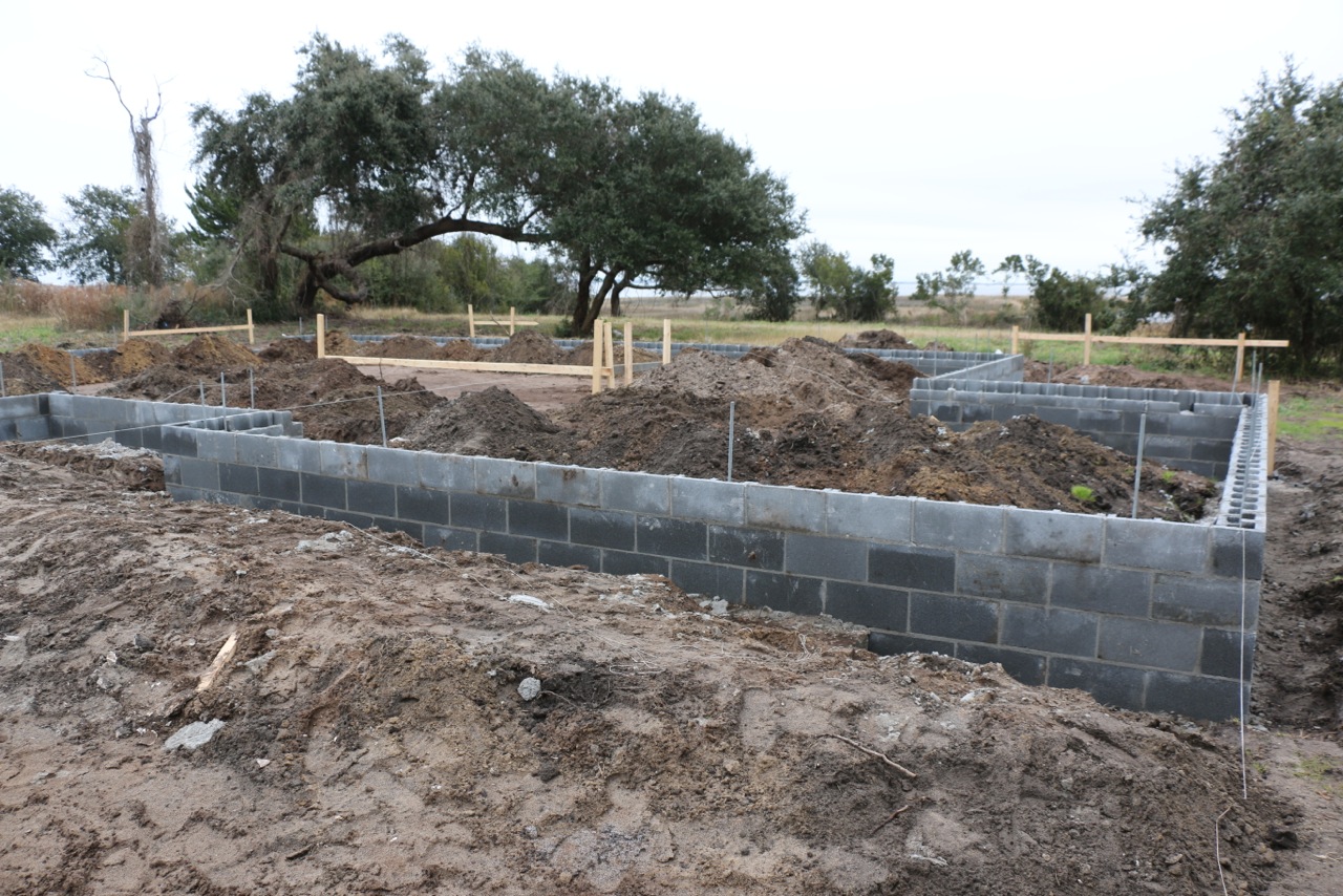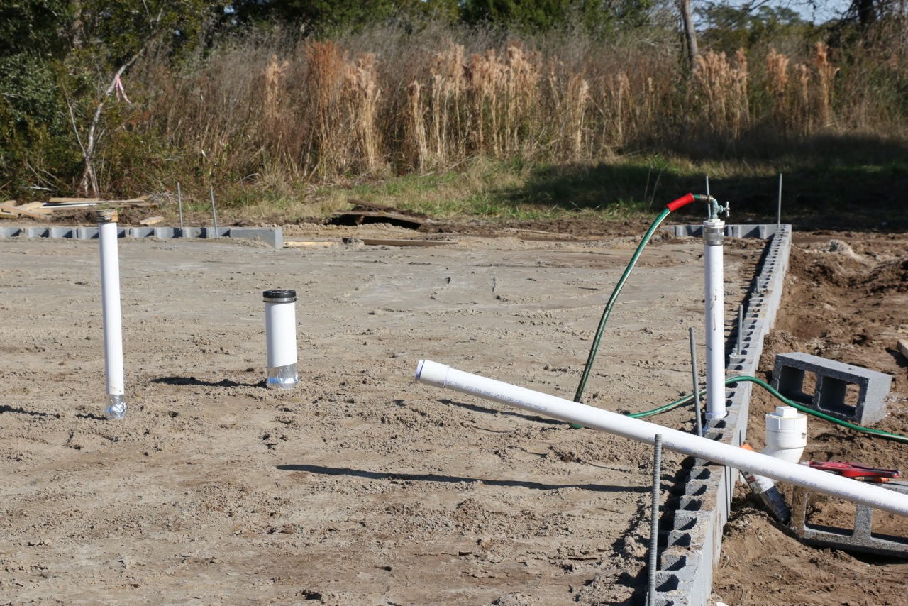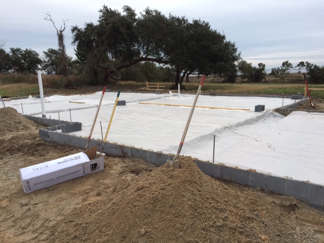 By the last day of December 2014, the builder has the under-slab plumbing installed and permitted as well as the fill in place and compacted. He also had an insect treatment applied to the compacted fill under the slab. With 4 inches removed from the inside top course of block, this ensures that the concrete for the slab creates a monolithic unit with the rebar-reinforced block walls and the footings.