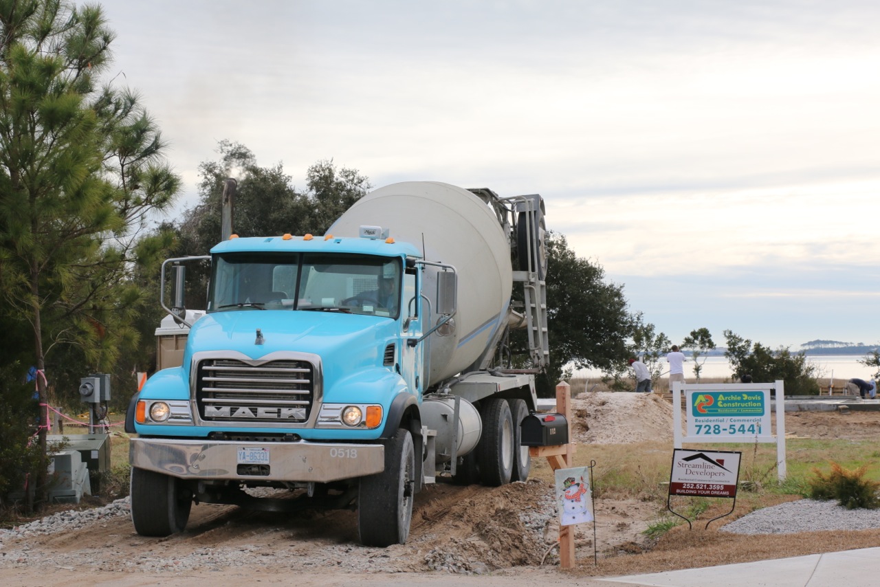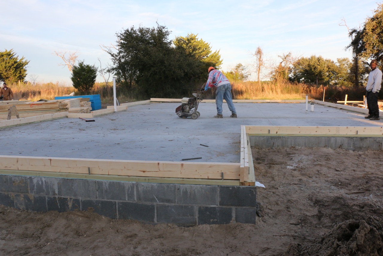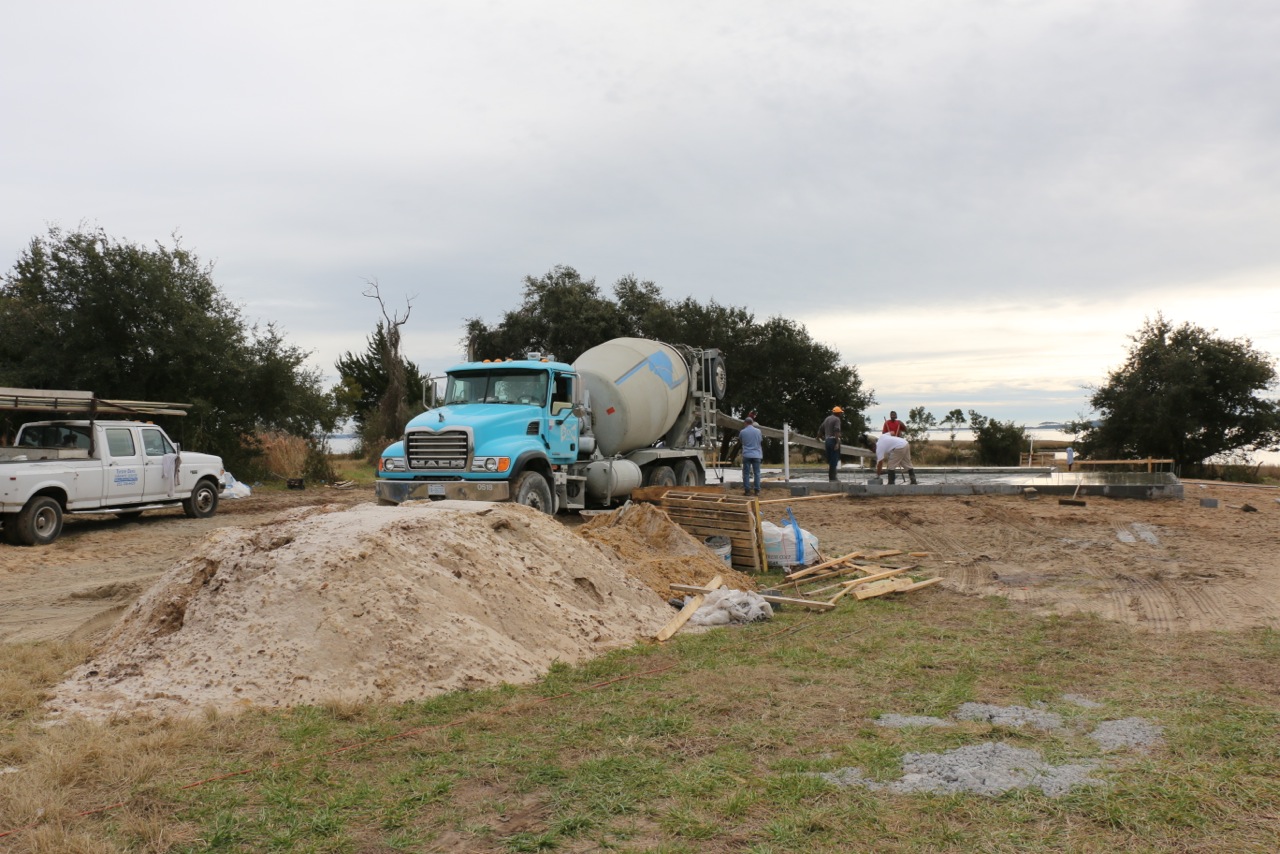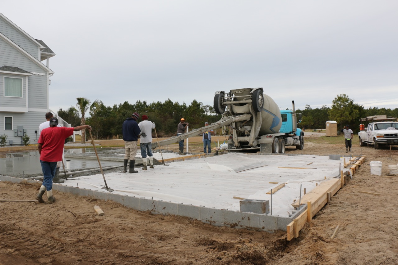 With everything ready to pour the concrete slab on Friday, 2 Jan 2015, we received an email confirmation from the building inspector just after 10:00 that everything was OK. With two truck loads of concrete, the pour went as planned and they were finished by about 13:00. Photos courtesy of Archie Davis and neighbor, Neal Stetson.