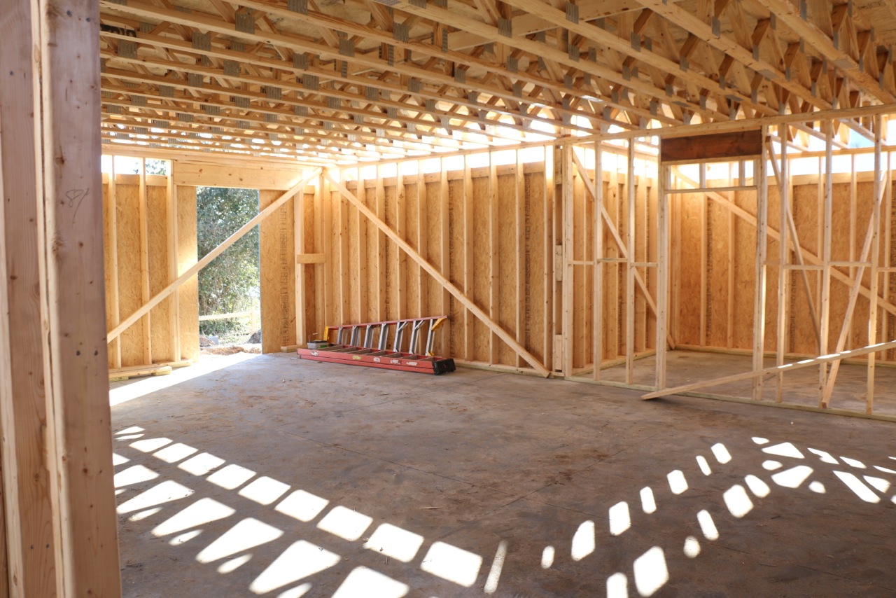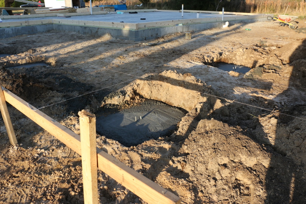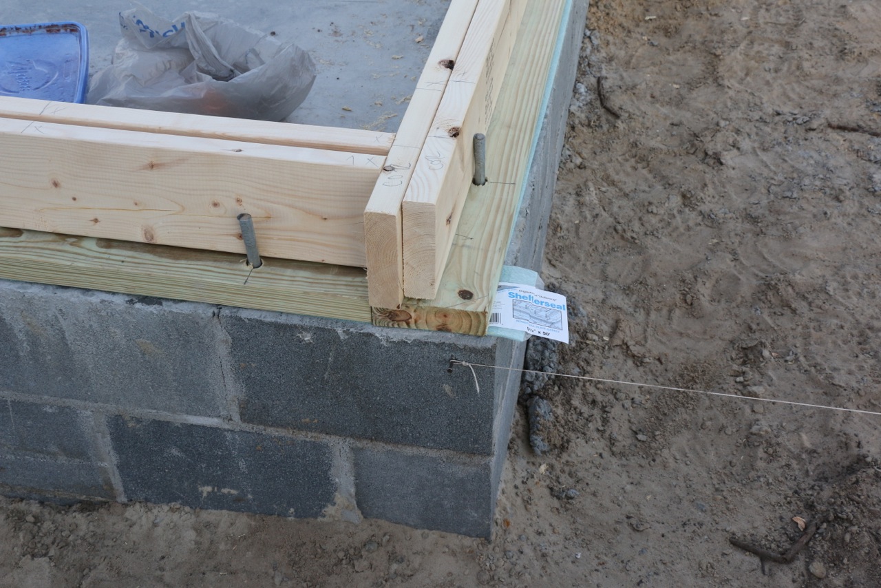 The concrete crew returned to strip forms providing a slight slope for garage doors and to cut a few saw kerfs to help limit any potential cracking of the slab in the future. The builder dug and poured footings for the porch posts and installed sill plates for the exterior wall framing.