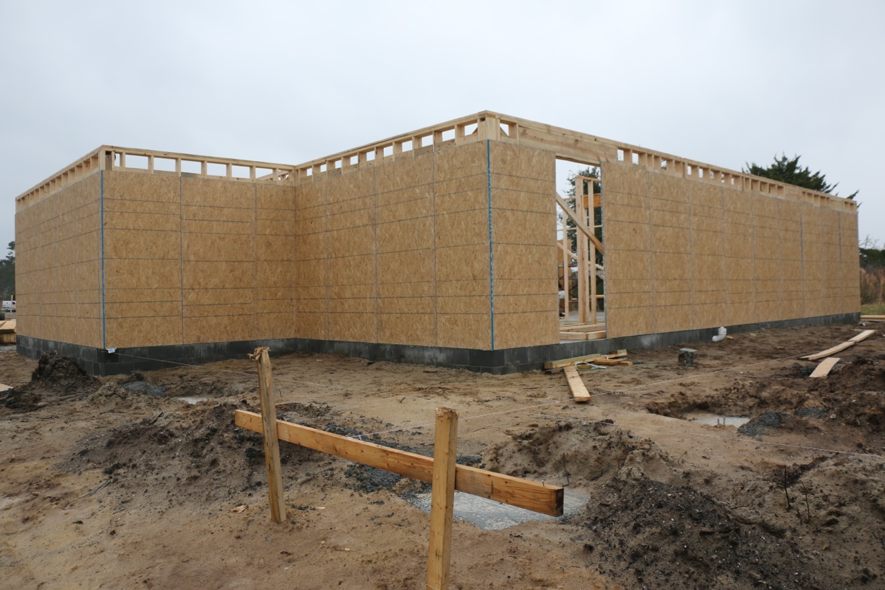 By Tuesday afternoon, 13 Jan, ground floor walls were up with all of the sheathing in place. Window openings are framed and will be opened later. The weather, rainy, blustery and in the high teens, was unseasonably cold. The framers have most of the interior walls in place and are almost ready to begin installing floor joists.