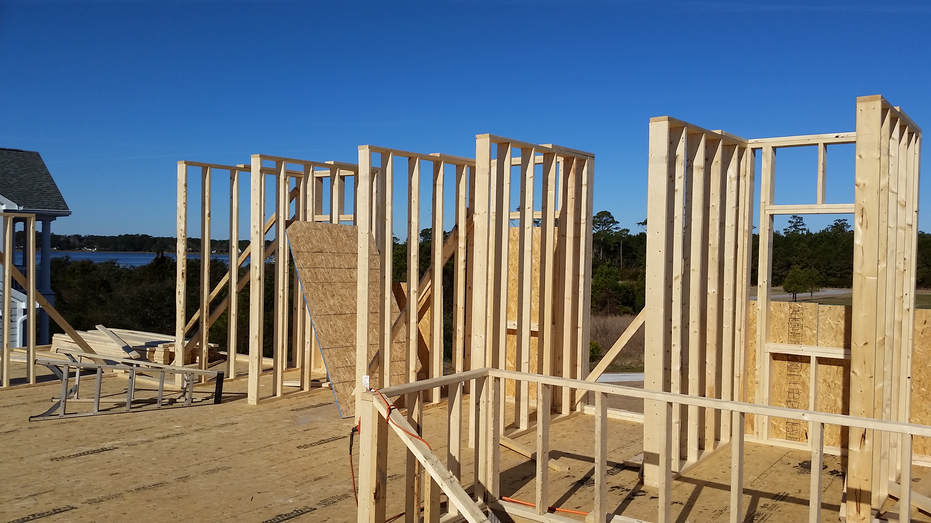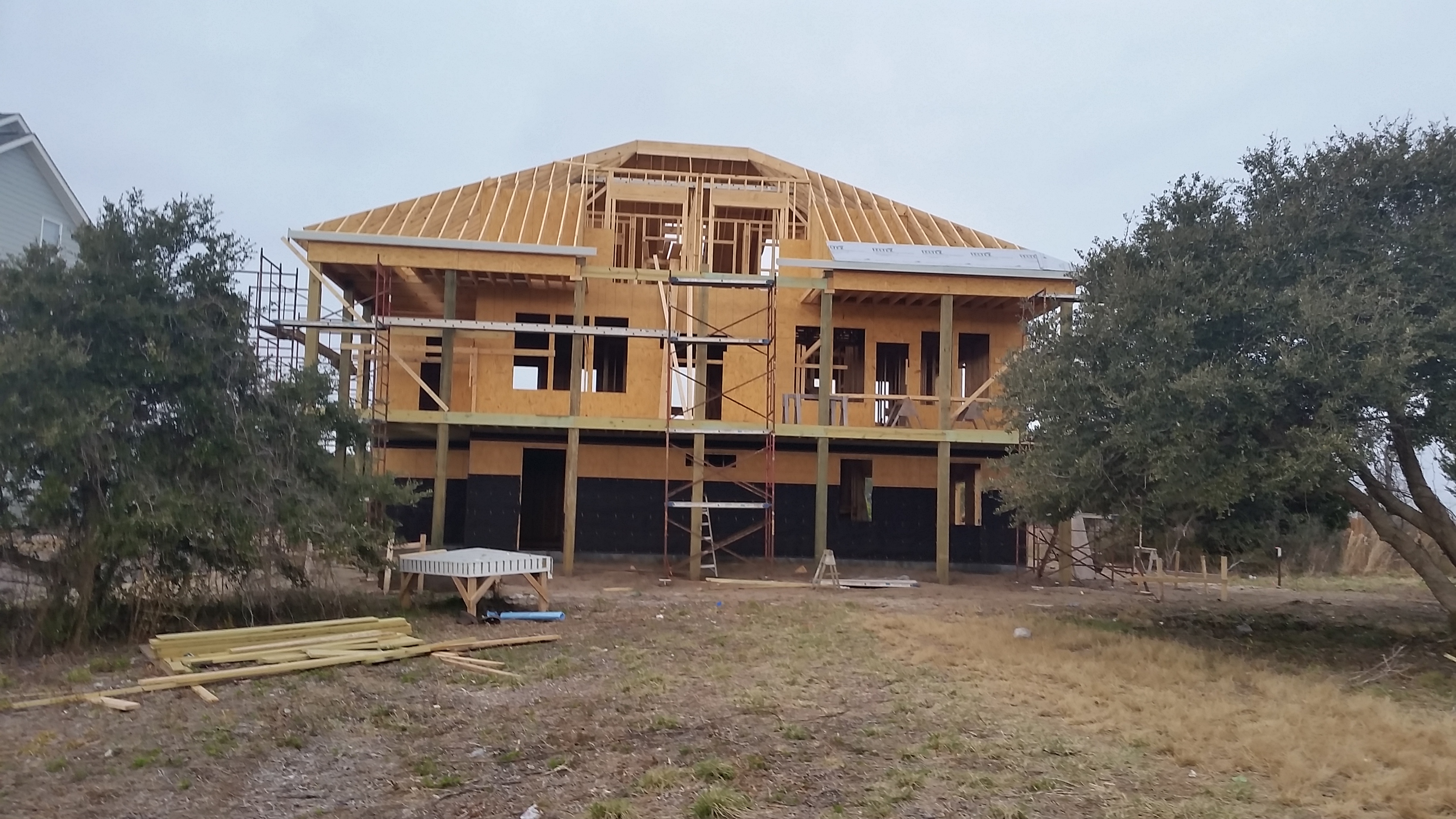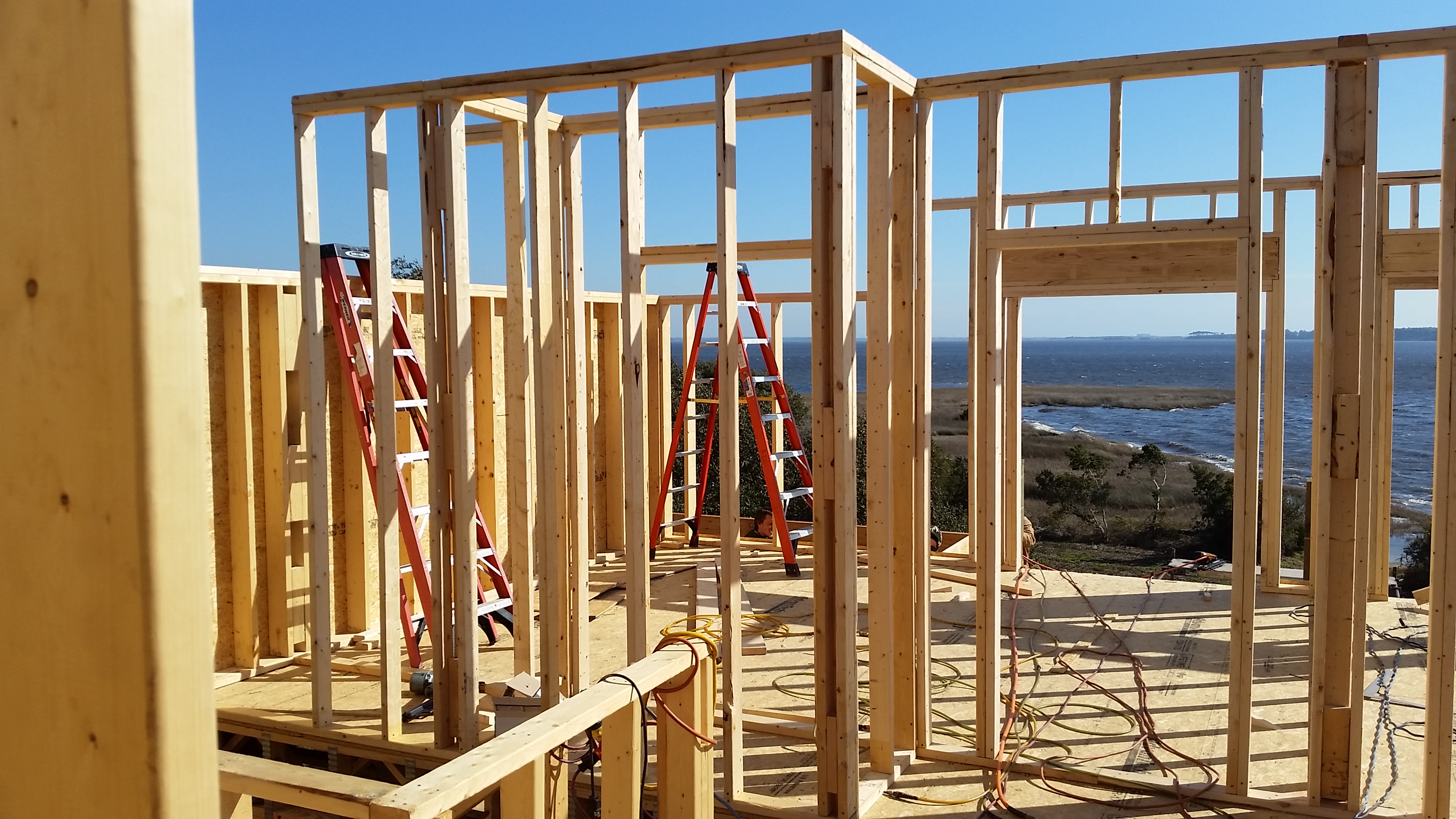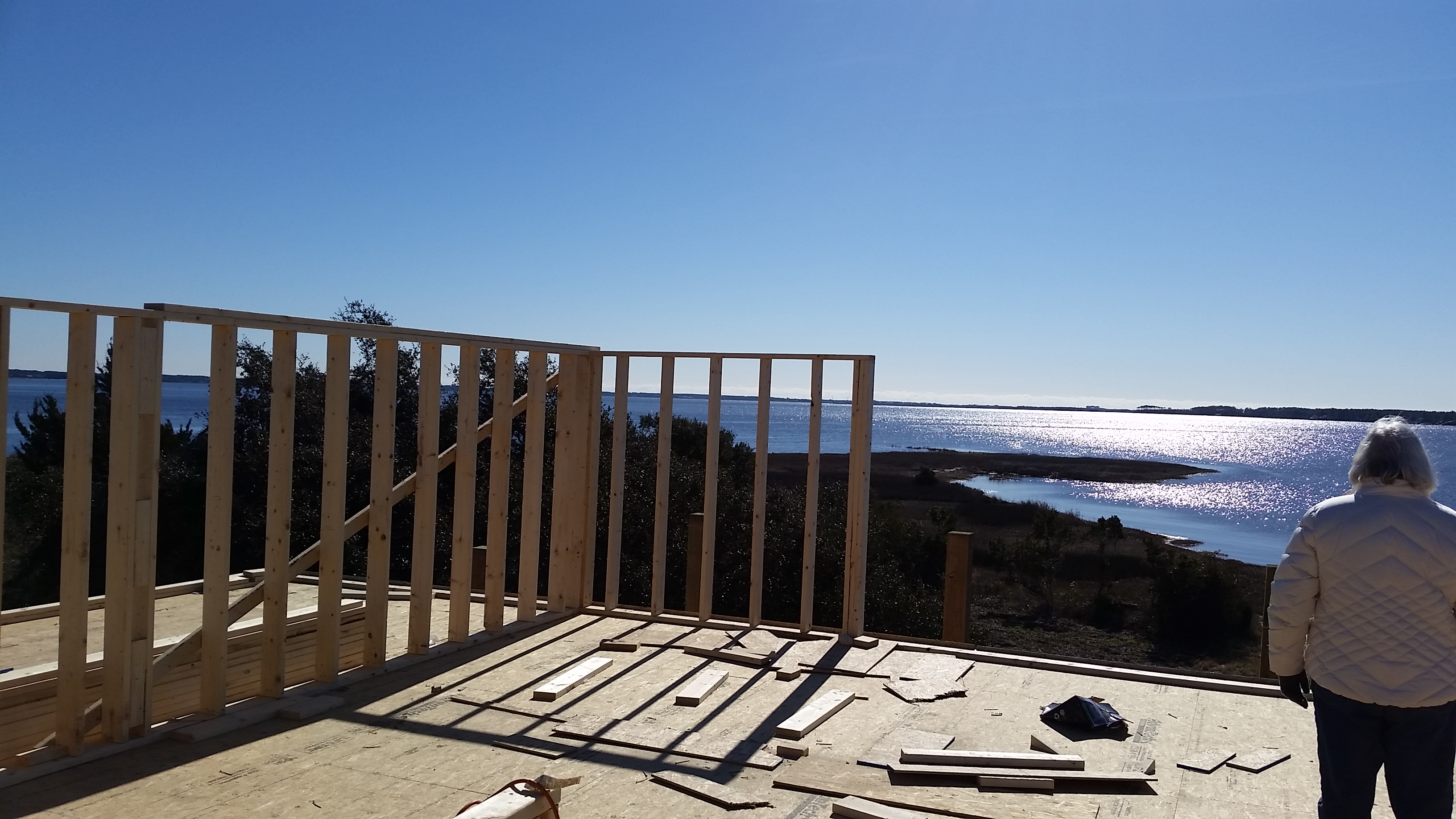 Friday, 6 February all of the posts for the main porch are up and kneewalls and dormers are in place on the third floor. The framing crew continues to do stellar work much faster than we anticipated in spite of enduring another week of cold windy weather with intermittent rain. As show in the photos, it was sunny on this particular day, with temperatures still hovering around freezing at midmorning. The main waterside porch will be about 10 inches or so below the finish floor height in order to allow those inside to enjoy a view while seated which will be above the porch rail. The view of the Newport River and Harlowe Creek is simply fabulous. From the 3rd FL porch, we suspect it may be possible on a clear day to see the Cape Lookout lighthouse, about 10 miles away on the Outer Banks.