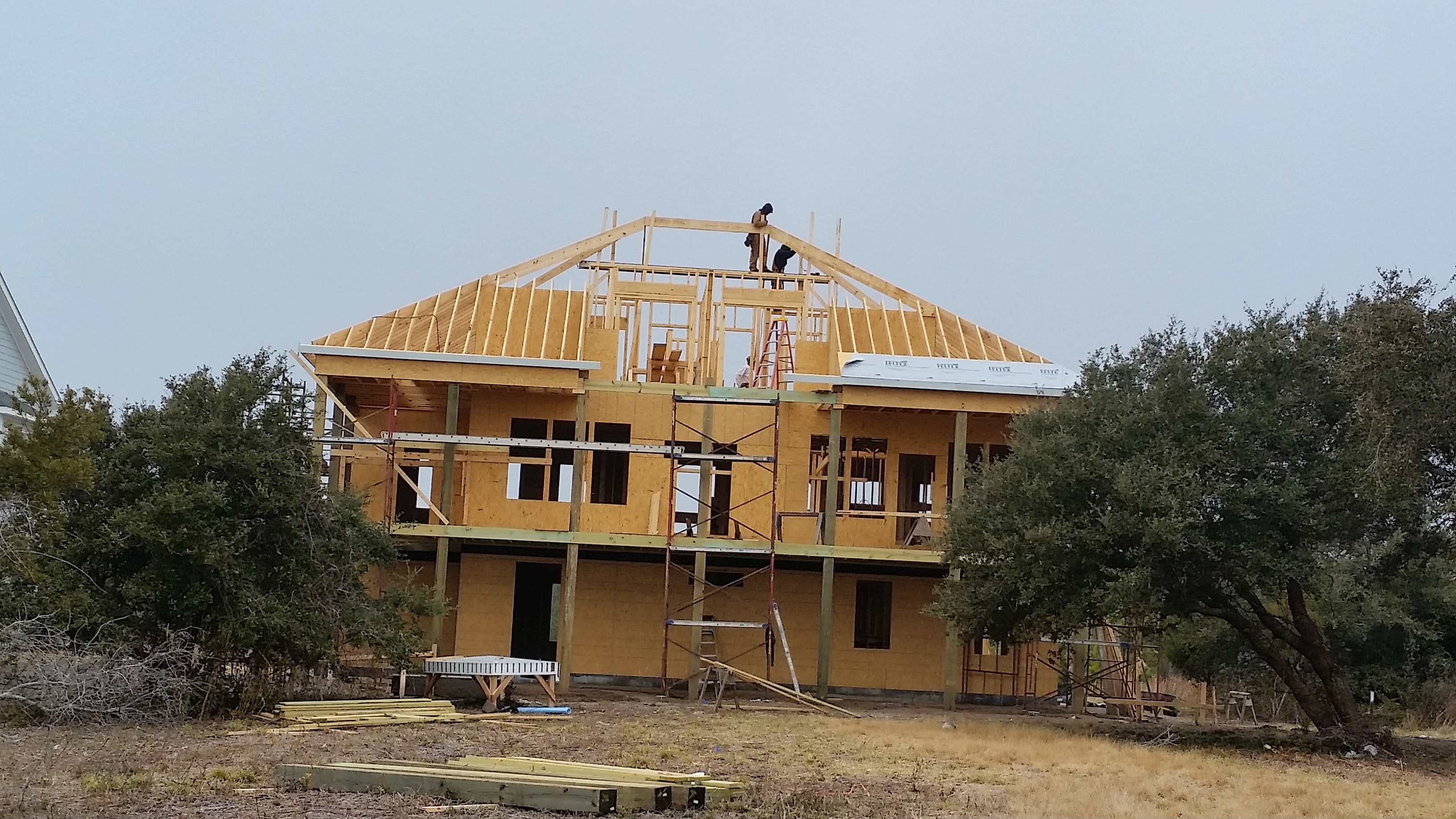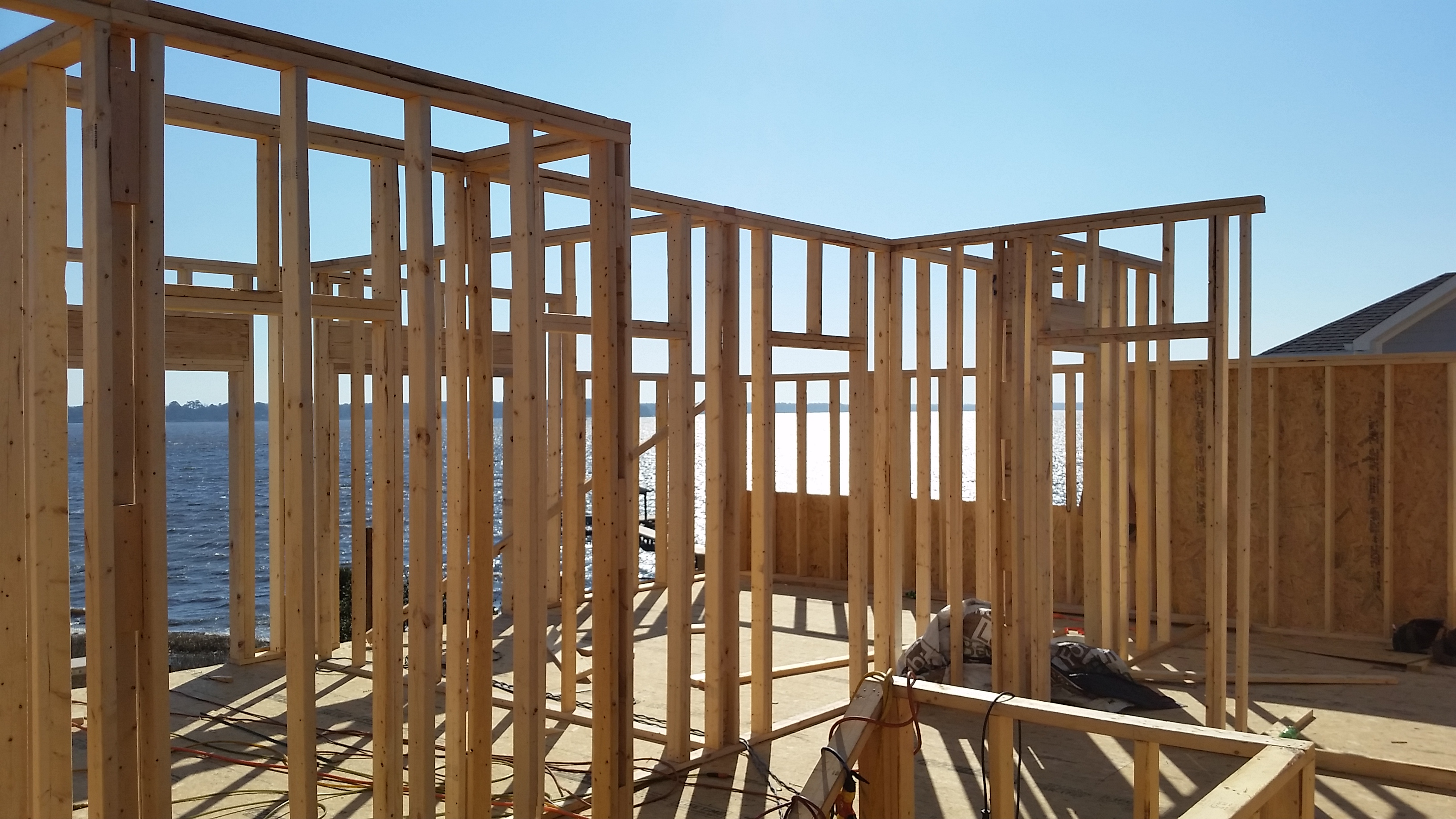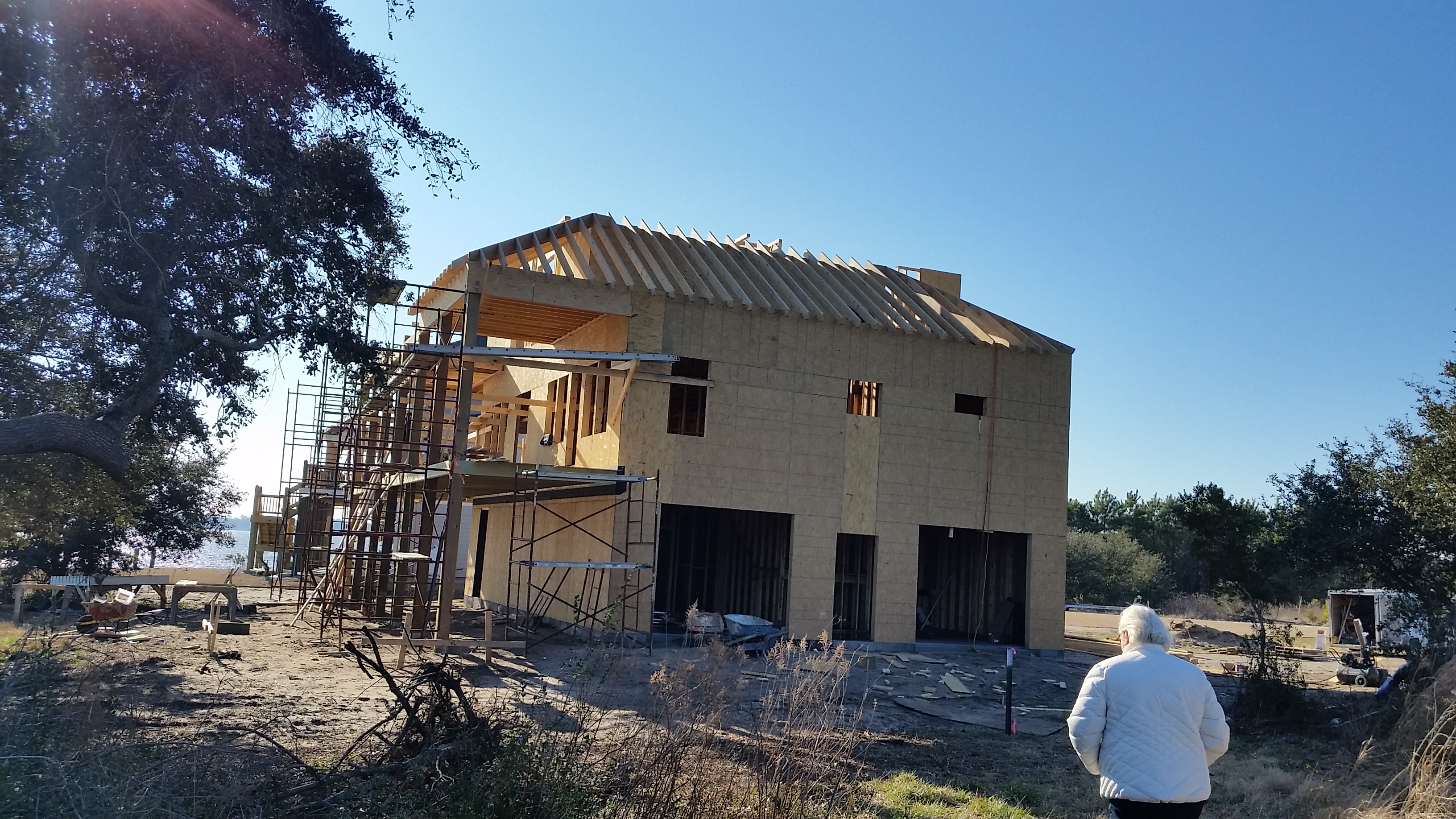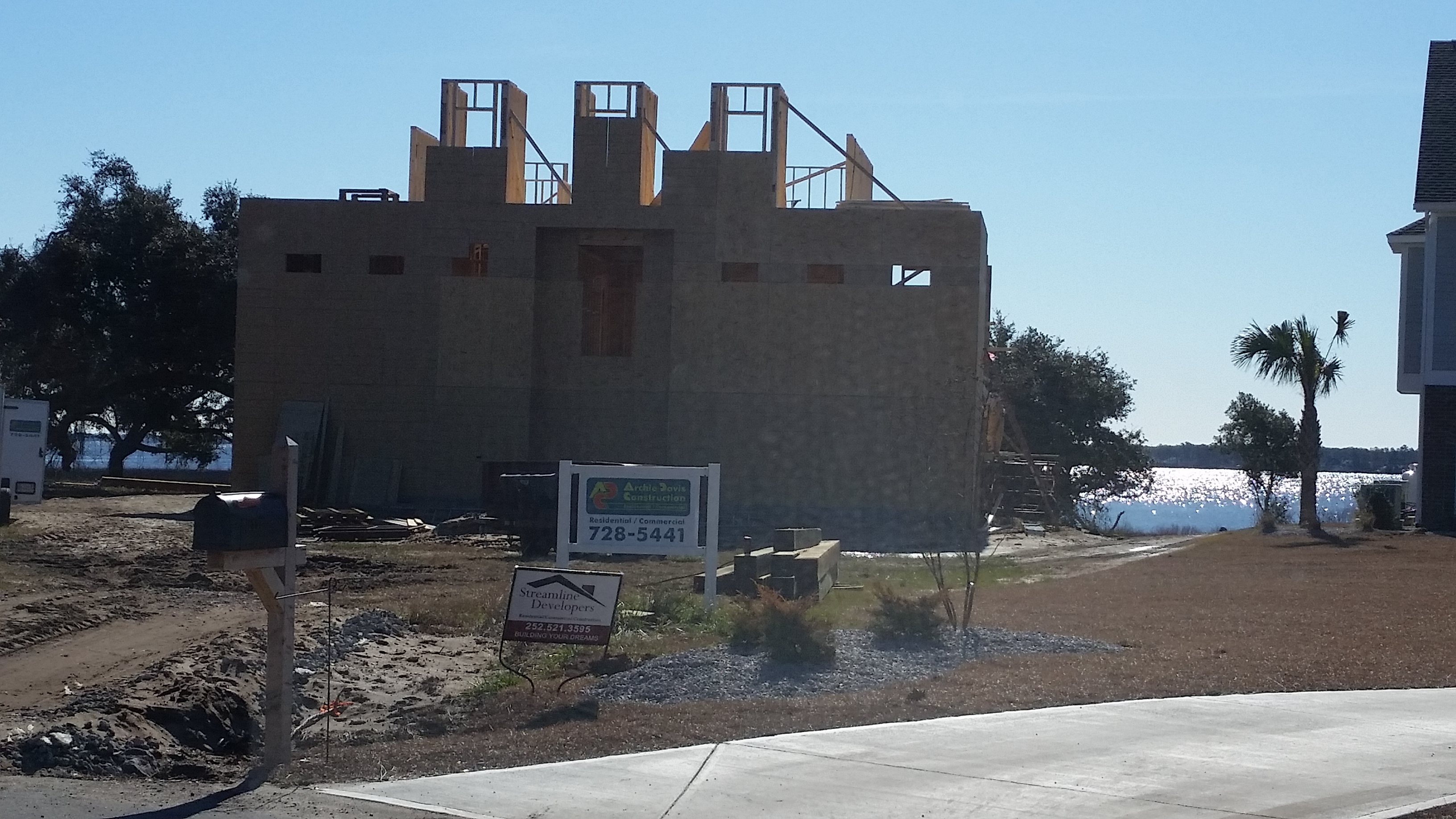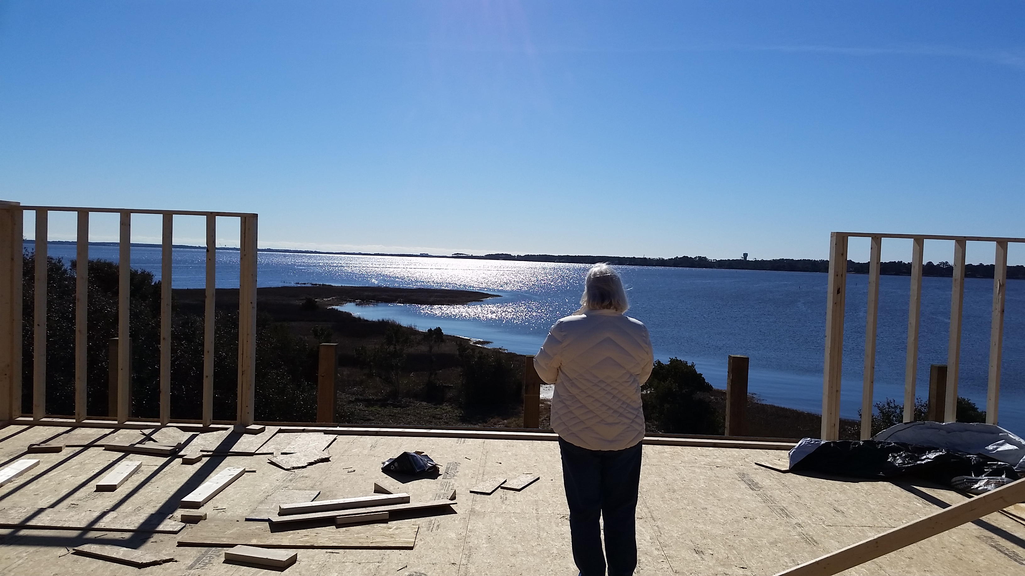 Friday, 6 February all of the posts for the main porch are up and kneewalls and dormers are in place on the third floor. The framing crew continues to do stellar work much faster than we anticipated in spite of enduring another week of cold windy weather with intermittent rain. As show in the photos, it was sunny on this particular day, with temperatures still hovering around freezing at midmorning. The main waterside porch will be about 10 inches or so below the finish floor height in order to allow those inside to enjoy a view while seated which will be above the porch rail. The view of the Newport River and Harlowe Creek is simply fabulous. From the 3rd FL porch, we suspect it may be possible on a clear day to see the Cape Lookout lighthouse, about 10 miles away on the Outer Banks.