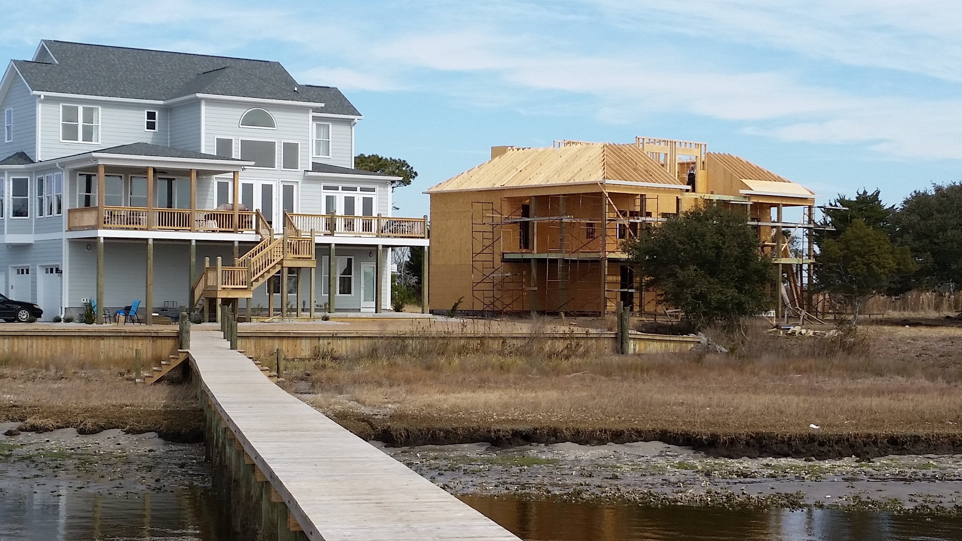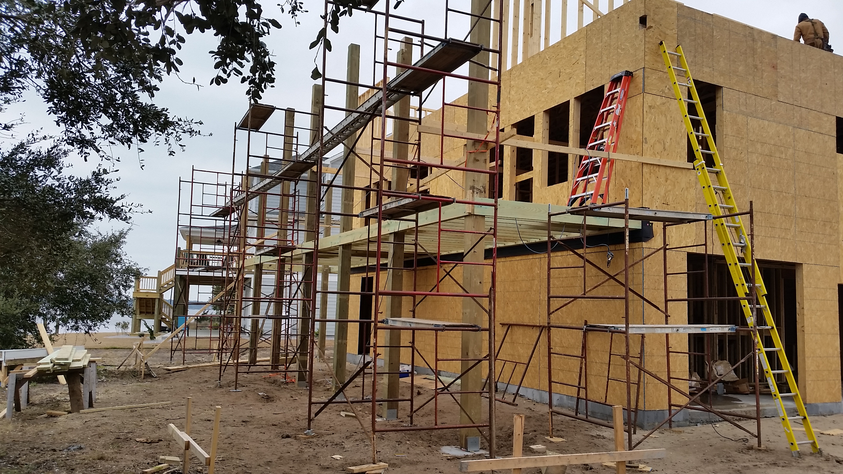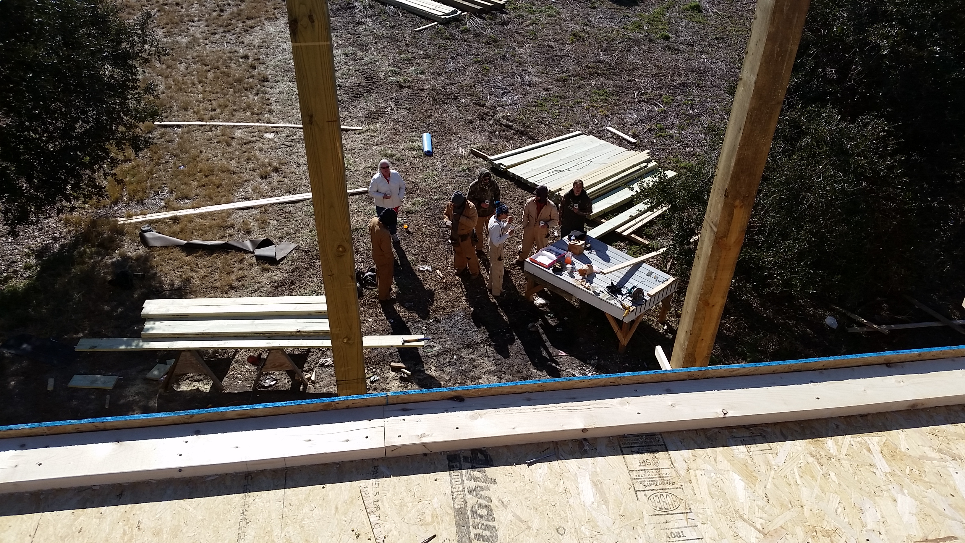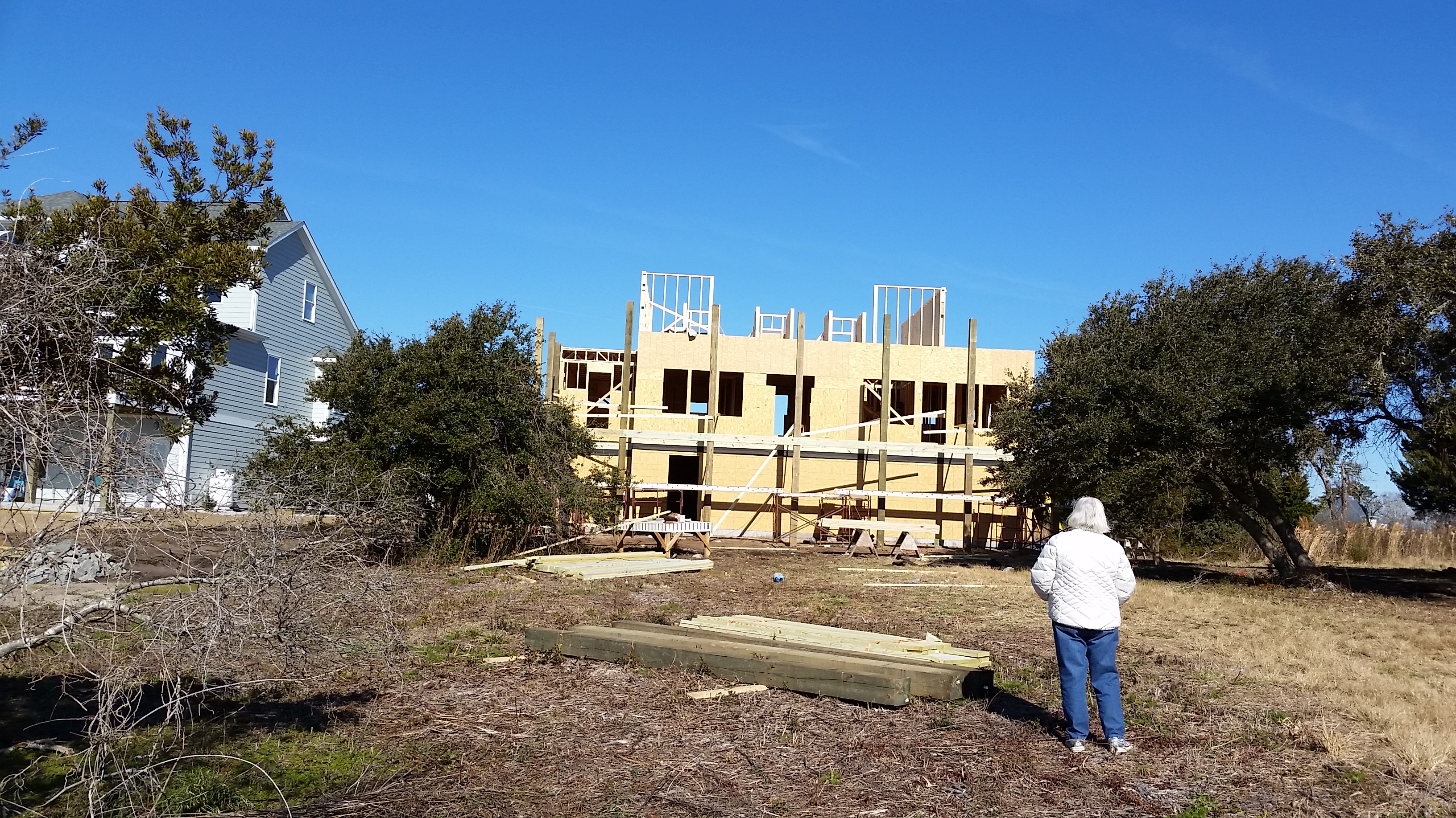 Friday, 6 February all of the posts for the main porch are up and kneewalls and dormers are in place on the third floor. The framing crew continues to do stellar work much faster than we anticipated in spite of enduring another week of cold windy weather with intermittent rain. As show in the photos, it was sunny on this particular day, with temperatures still hovering around freezing at midmorning. The main waterside porch will be about 10 inches or so below the finish floor height in order to allow those inside to enjoy a view while seated which will be above the porch rail. The view of the Newport River and Harlowe Creek is simply fabulous. From the 3rd FL porch, we suspect it may be possible on a clear day to see the Cape Lookout lighthouse, about 10 miles away on the Outer Banks.