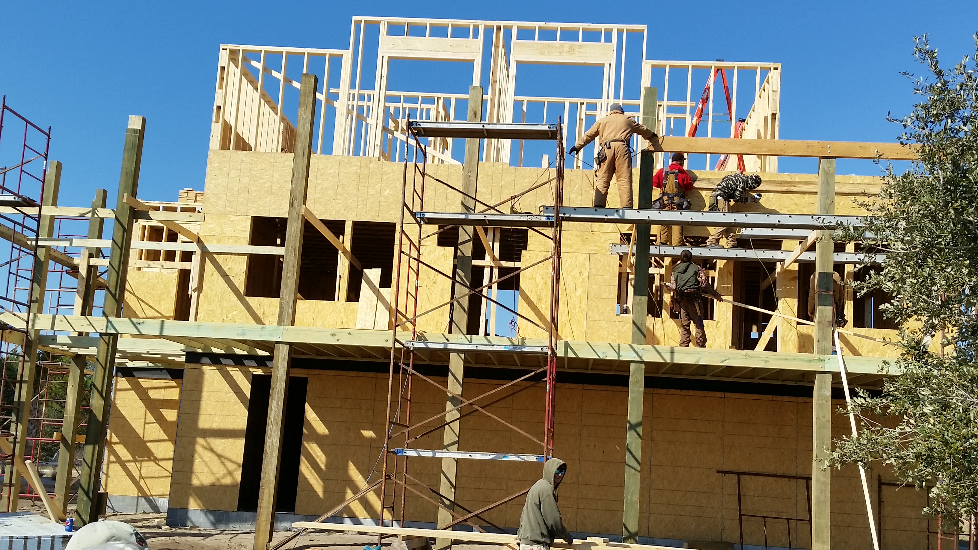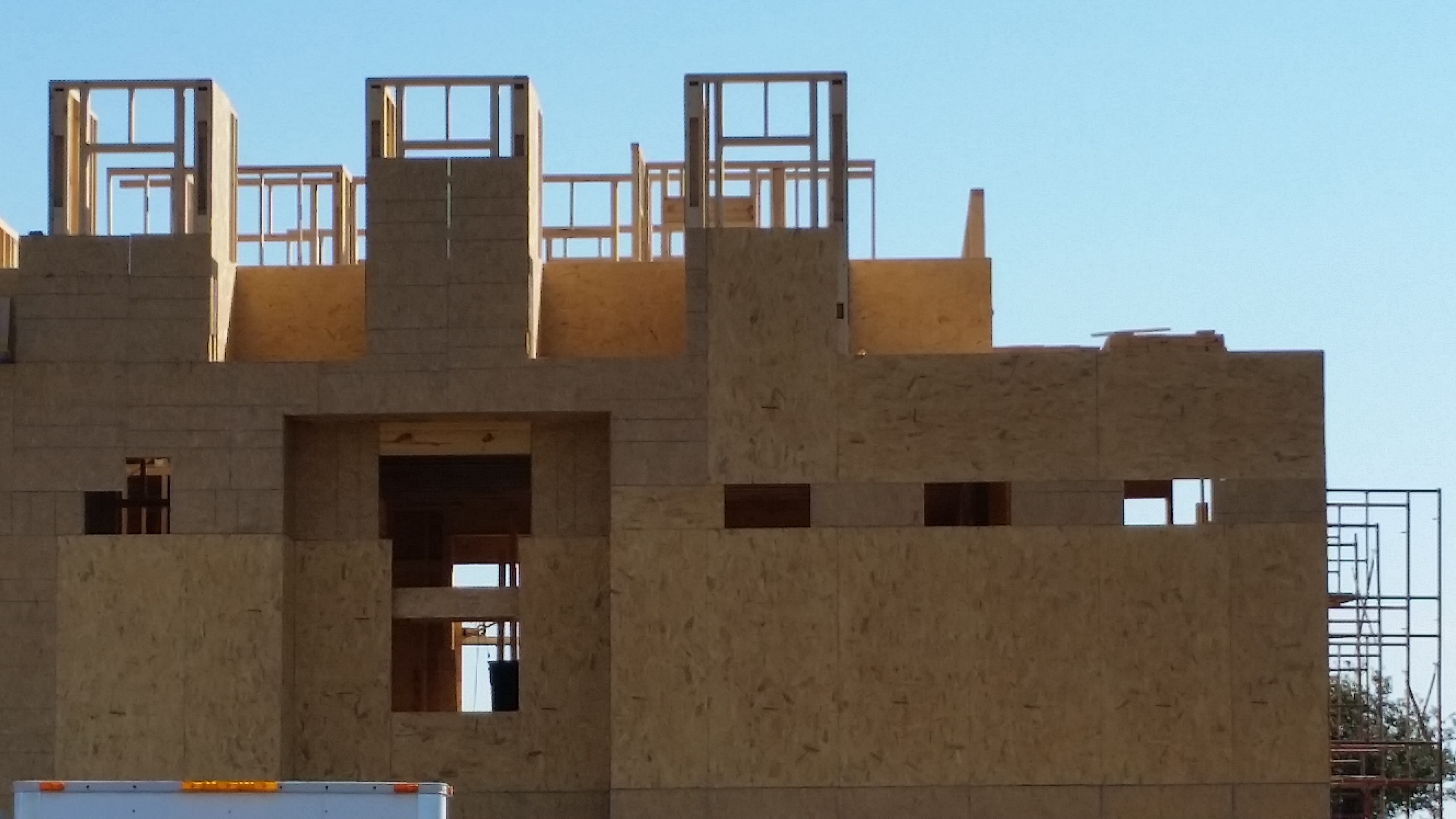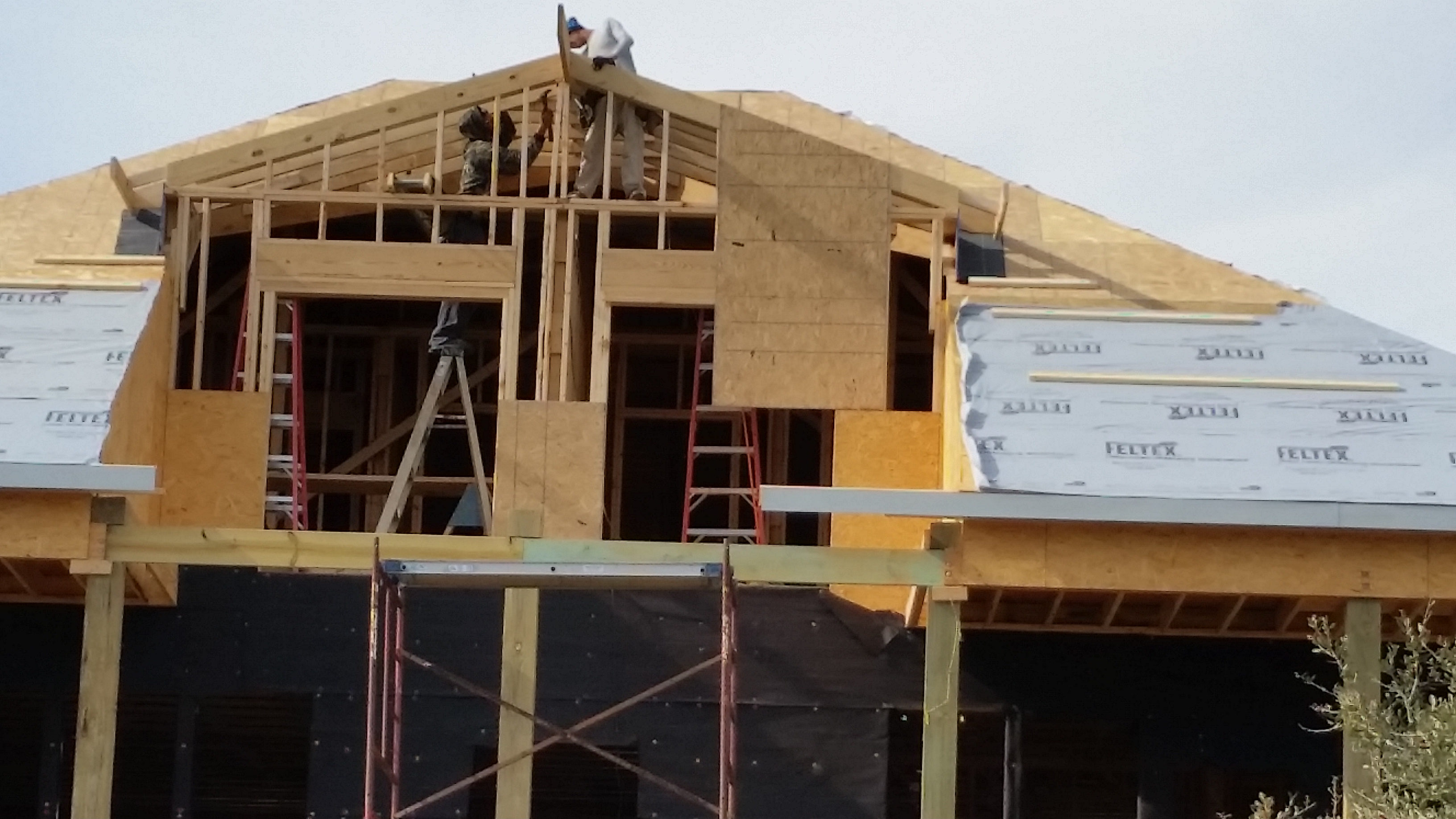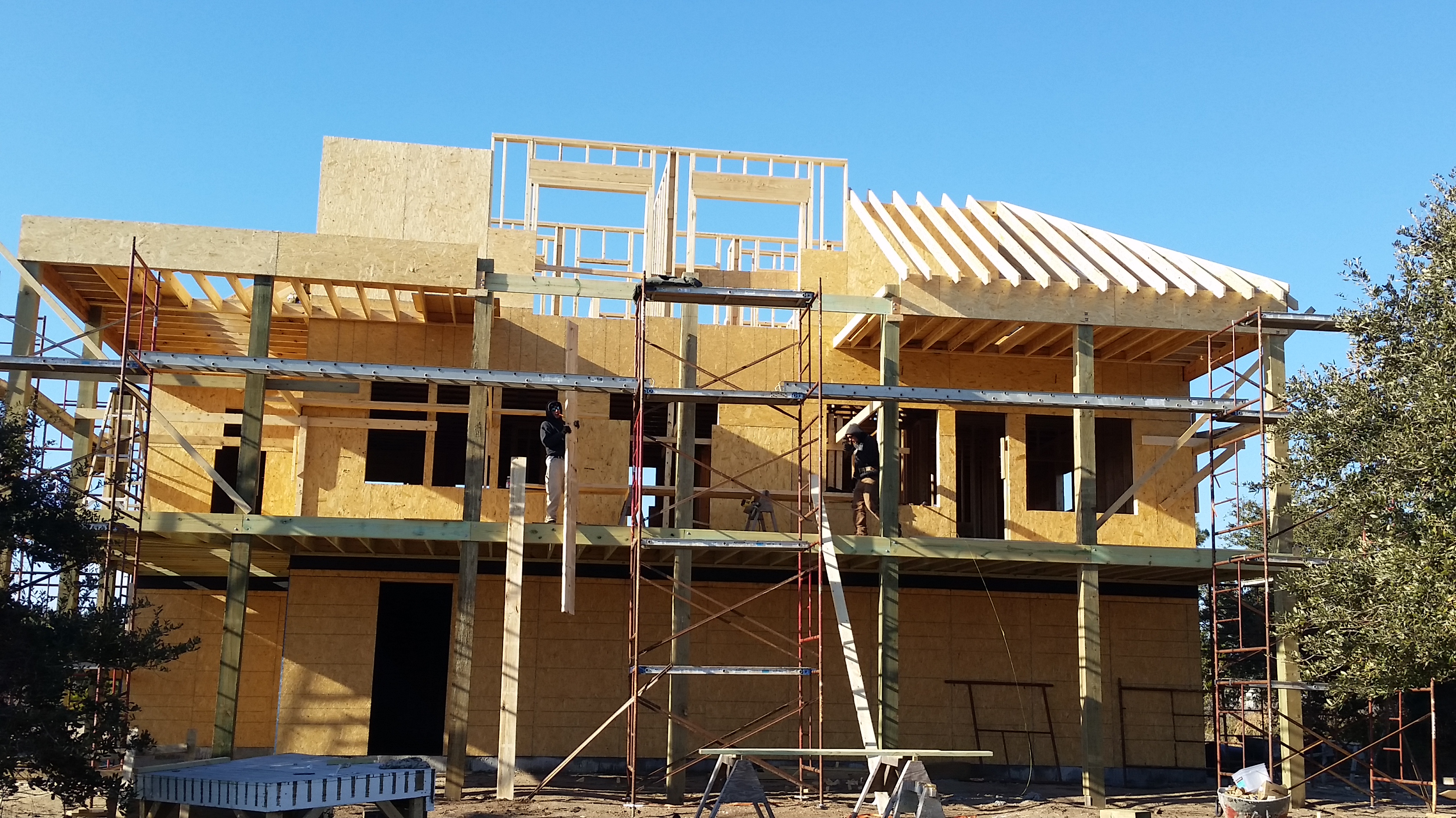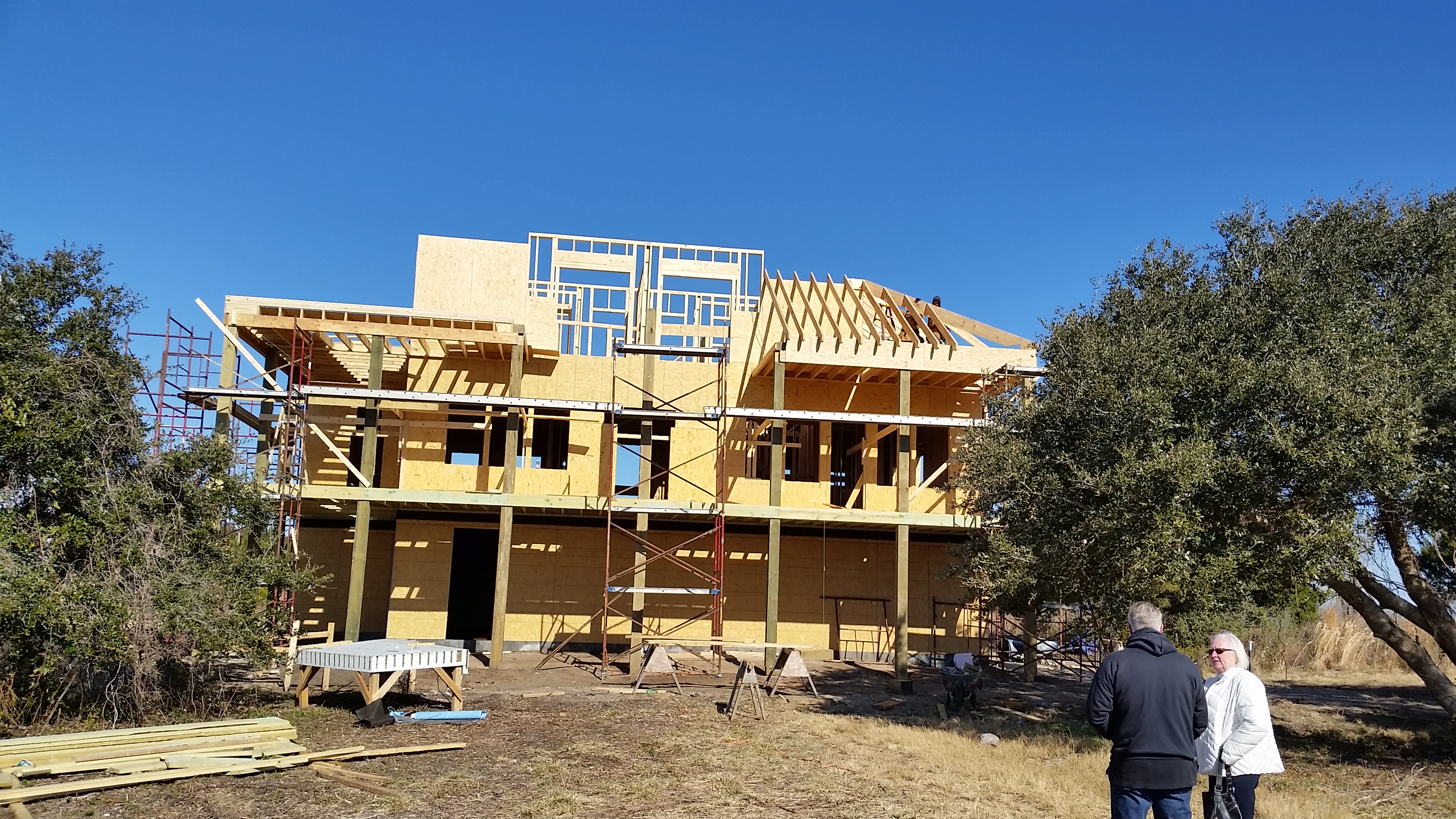 We've been meeting with pool contractors at the building site and have been bothering the work crew much more than we should. At mid-week, on 12 Feb, with the wind blowing at least 25 MPH, the framing crew was hanging doubled-up LVL beams on the porch posts which will support the roof. Kneewalls and interior walls are in place on the third floor and the "exterior" kneewalls (those separating the living space from the under-eaves storage spaces) are sheathed. There was a common rafter template already cut and with good weather, stick framing the roof could start next week.