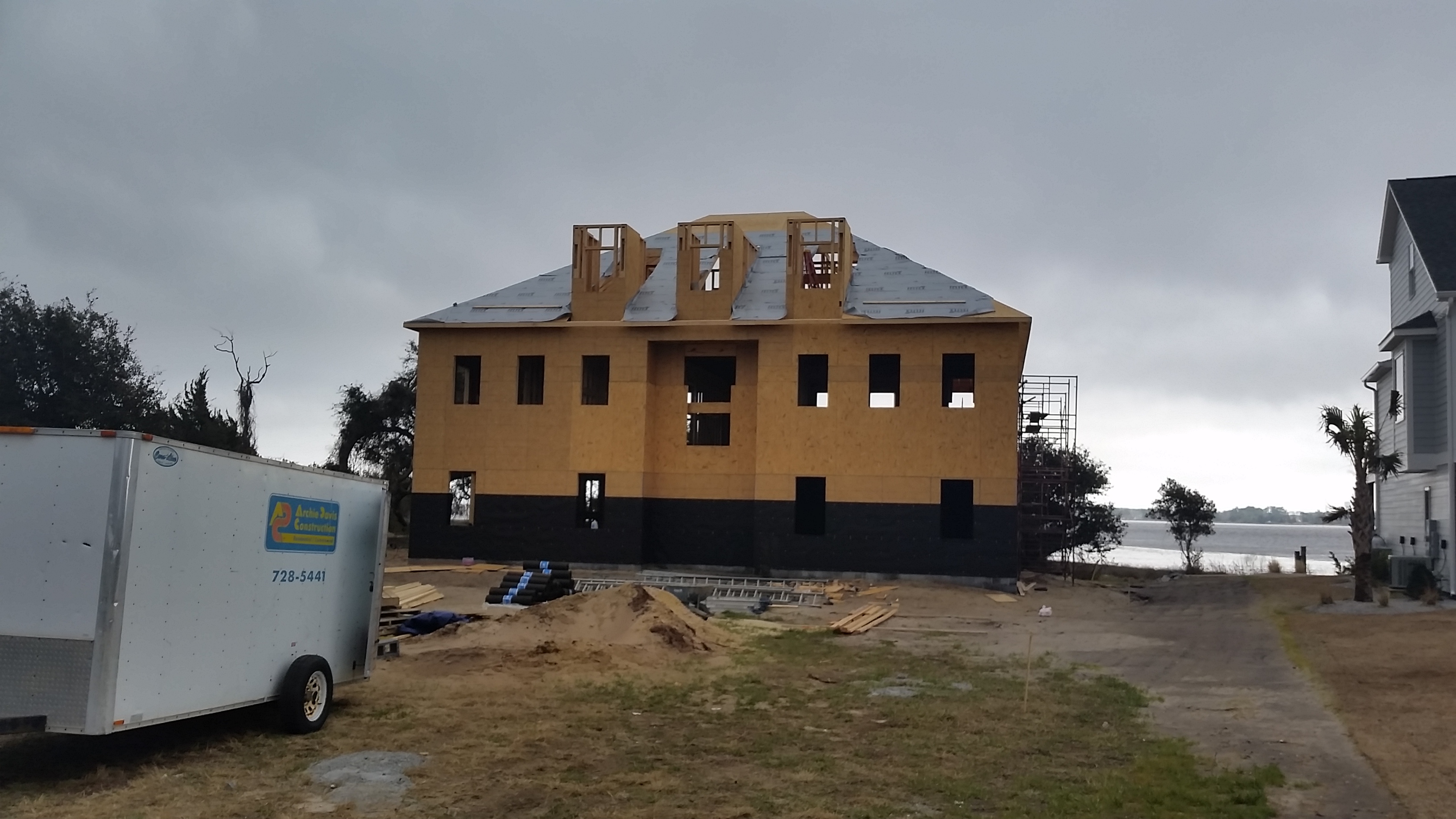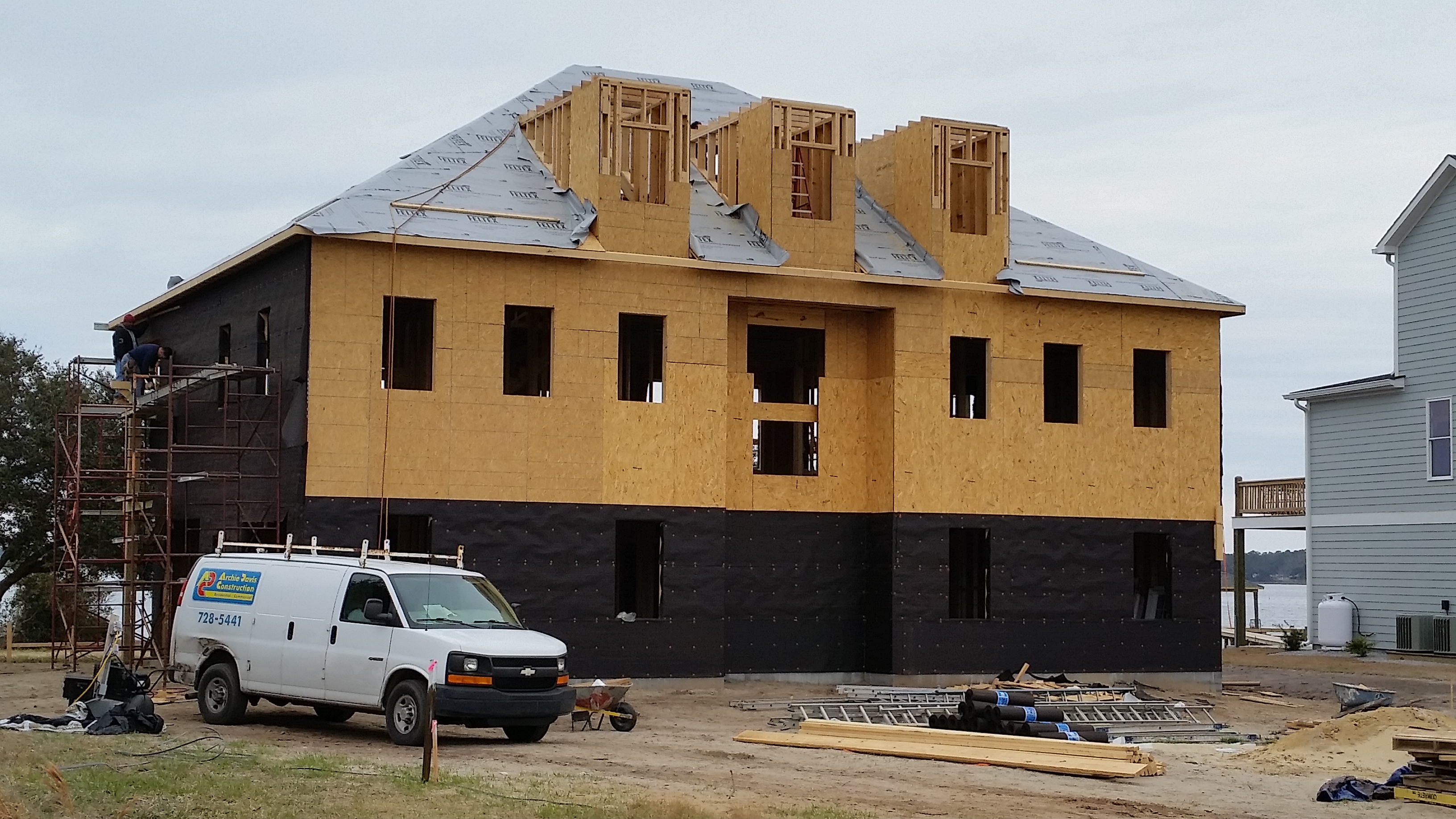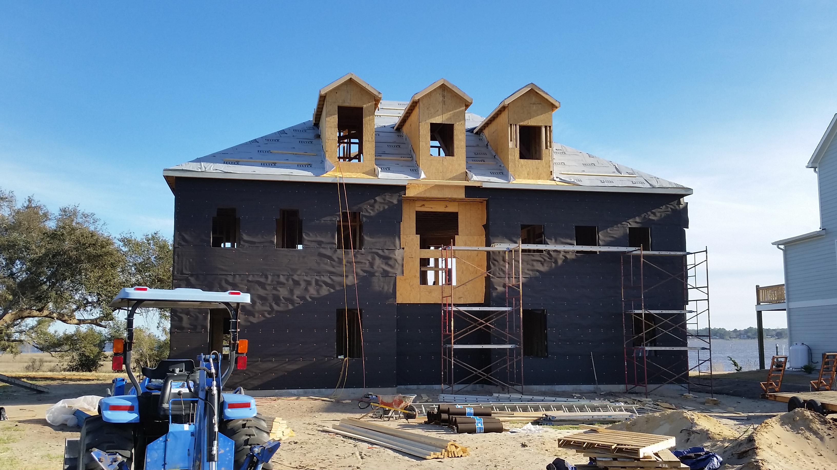 Monday afternoon, 9 March, on the way back from Jacksonville, NC, we were delighted to find a full crew, mild weather, more OSB sheathing and paper on the roof and most of the builder's felt applied to the exterior walls. The Andersen doors had arrived and were stacked in the garage with the windows. Framing and sheathing the dormers and the rest of the roof is queued-up for tomorrow.