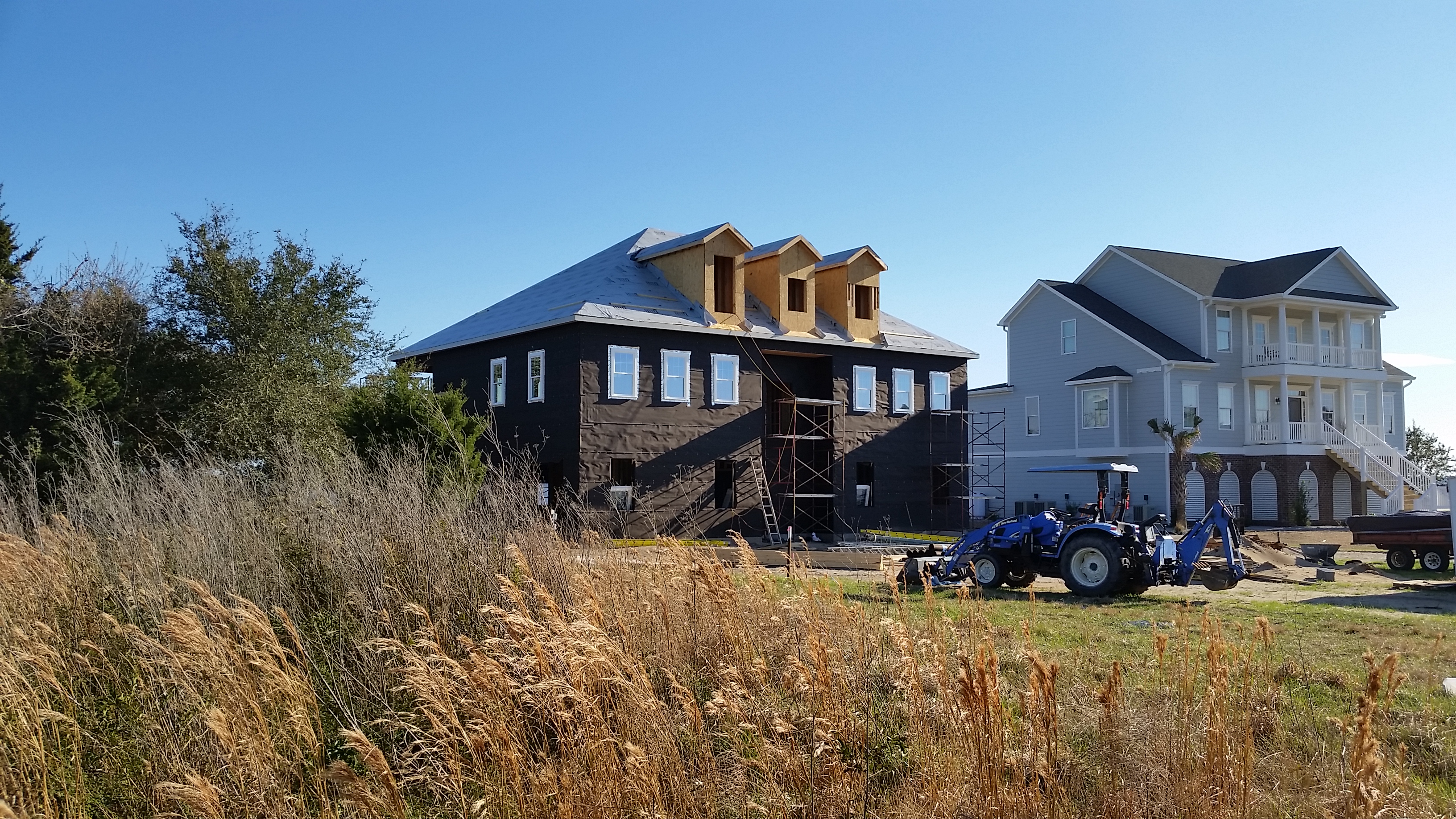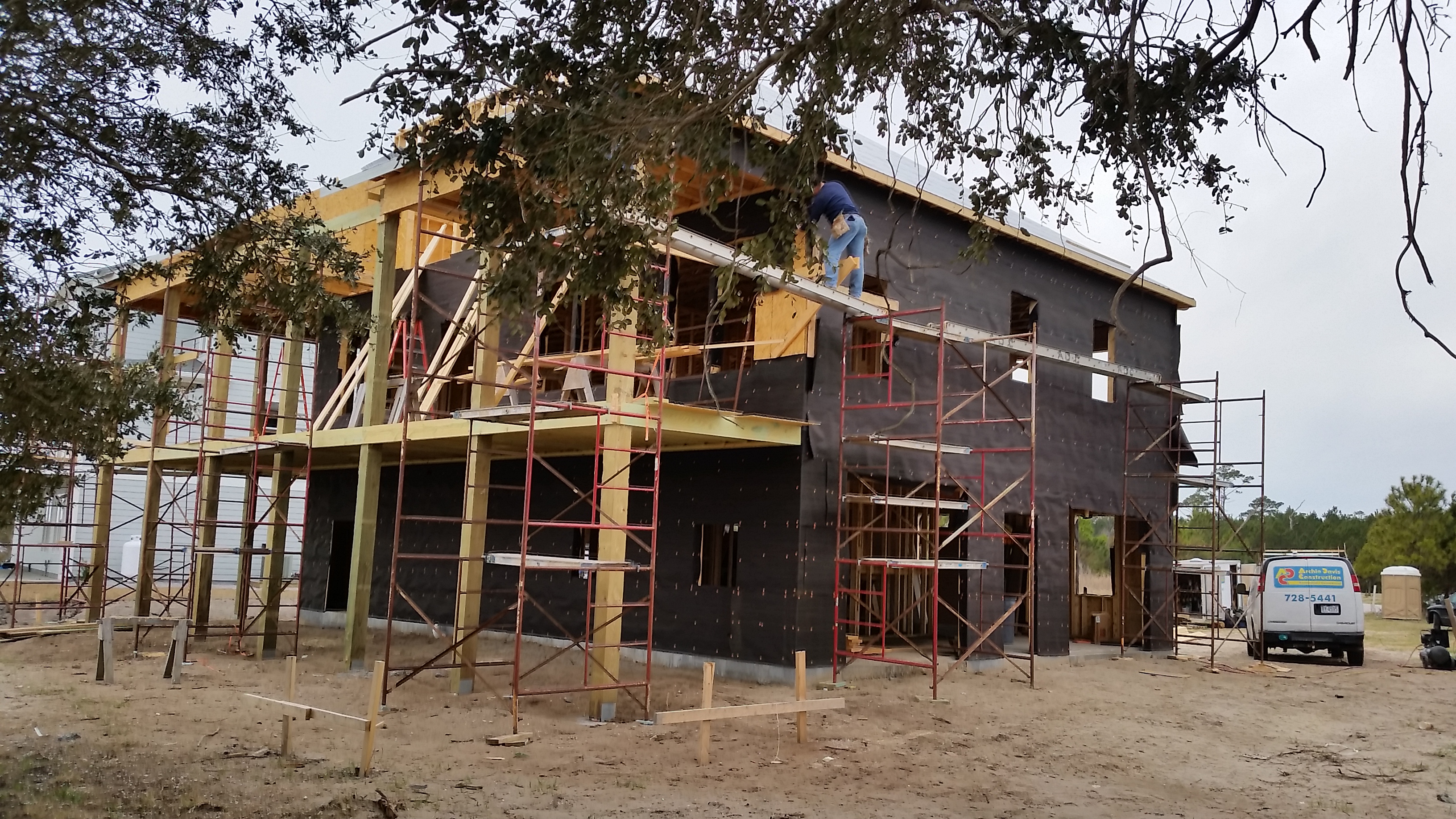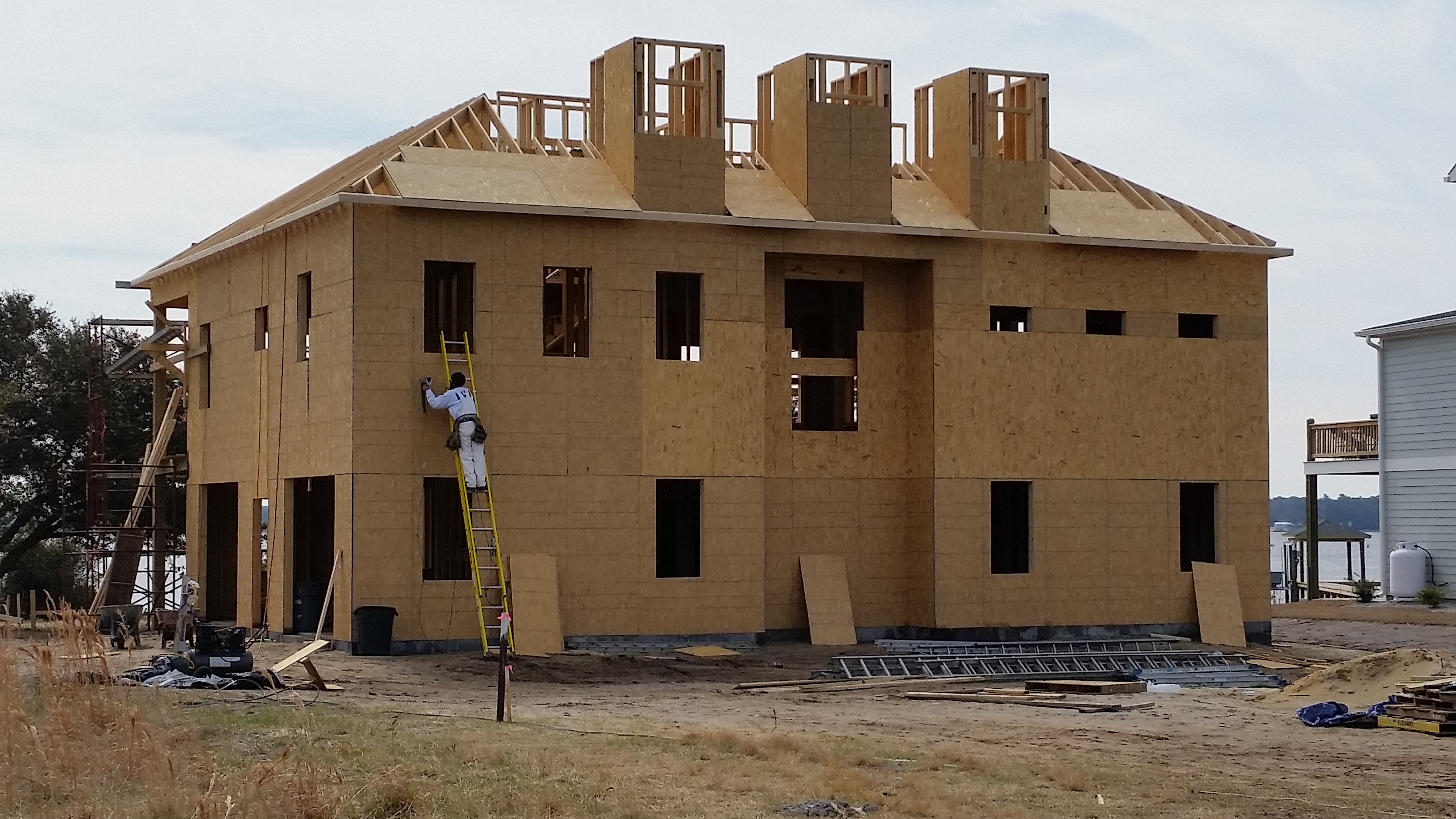 Monday afternoon, 9 March, on the way back from Jacksonville, NC, we were delighted to find a full crew, mild weather, more OSB sheathing and paper on the roof and most of the builder's felt applied to the exterior walls. The Andersen doors had arrived and were stacked in the garage with the windows. Framing and sheathing the dormers and the rest of the roof is queued-up for tomorrow.