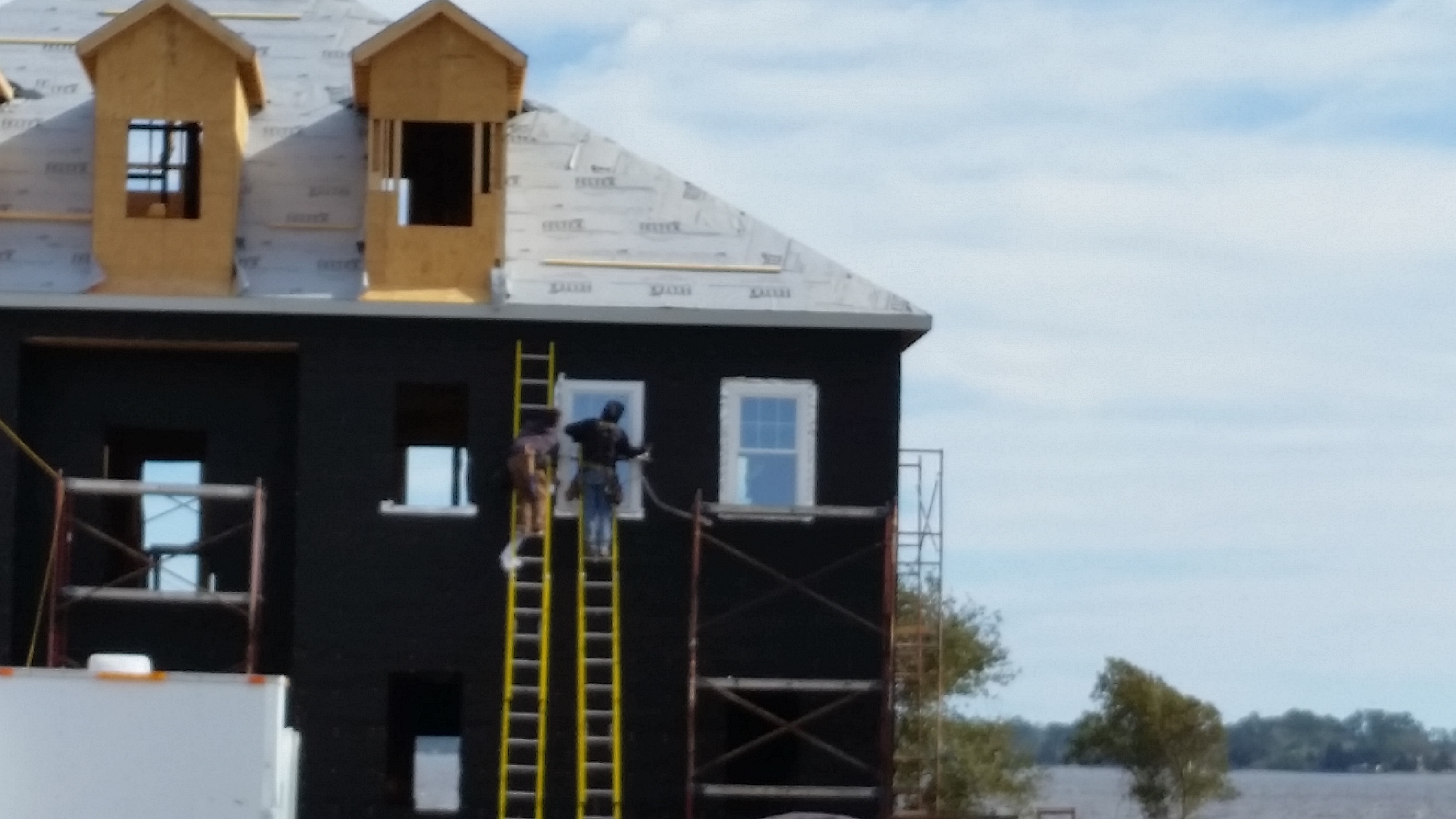 Windows! Hurray! Monday, 16 March, we now have three windows in the kitchen. The next day it had increased to six windows on the front, two on the east side, four more on the water-side and a french door with transom light. The water-side porch on the the third floor was framed-out to the exterior wall with only the gallery framing remaining. The main roof framing is now complete. Mid-day on Tuesday we met with the roofing contractor who measured the roof and will provide an estimate for both a shingle and metal roof. Late on Tuesday we met with the plumber and have scheduled a meeting with the electrician for Monday. We also got an estimate for a dock which we'll add to those being evaluated.