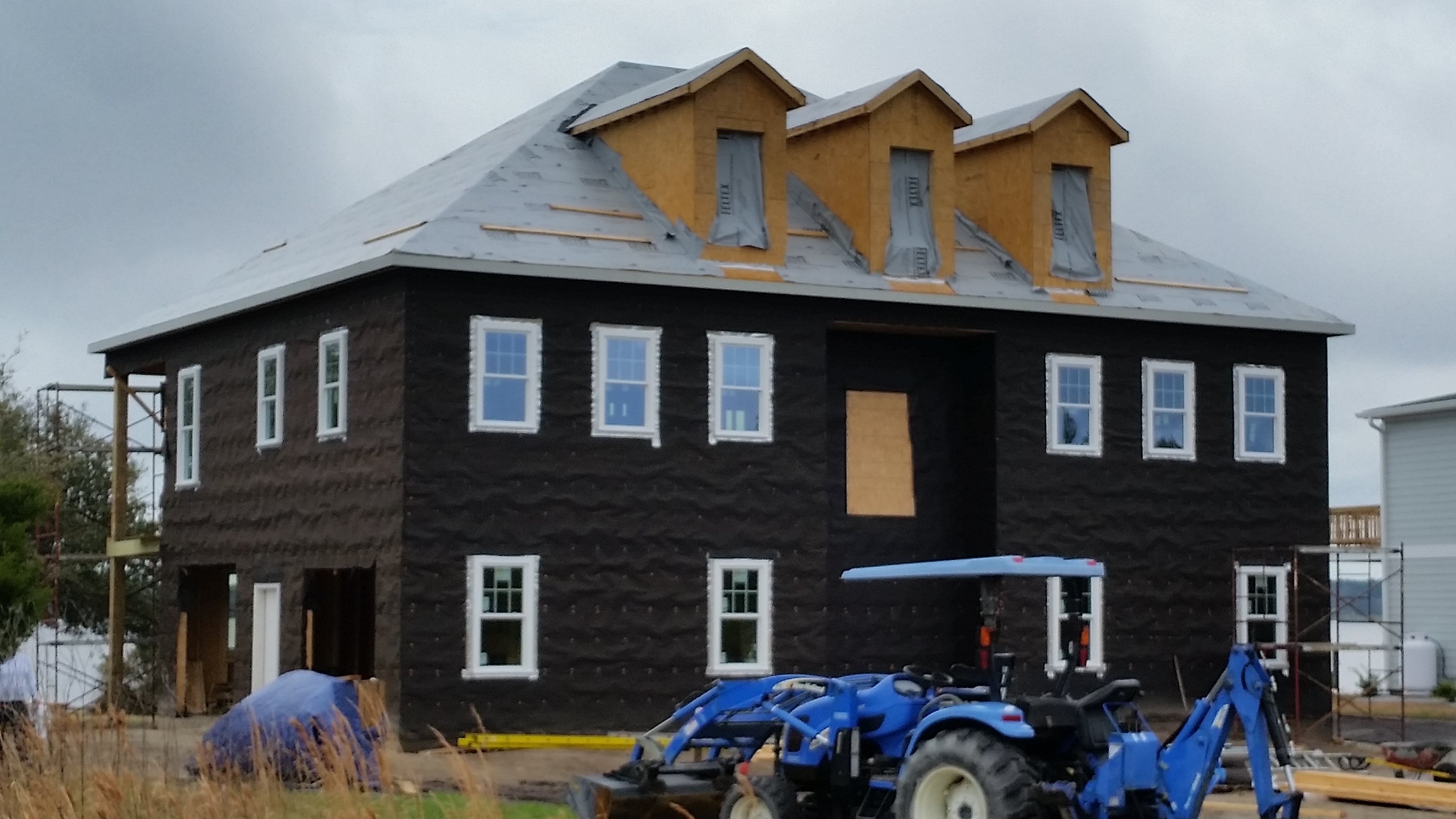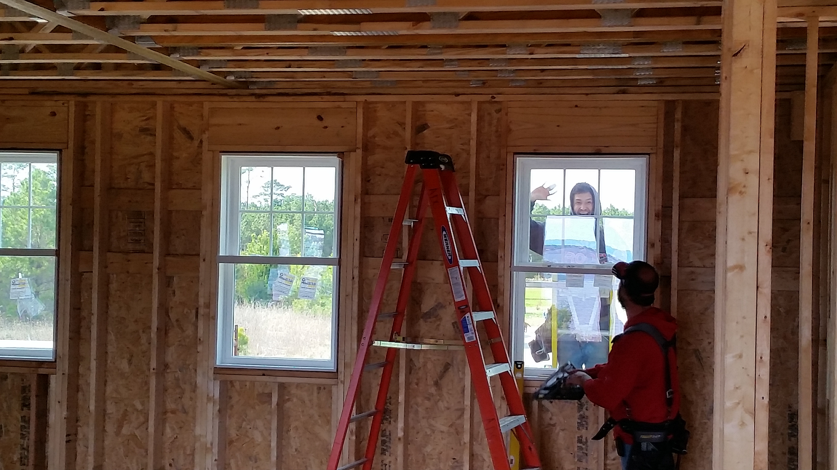 Front of house; opening windows and finishing the nailing on the OSB sheathing