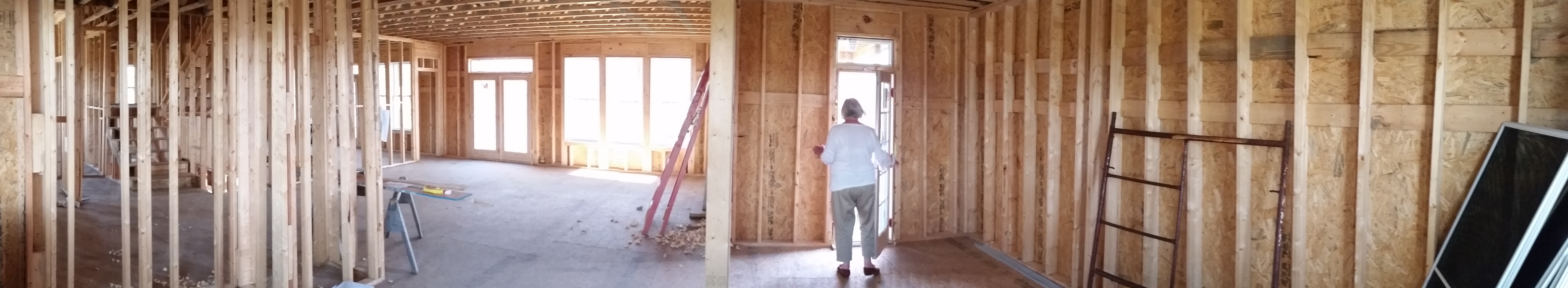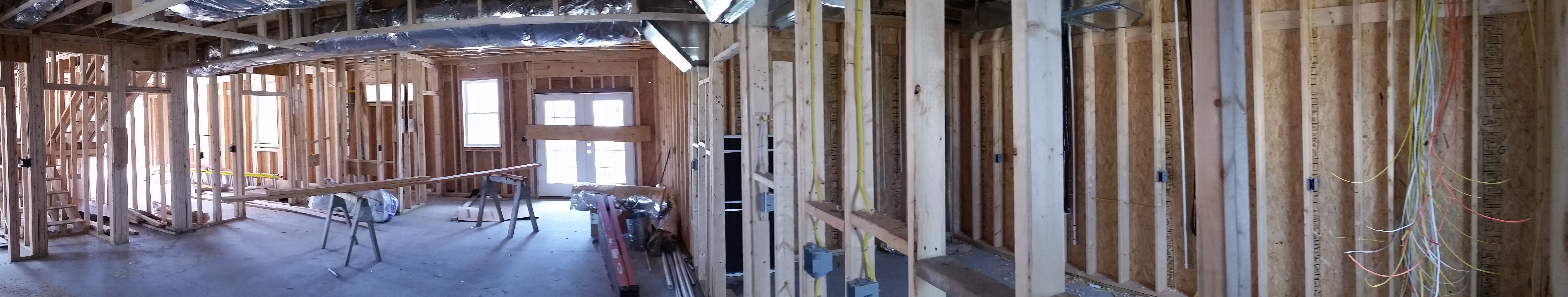 With a relaxed start on Good Friday (well, we can loll about, so we did), we arrived at the lot on a sunny and blustery (sustained 20 MPH, at least) early afternoon to find the french door in place on the ground floor and a good start on the Nichiboard cement siding as shown in the photos. The HVAC mechanics had installed all the lines to connect the ODUs with the IDUs along with even more ductwork. We noticed a pressure gauge on the plumbing supply lines so the basic plumbing rough-in may be near completion. They had installed waste lines and roof vents earlier in the week. The panorama view of the ground floor is from the NW corner of a proposed work shop area panning to the east. Looking through the wall of the utility room-to-be, you can see the Romex cable where the service panel will be located. This room also will house an IDU for the main living area on the 1st floor. The ground floor is "unconditioned."