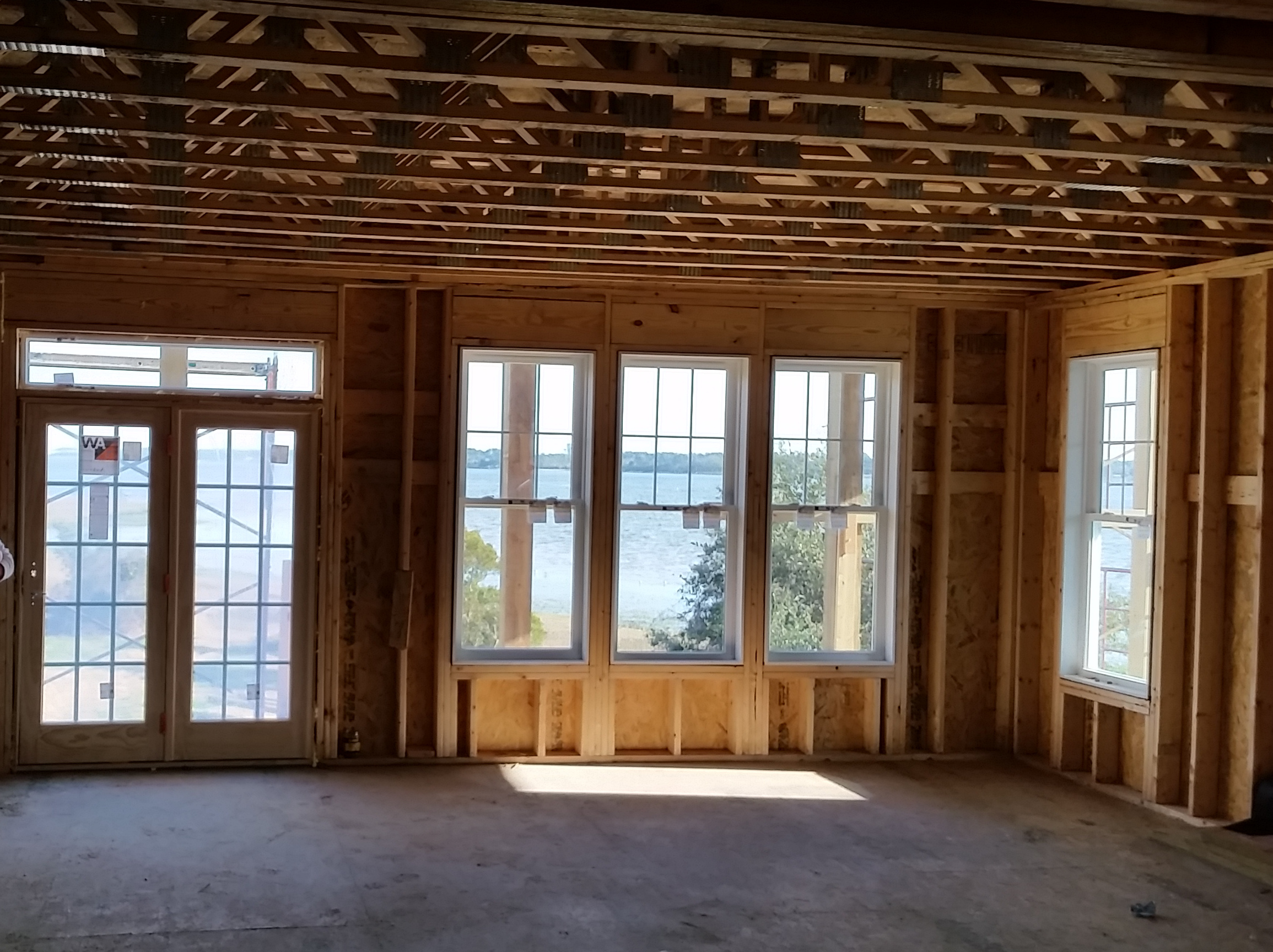 After a trip to Oriental, we visited the house site for a few minutes late afternoon of Saturday, 21 March. These photos show the interior framing of the main floor with the windows and doors installed. On the first photo, Martha is looking out the door from the pantry/laundry room to the porch. Eventually, there will be an intervening refrigerator and wall of the pantry/laundry room. The wood shavings are from drilling holes for pipes. We'll get some photos of the third floor when there is a bit more light with the windows and doors installed.