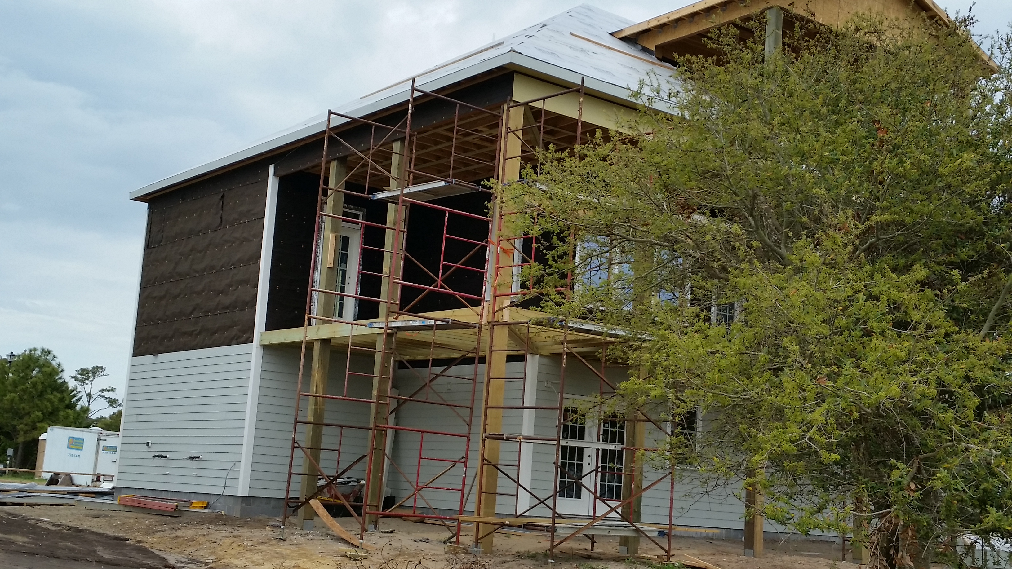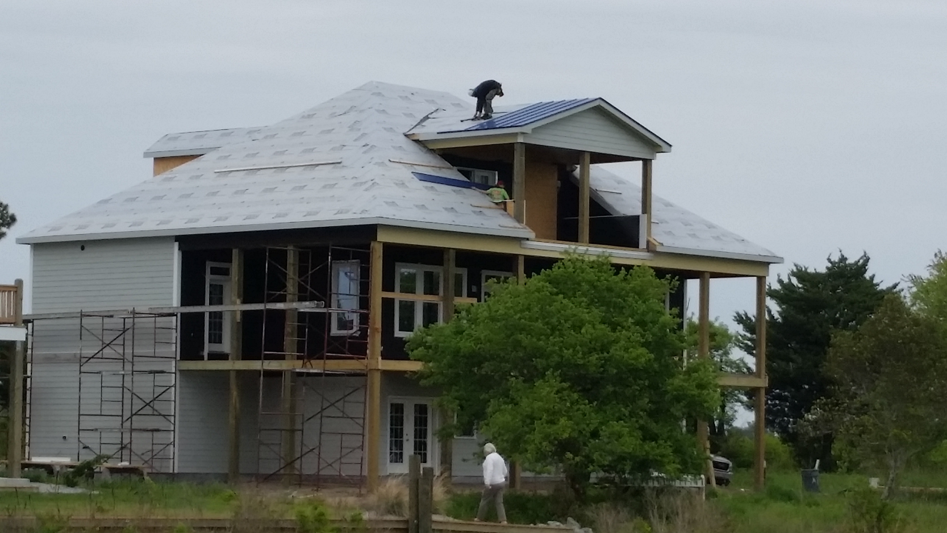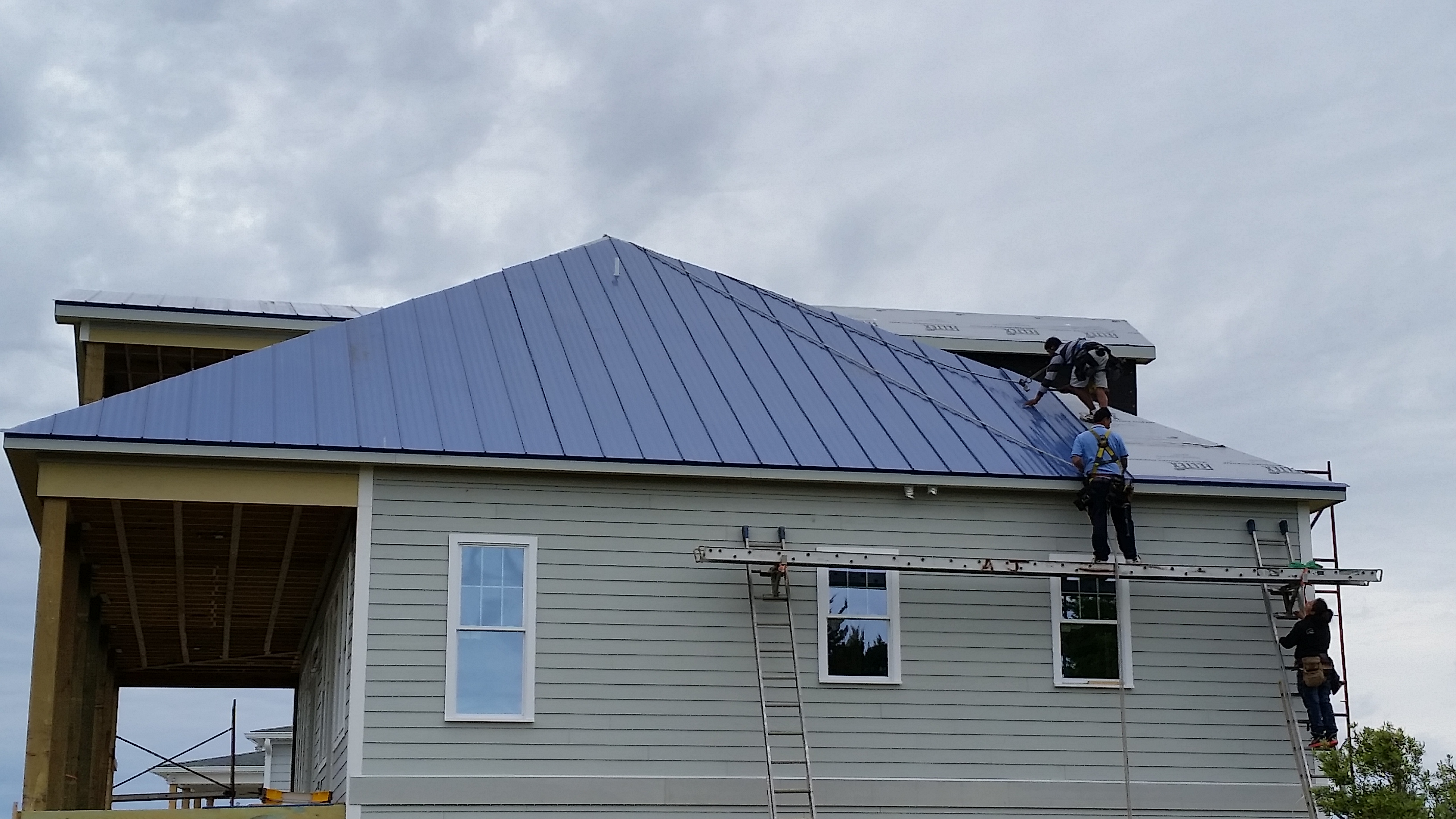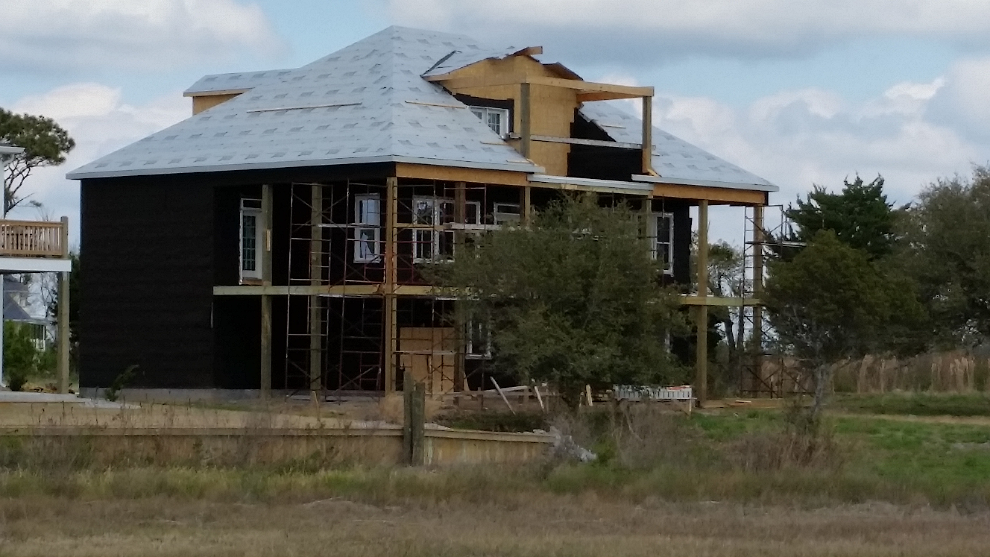 Archie Davis, the builder, already has ordered the Nichia siding and will start installation as soon as it arrives. We decided to install a 26 gauge GulfLok metal roof produced by Gulf Coast Supply. We like the darker blue colors which will look great with the planned light yellow siding and white trim. It looks as if the roof itself will be installed on purlins with a reflective barrier covering the FelTex synthetic underlayment already in place on the roof. We're now considering applying closed cell polyurethane foam to the underside of the roof surface which would enable us to dispense with soffet ventilation while maintaining attic and undereaves temperatures at reasonable levels, hopefully around 80-90° Farenheit. Exterior walls including knee walls on the third floor would be insulated with a combination of polyurethane foam and fiberglass batts to around R-19 or R-20 so the load on the heat pumps should not be excessive.