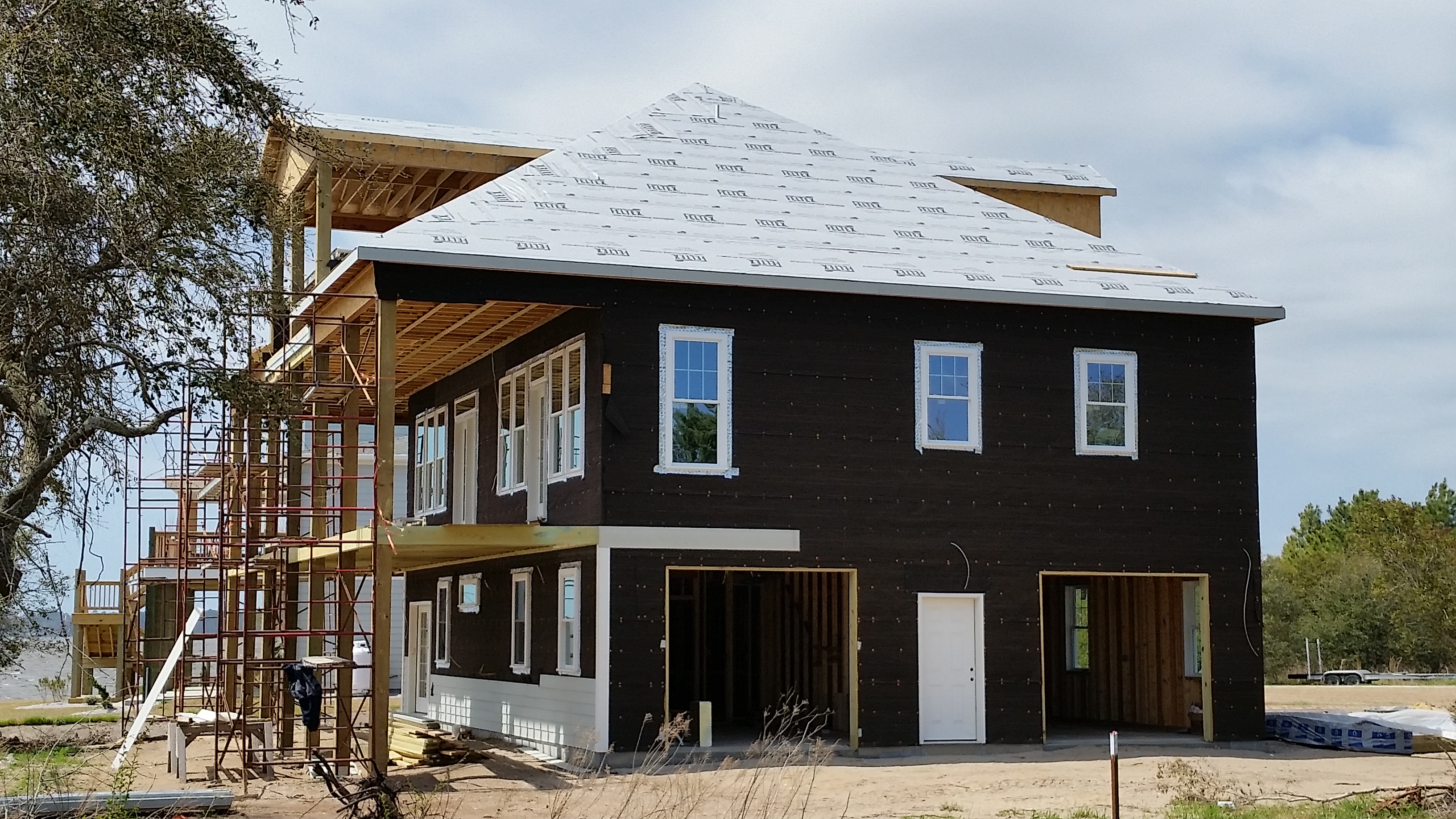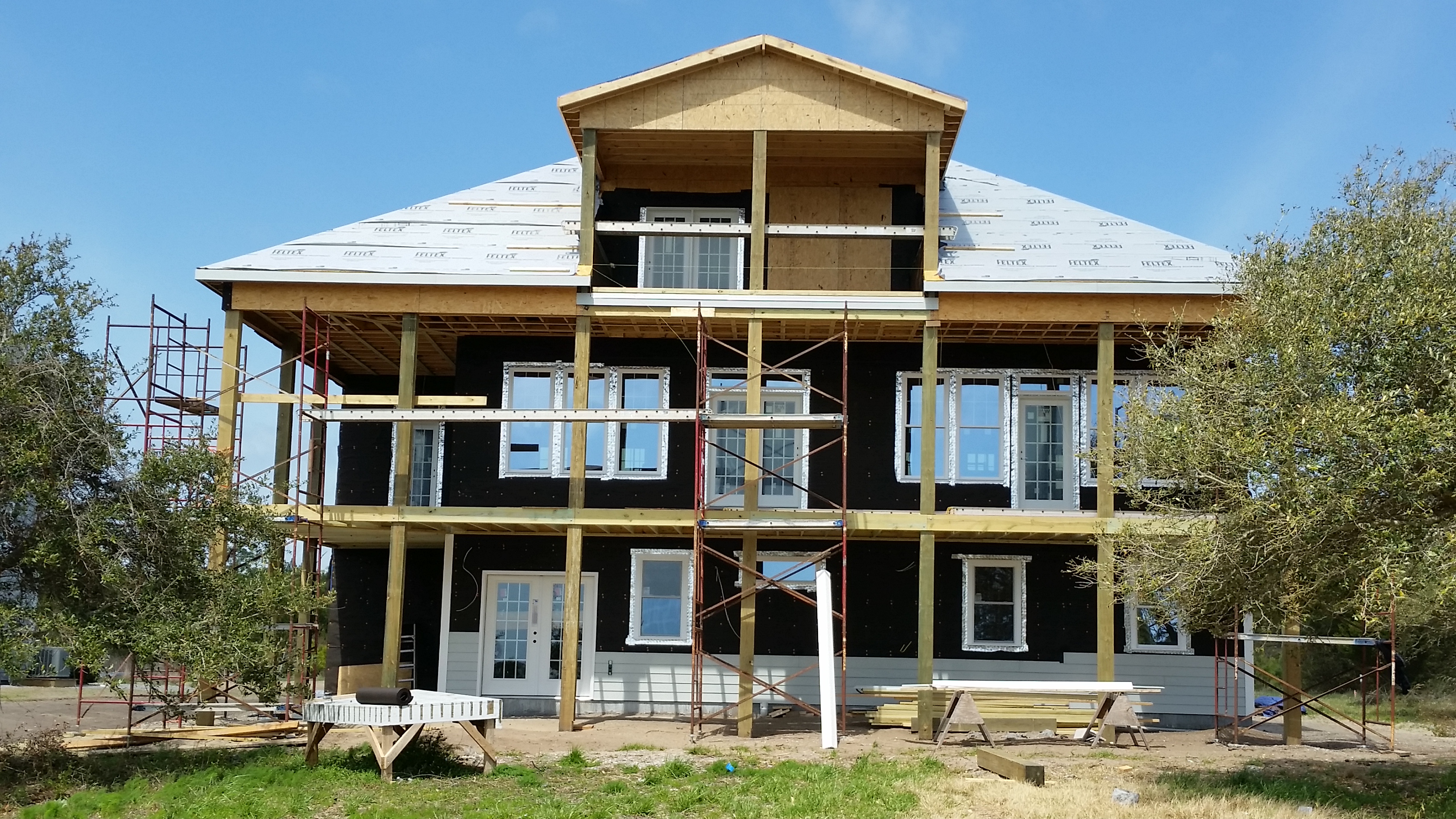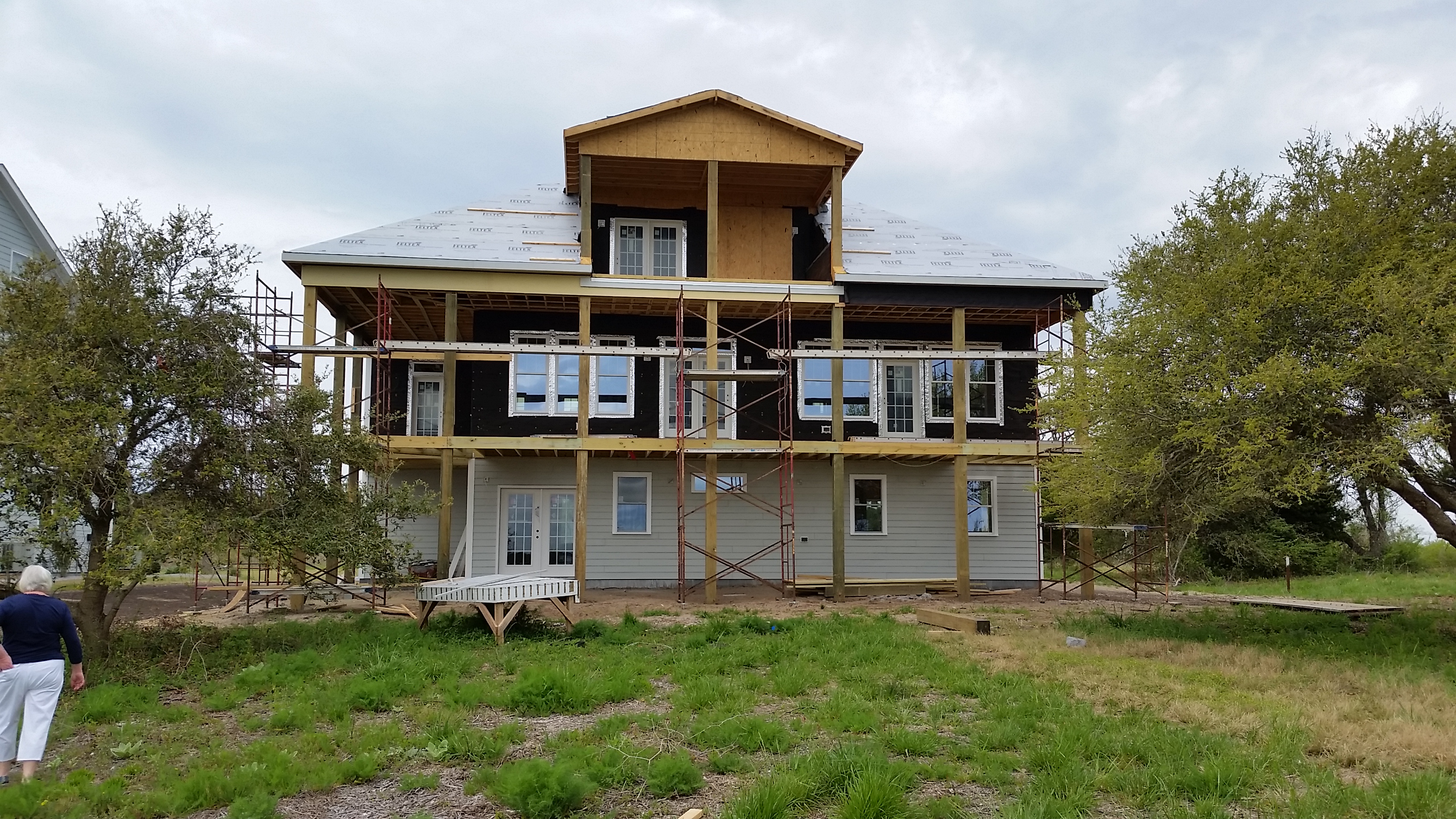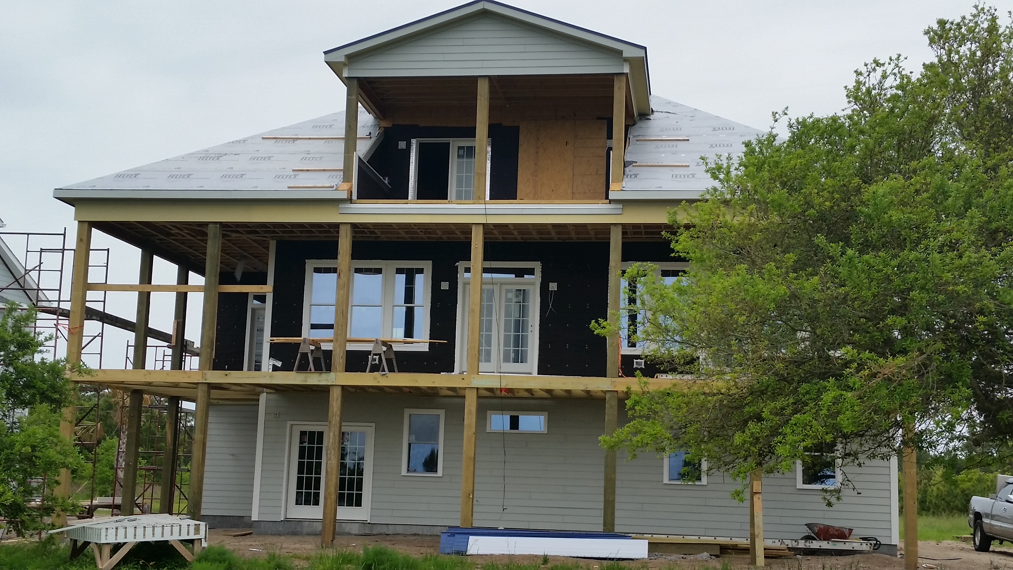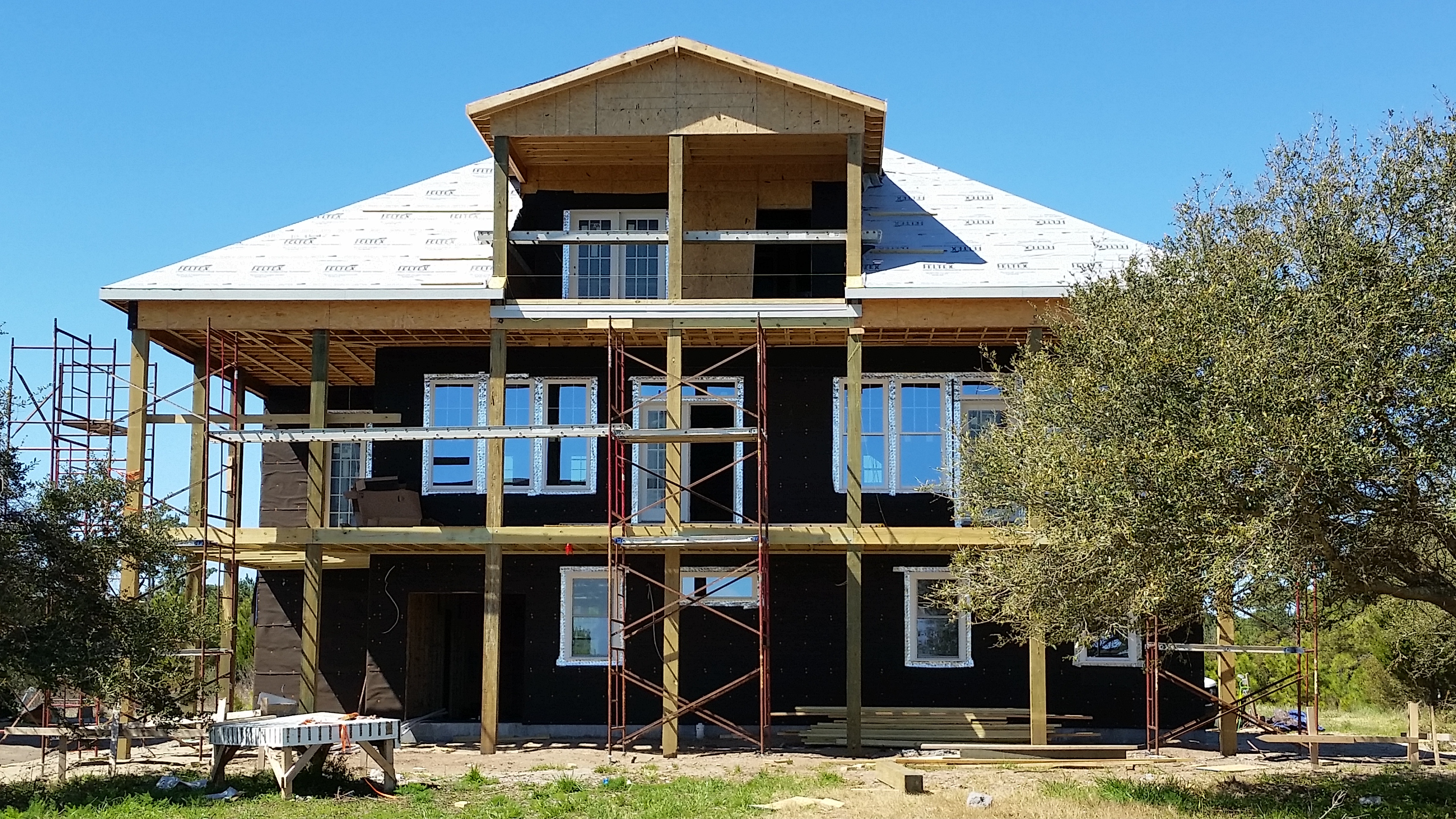 Saturday morning, 28 March, a couple of rain showers, heavy wind and some more cold weather is moving through. There are a few more windows and doors to install, but all of the electric, plumbing and HVAC rough-in work is well underway. The membrane on the 3rd FL porch is in place along with the LVL beams and 8 x 8 posts. The porch roof should go up on Monday with the deck and another french door to follow soon after.
