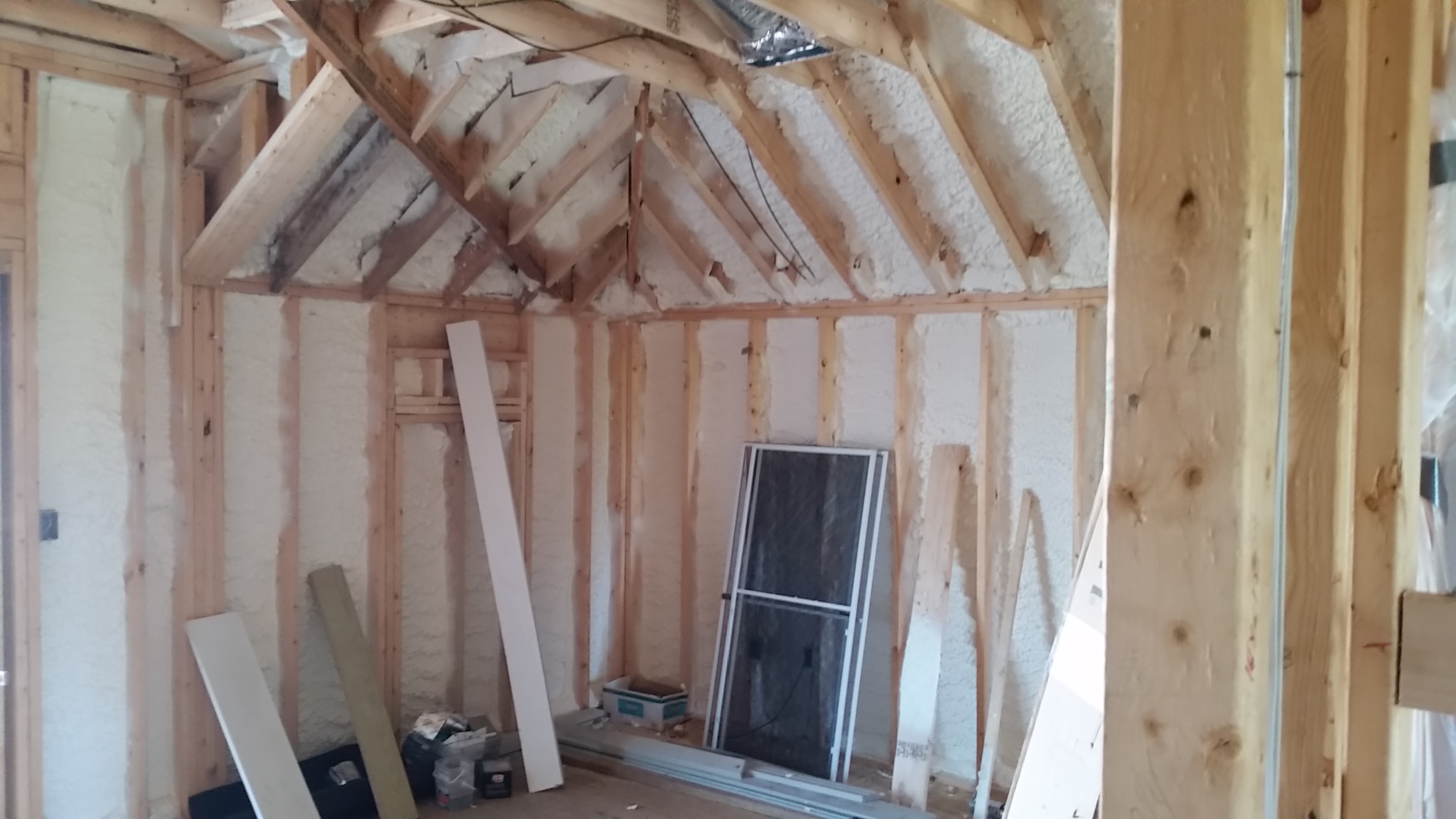 Monday and Tuesday, 20-21 May have been windy, but the roofers are scheduled to start tomorrow, 22 May. Archie's crew is now focused on siding and the team from Timco finished up the spray polyurethane foam insulation on the outside walls of the living area and the underside of the roof sheathing over that living area. Porches are unconditioned and uninsulated. Timco will install fiberglass batts to complete the insulation later this week. That should go pretty quickly. We think the panorama from the 3rd floor porch is fabulous.