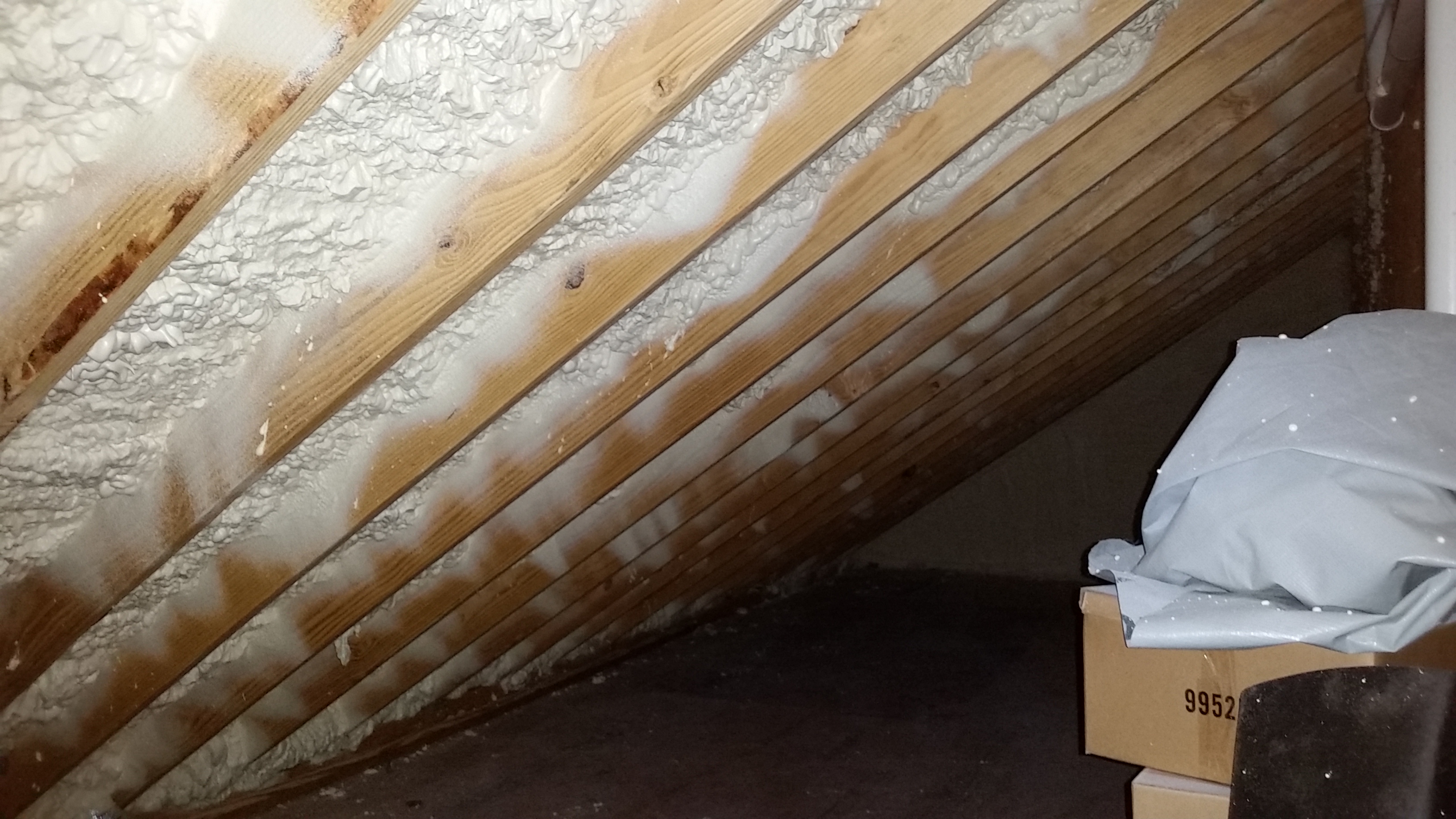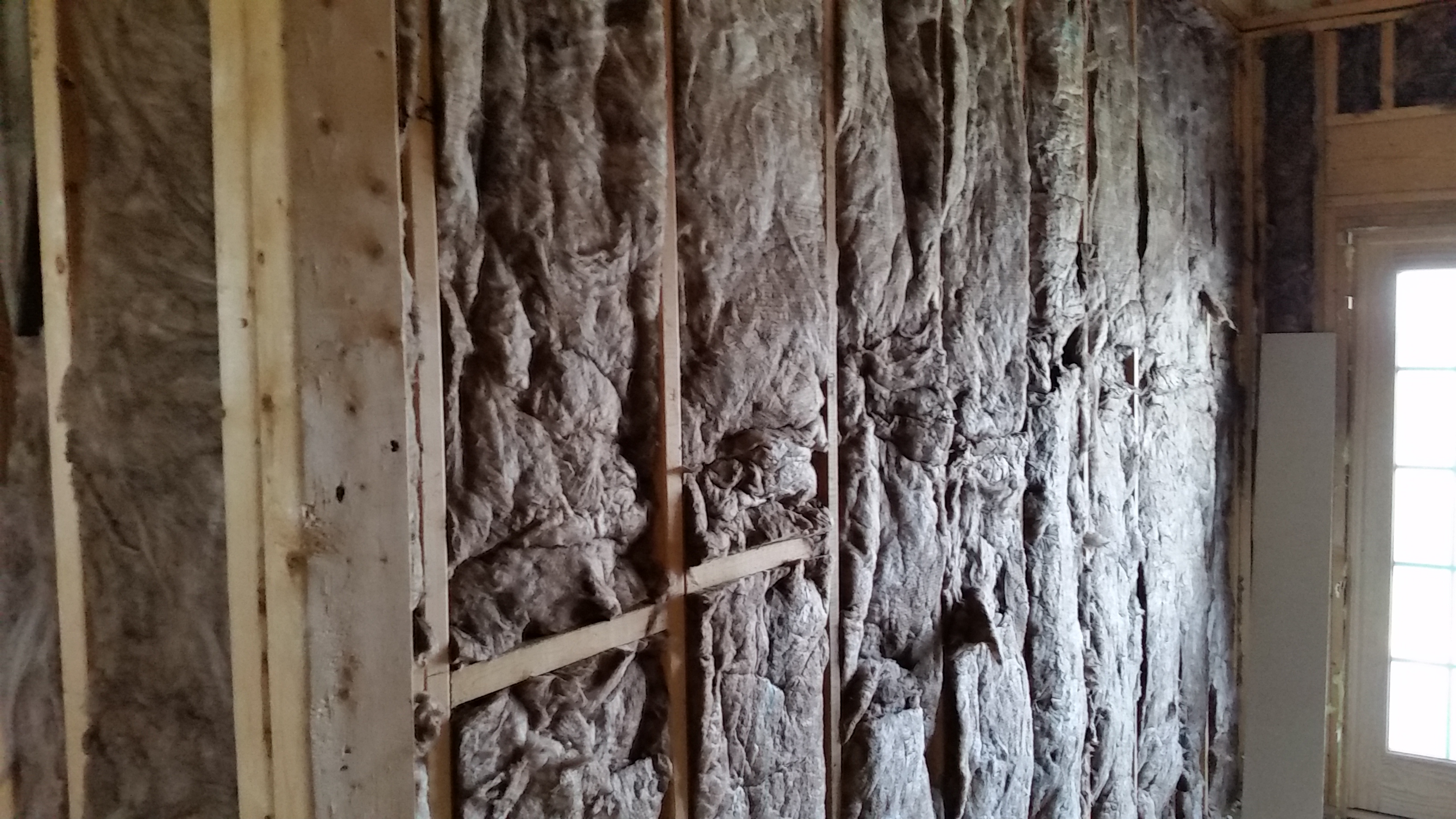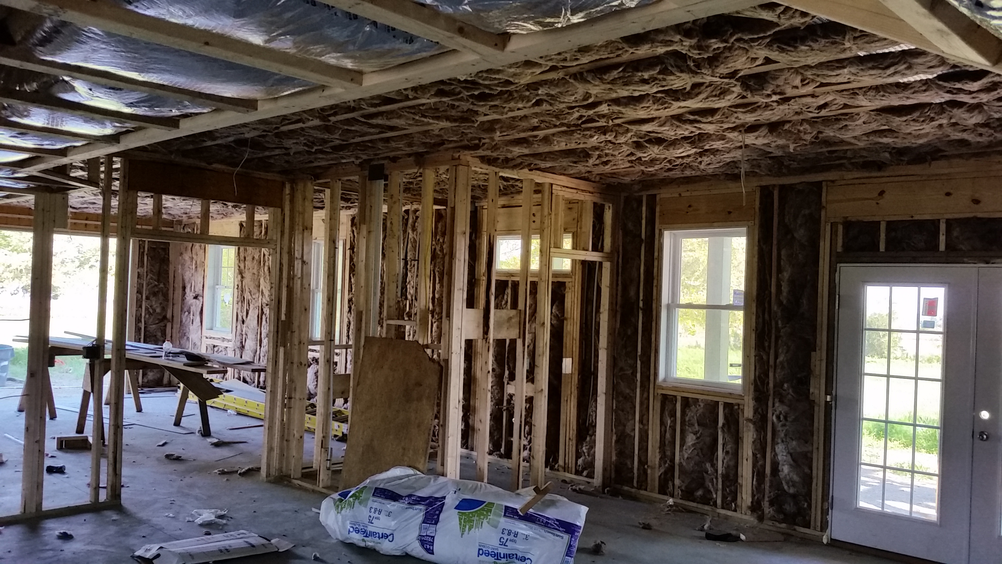 What a difference a day made in the siding. Roofing is delayed another day, but most of the fiberglass batts are installed.