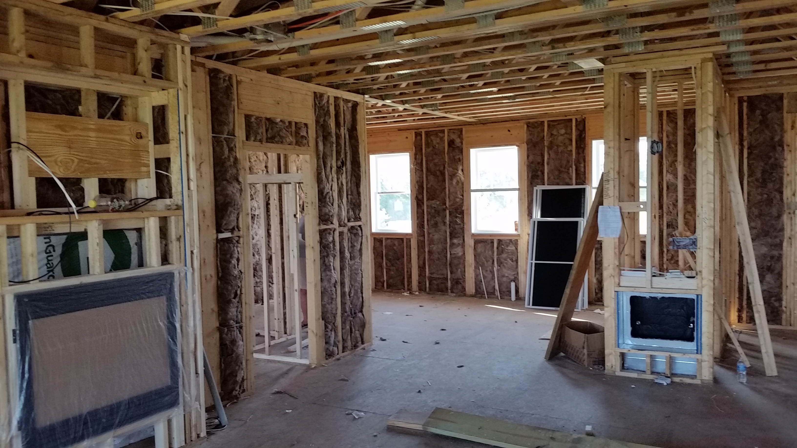 By the second week of April, Archie's team had installed siding on the west- and water-sides of the ground floor and was cleaning-up construction debris inside in preparation for electrical and plumbing inspections next week. We plan to have a walk-through early in the week to make sure there are enough electrical lights and fixtures and that they are installed where (we think) we want them. P.T Jones has been doing a great job on this and Mike has been very helpful, guiding us through the different options. By the end of the week, Mike had installed two service panels on the ground floor. Deck flooring and all of the siding and trim is onsite with roofing and perhaps even drywall expected within a week or 10 days. Installing insulation will have to be completed before the drywall goes up, of course, but Timco Insulation and Fireplaces delivered the unvented gas fireplace we selected and it is already installed in the framed opening in the living room awaiting plumbing for a gas line. We also sized a TV niche above the new fireplace and that is ready for cabinetry or drywall.