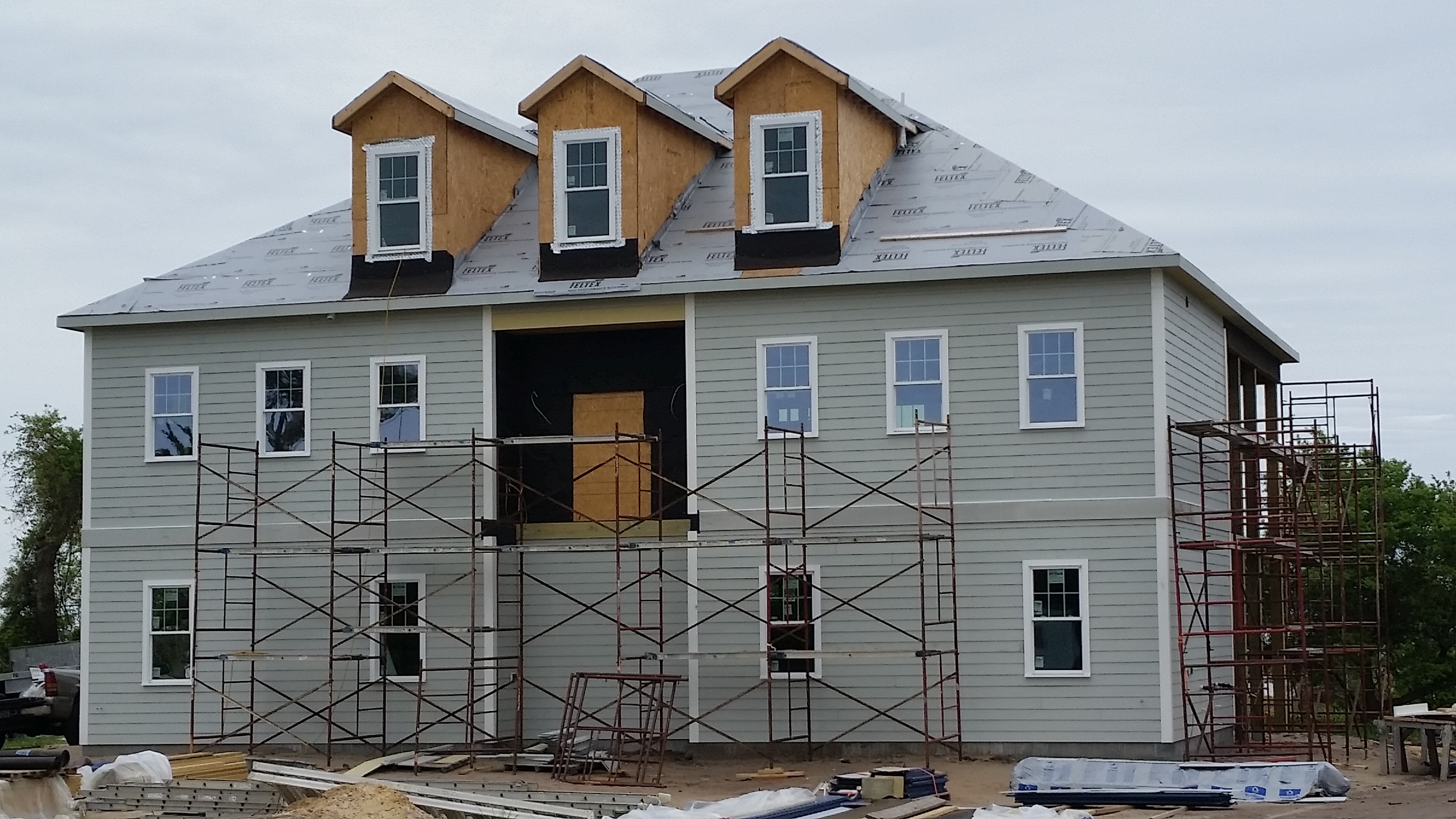 We stopped by the job site about mid-day on Saturday, 25 April to find one of the roofers working(with help from his girlfriend - that's dedication!). He was installing panels on the porch roof. Wind has been a real problem this week, but there is a real scheduling progression which has to be followed. For instance, roof flashing has to be installed by the roofing subcontractor before the siding on the dormers can be completed. And siding on the dormers has to be completed before roofing the front side to avoid accidentally damaging the roofing panels. The door on the 3rd FL porch and the casing for the custom front door also has to be installed before the siding as well. Archie and Ben, his foreman on the site, are doing a great job at keeping this intricate dance flowing smoothly in spite of poor weather and subcontractor scheduling complexities and idiosyncrasies.