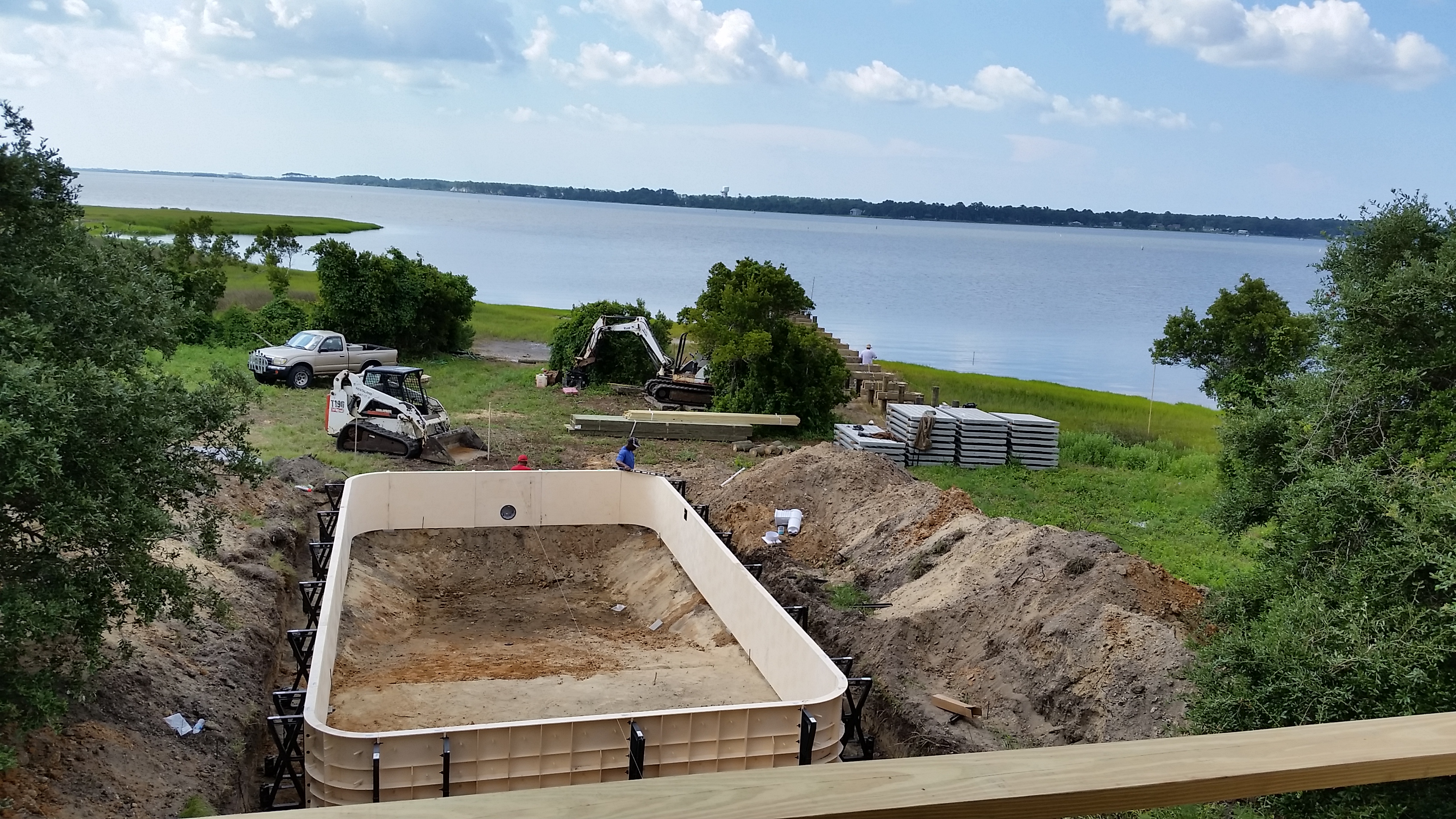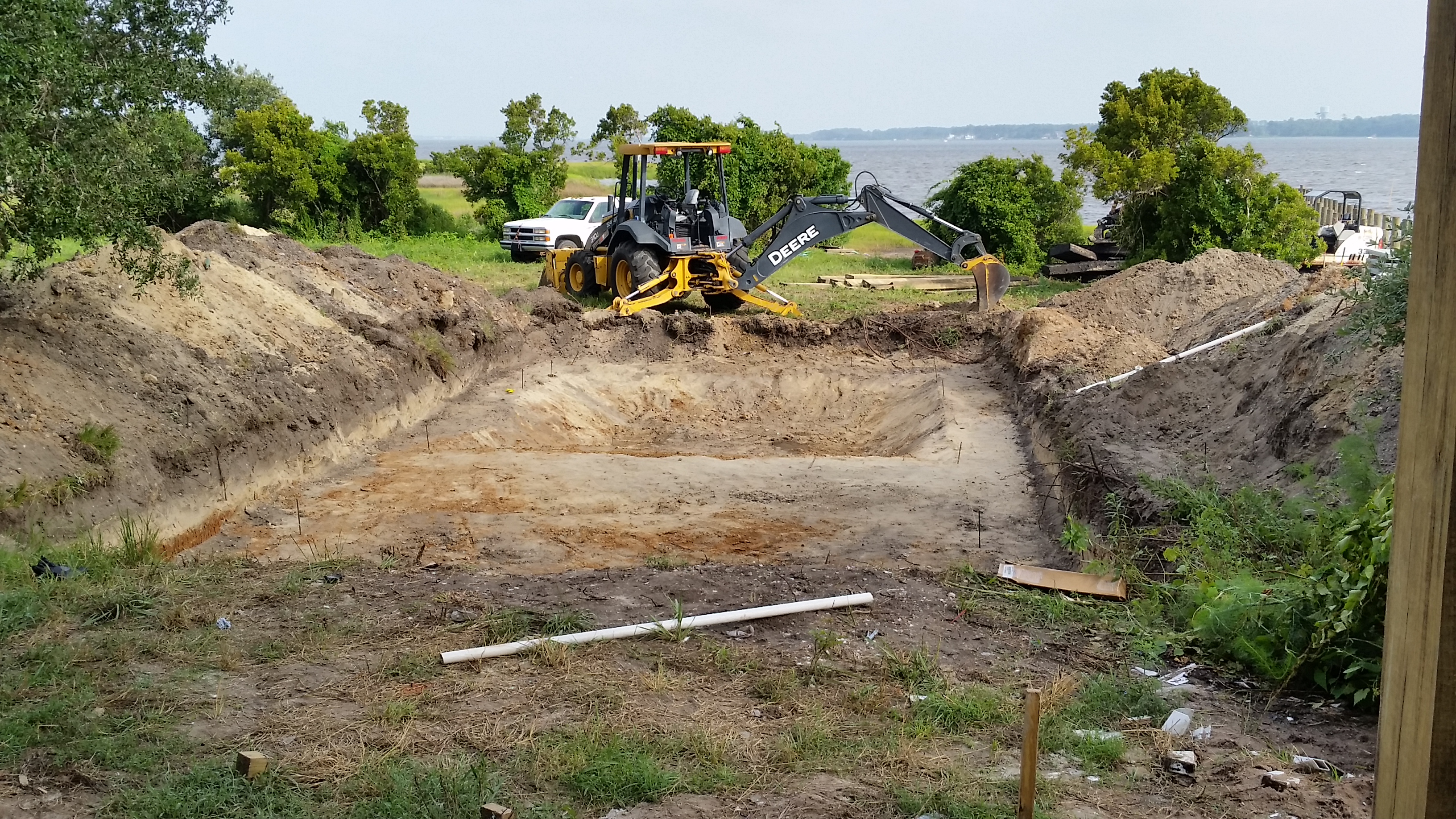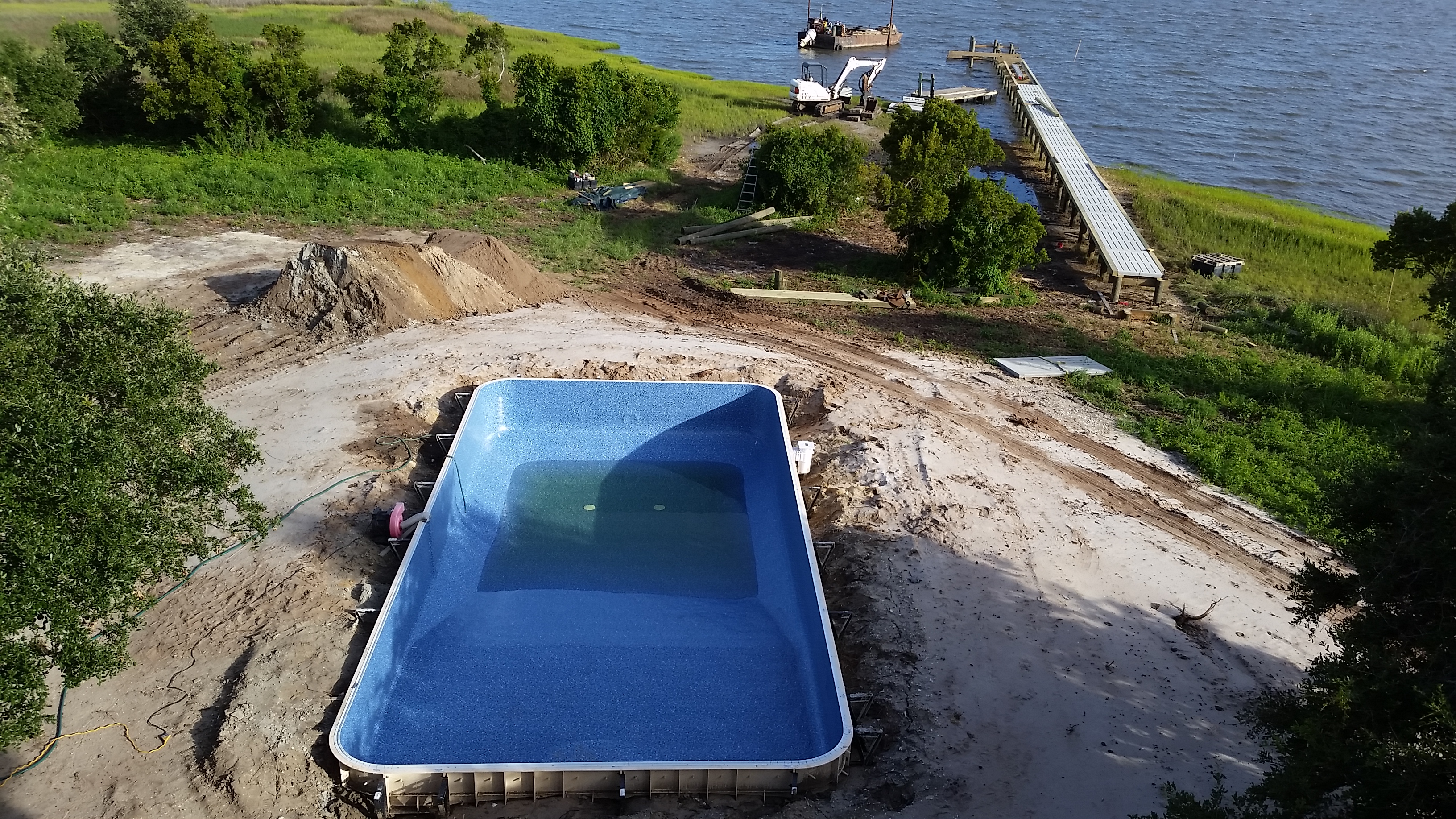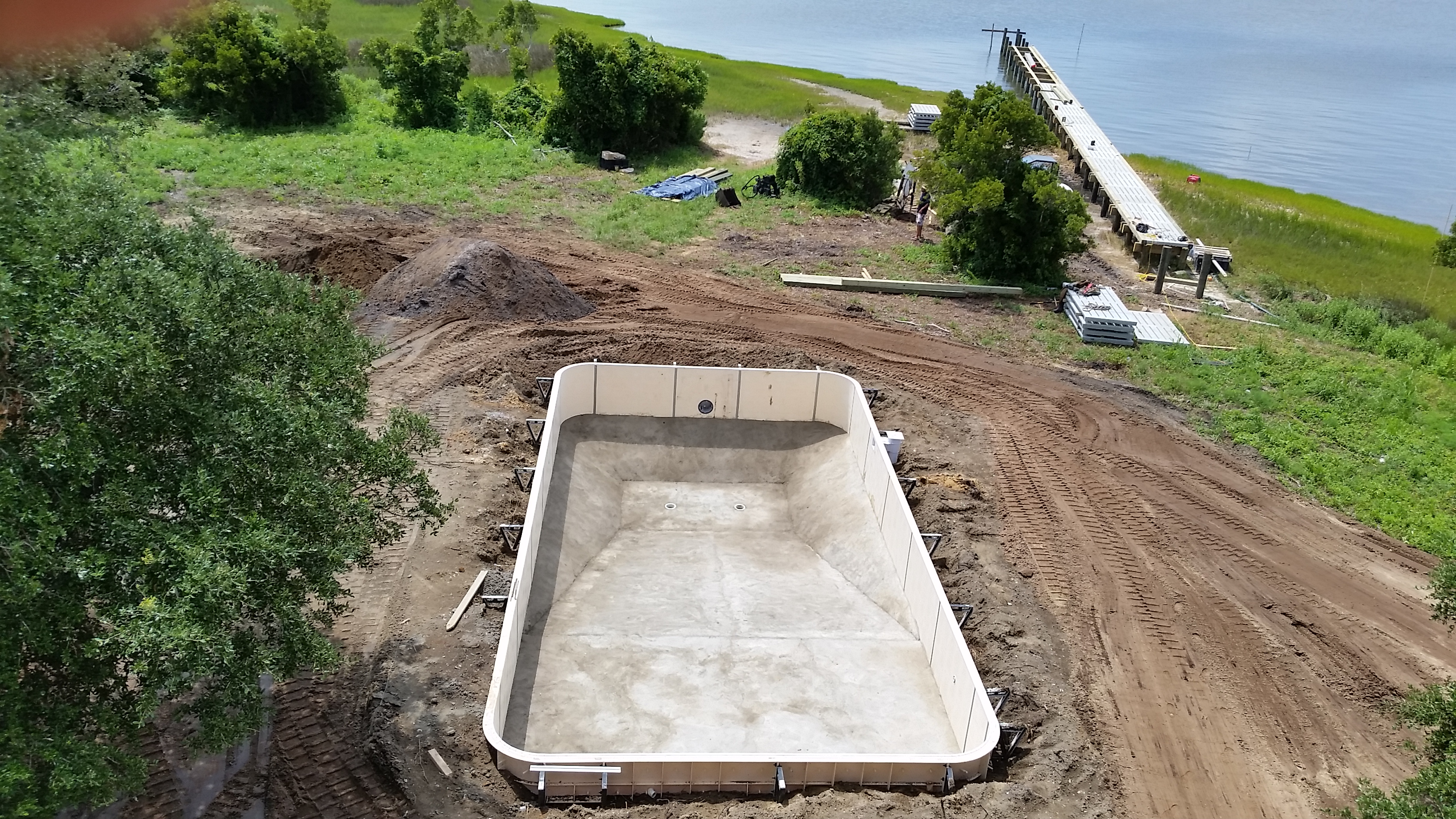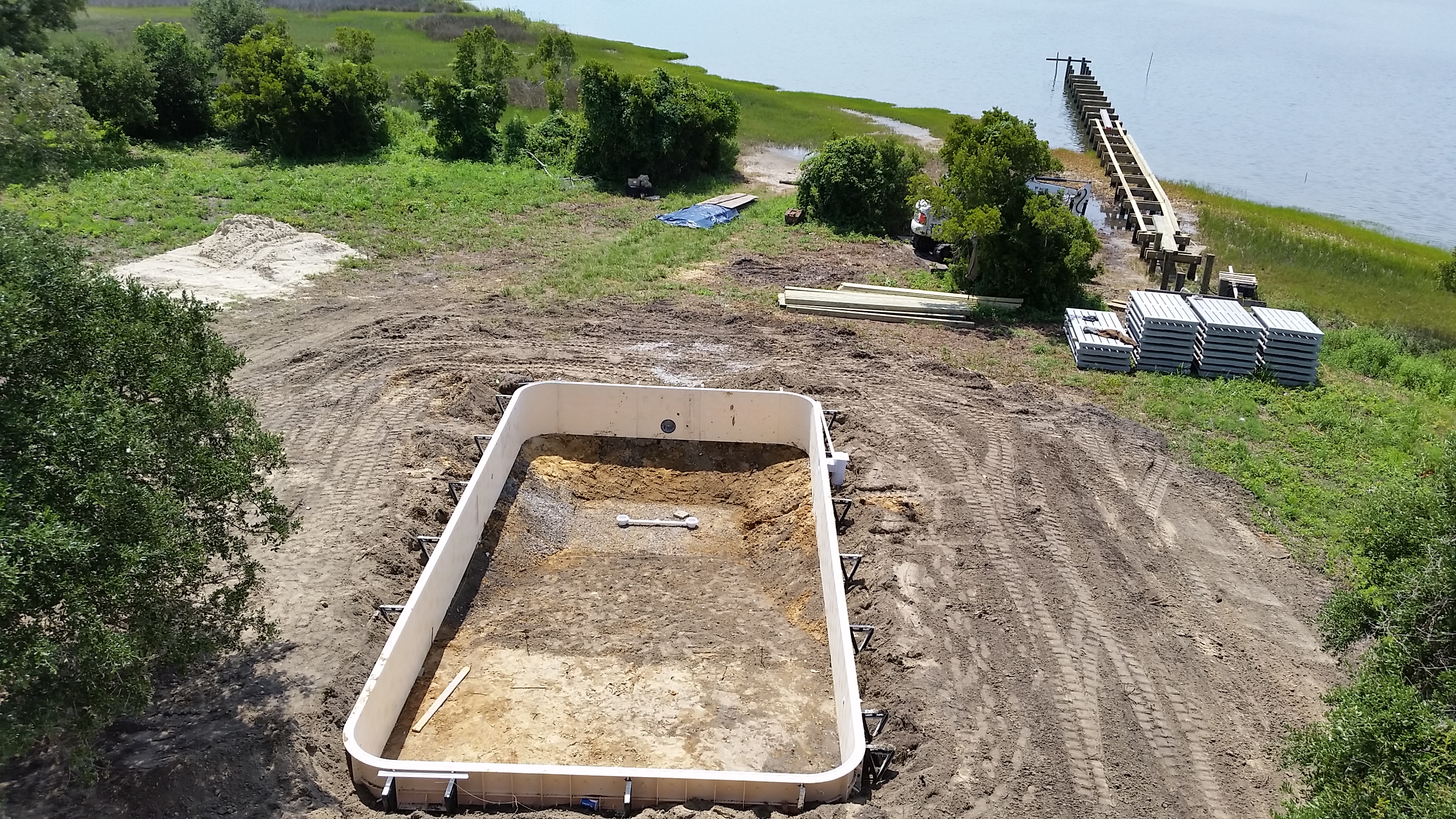 The end of June and the start of July was busy. We received permits for the pool and the dock, and installed the underground electric, communications and septic system. Dean Barnes, the marine contractor, of Mud Bucket Dredging has staged dock materials and a small excavator on site and will be starting after the Independence Day holiday. Havelock Pool and Spa also is scheduled to begin after the holiday.