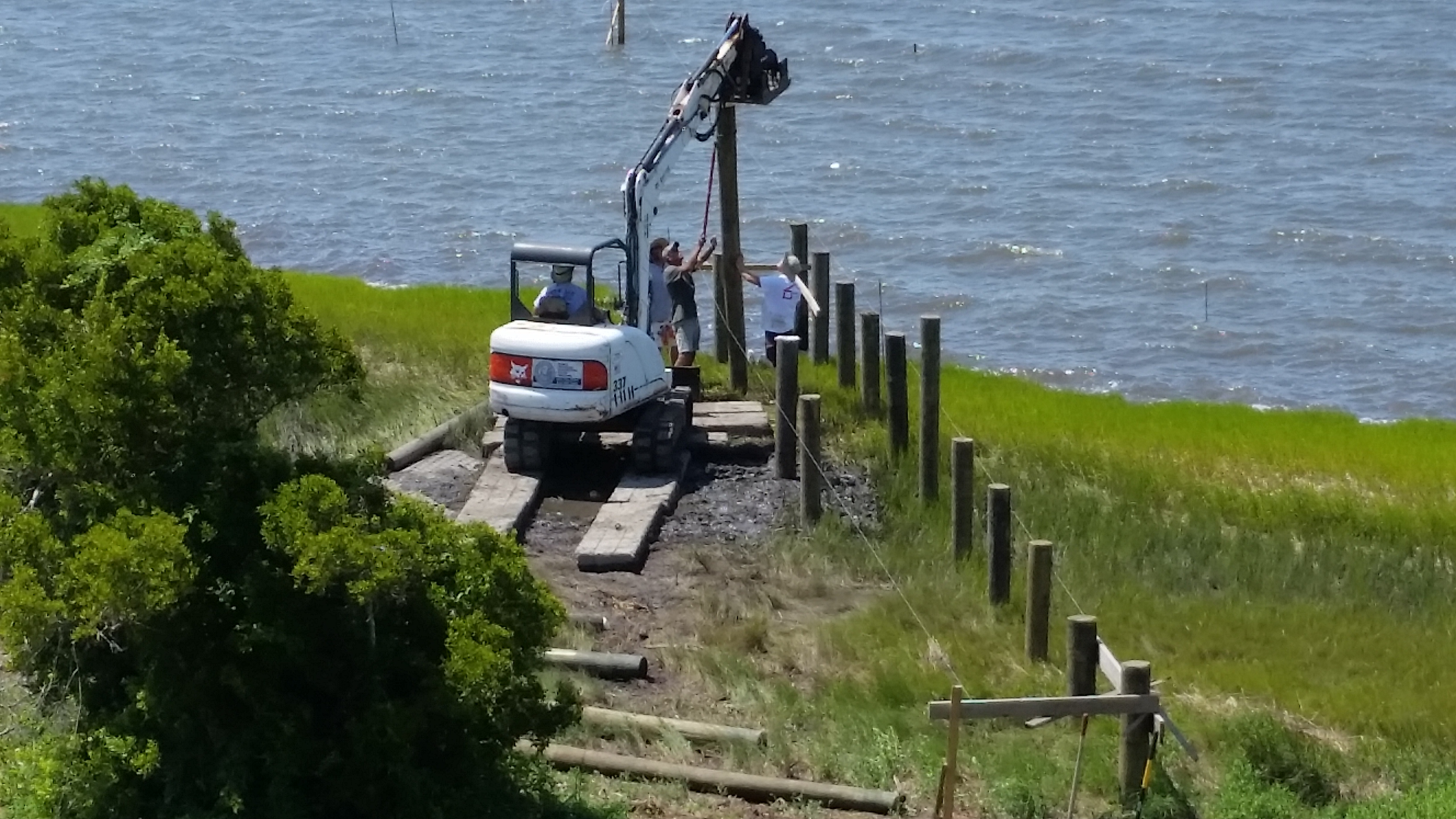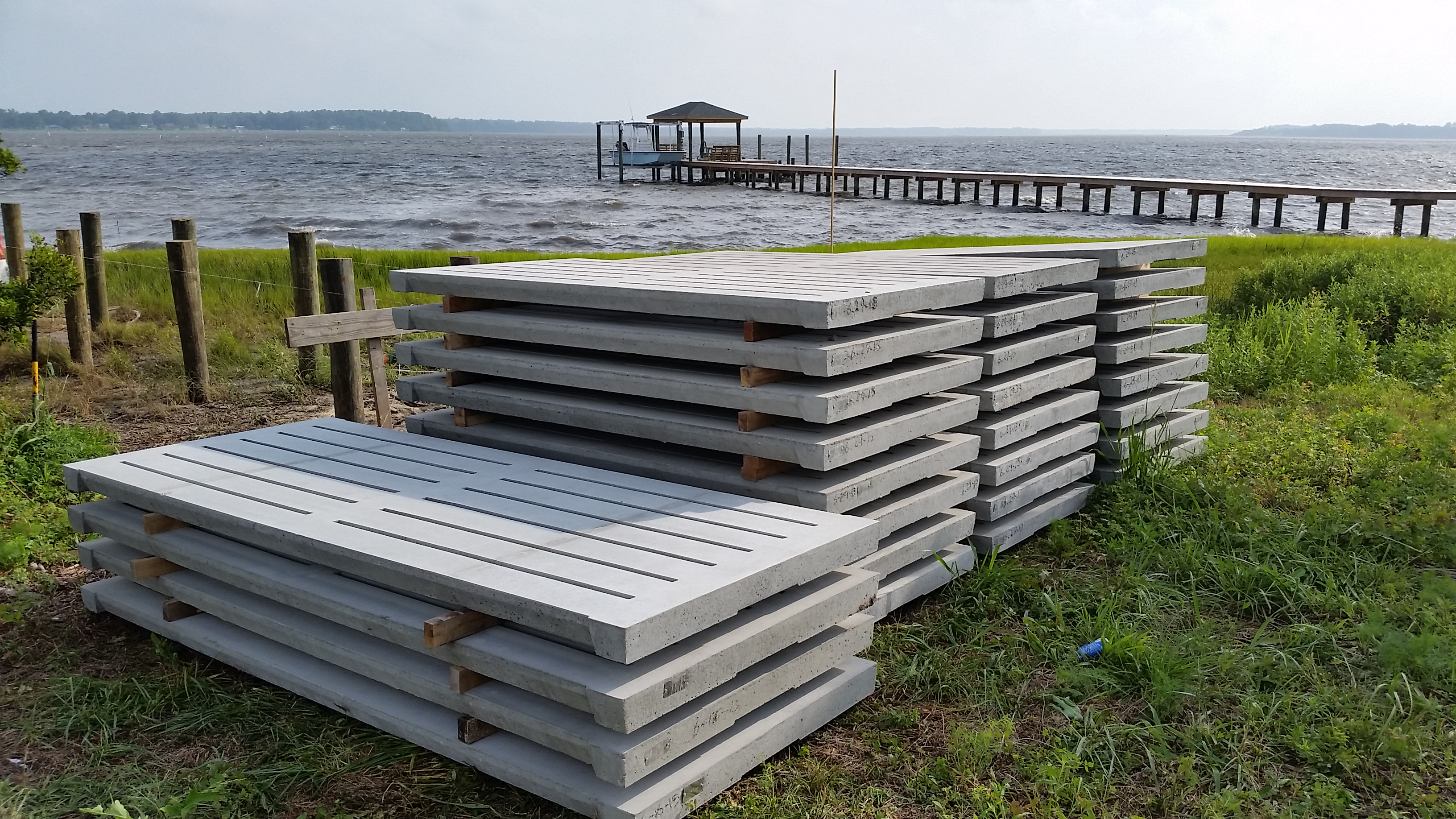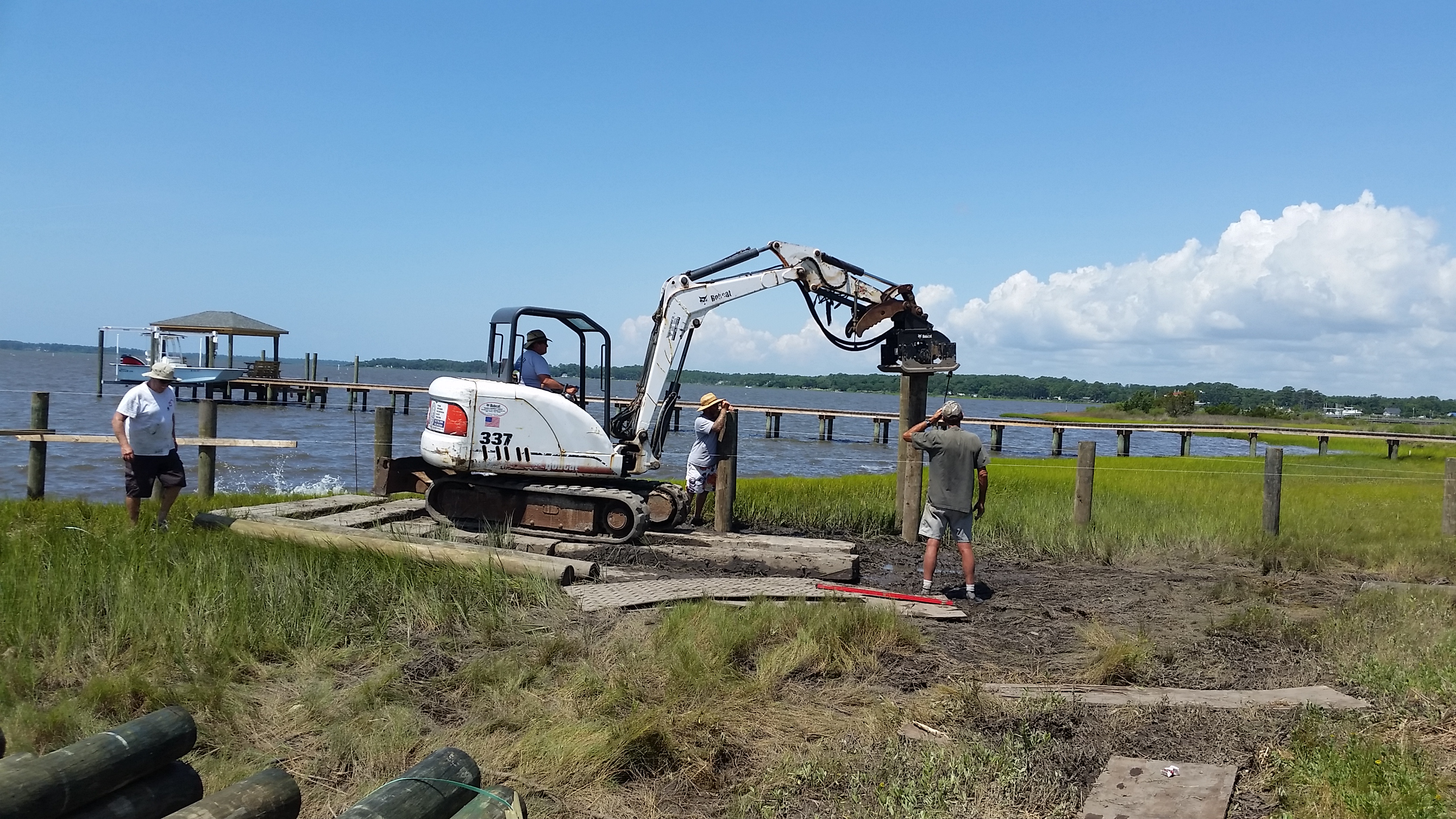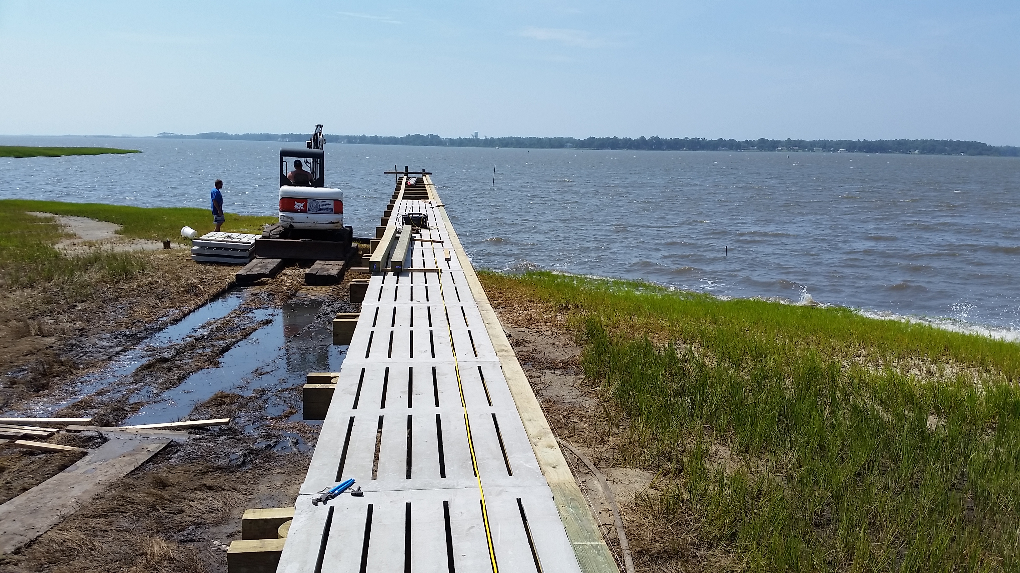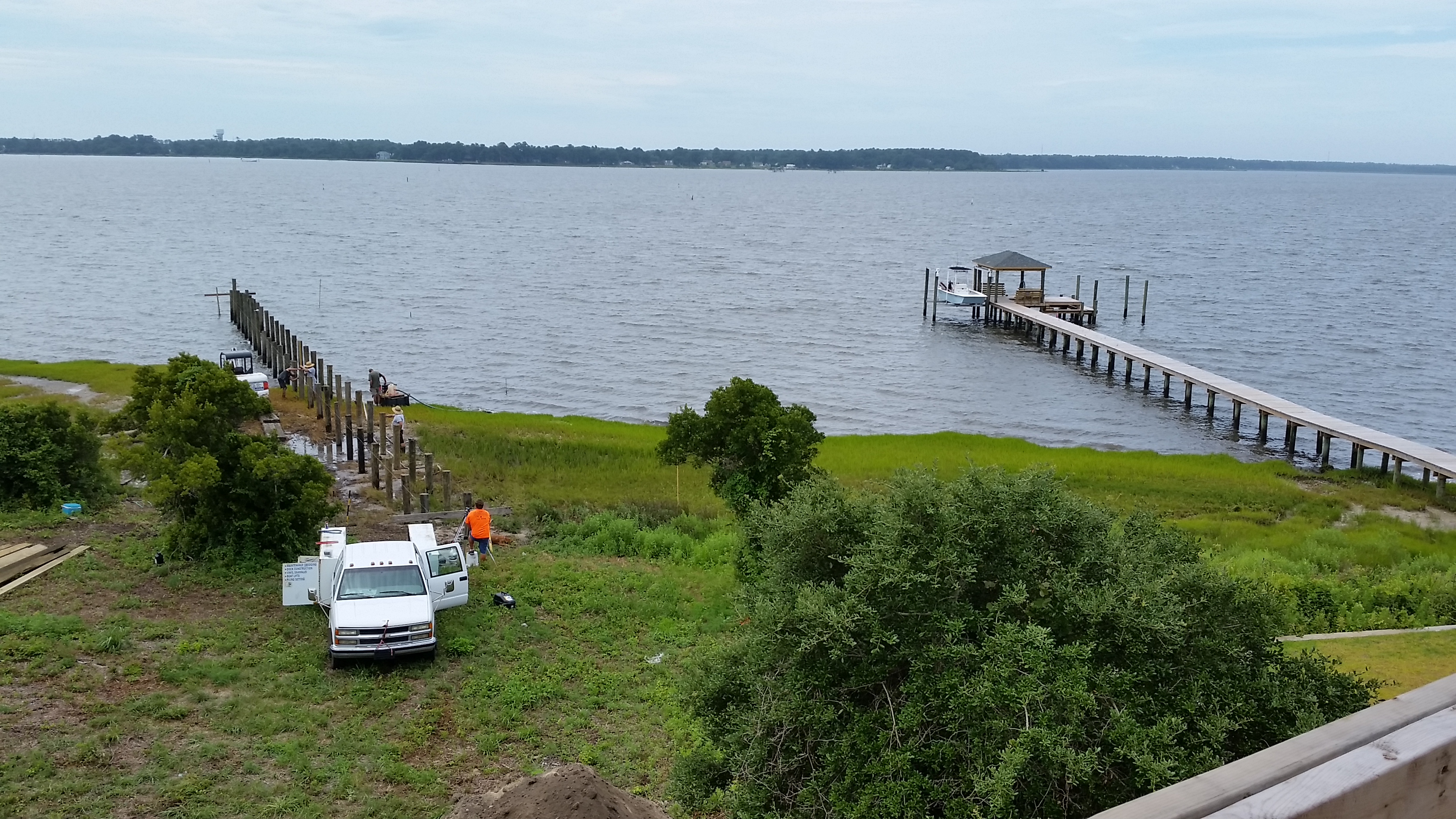 Dean Barnes of Mud Bucket Dredging stationed equipment and materials onsite in late June and really got moving after the Independence Day holiday. The photos on the left show two weeks of progress. We decided on an upgrade to marine-grade hog pen slats for the decking. Each unit weighs about 900 lbs which makes for a very substantial pier and dock and one which is likely to survive even the worst weather relatively unscathed. We changed the plan slightly to have the boat lift at the far end rather than on the east side. At extreme low tide, there was no water on that side.