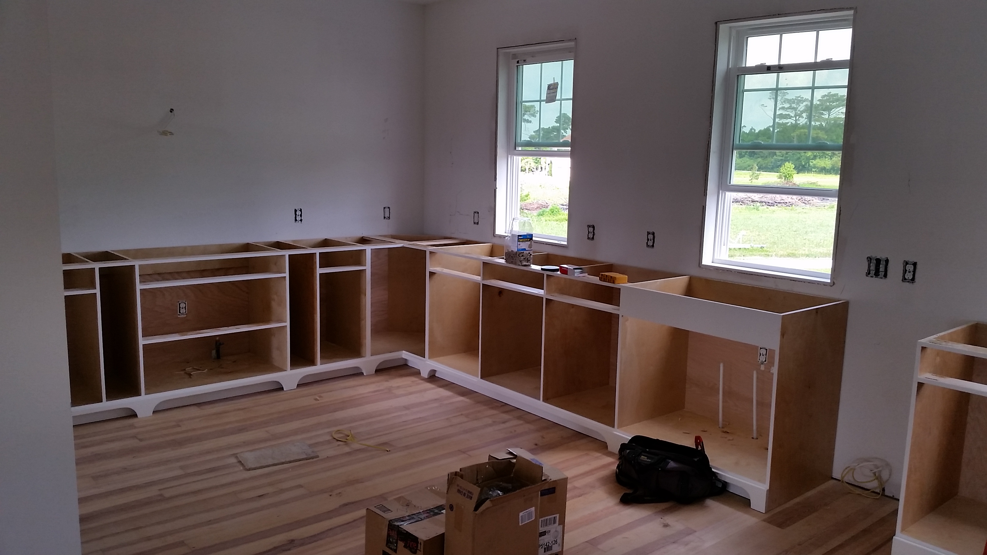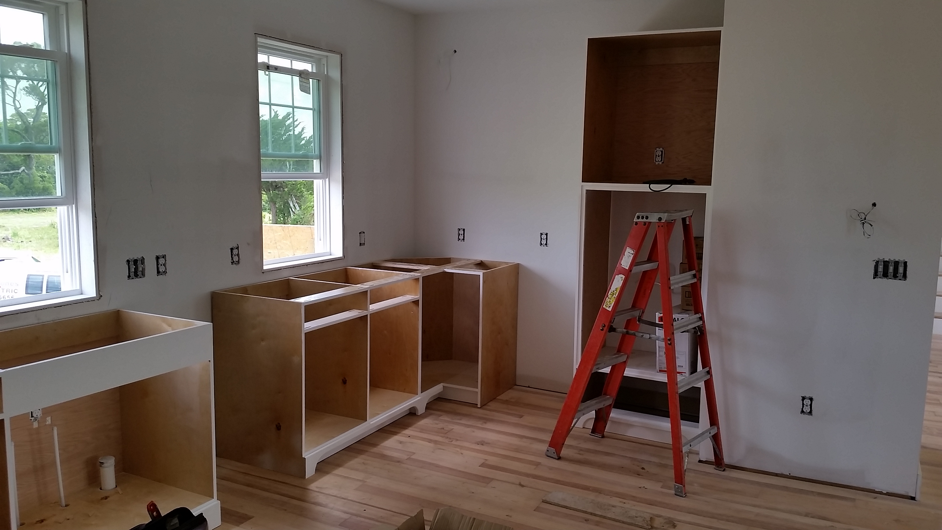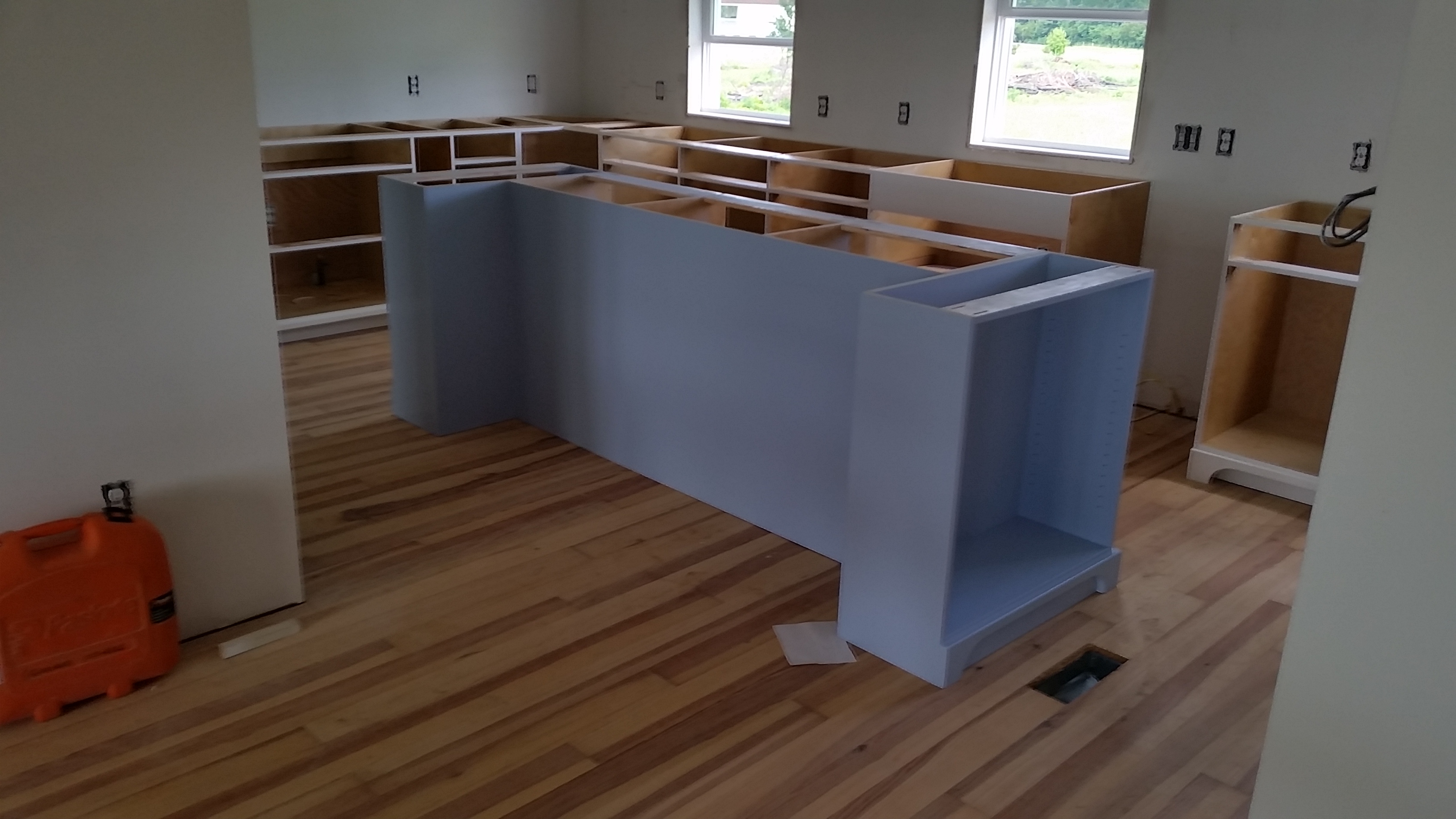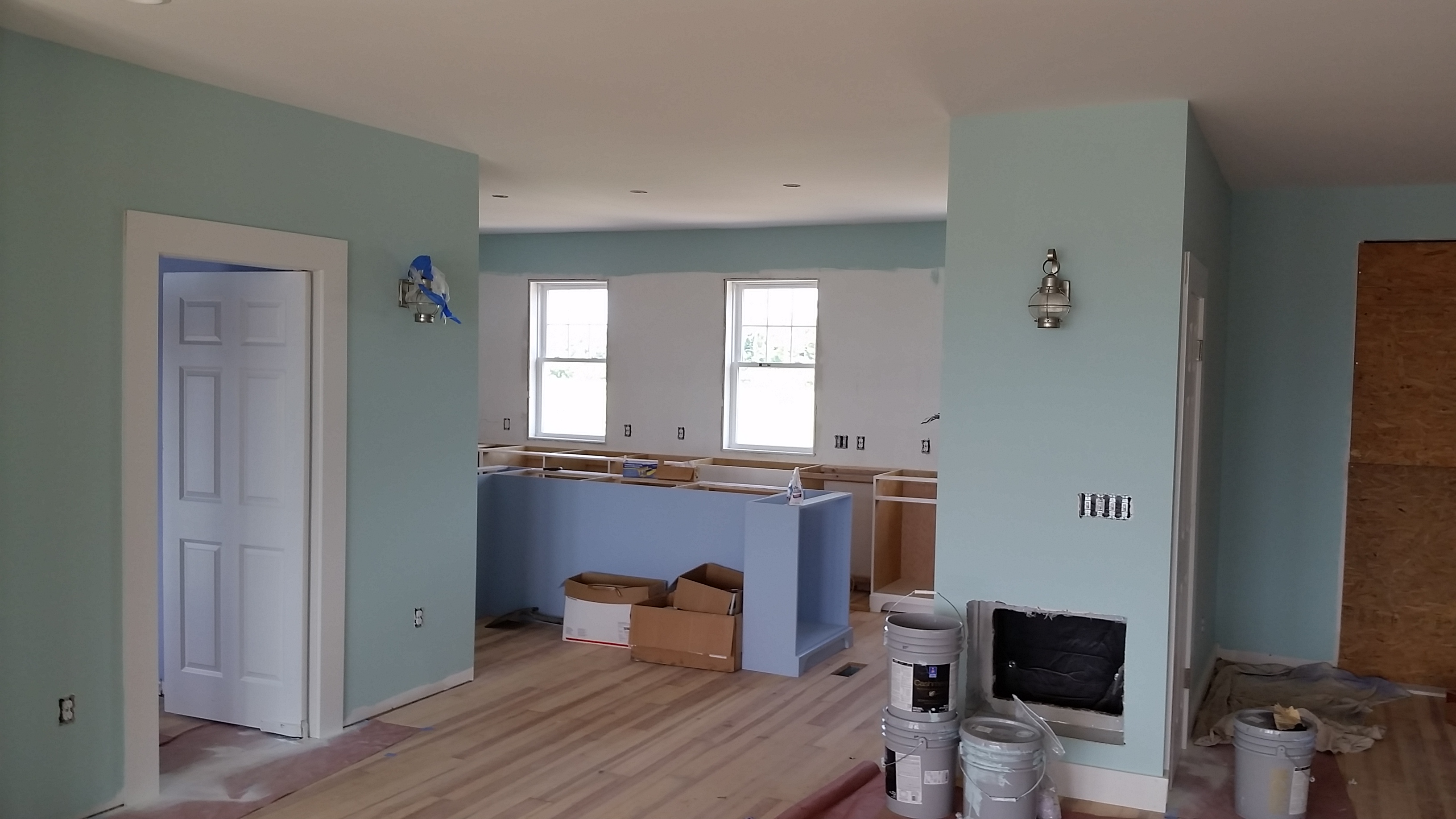 Kemp Guthrie, The Wood Surgeon, began installing kitchen cabinets in mid-July. These are exactly what we were looking for. Our sapele countertop for the kitchen island and soapstone for the rest of the kitchen counters is at the fabricators. They should be preparing templates by the end of this week. We decided to paint the island pale blue. We think this will complement the rest of the cabinets which will be white and the the pale green we've selected for the kitchen and living room walls.