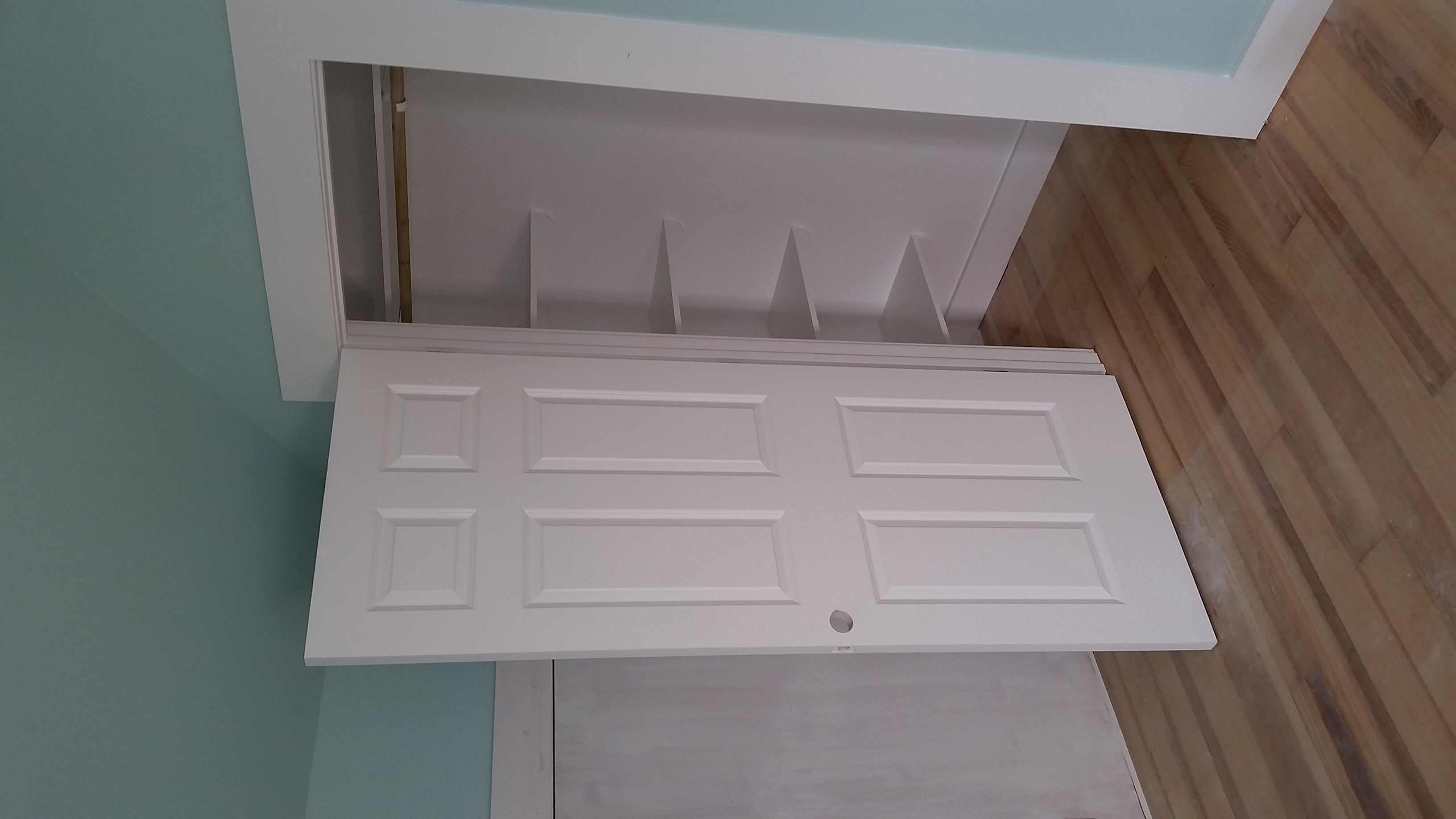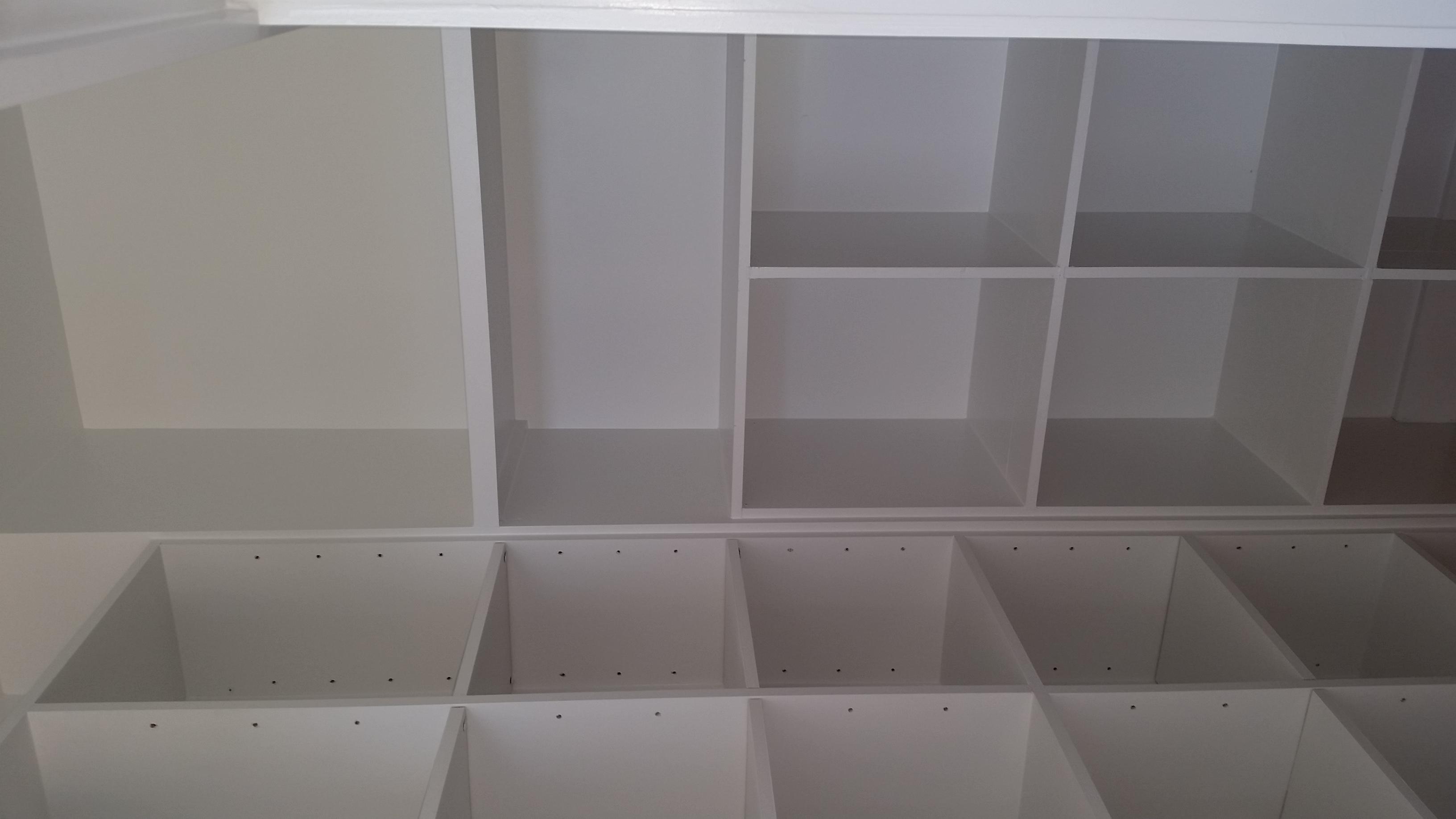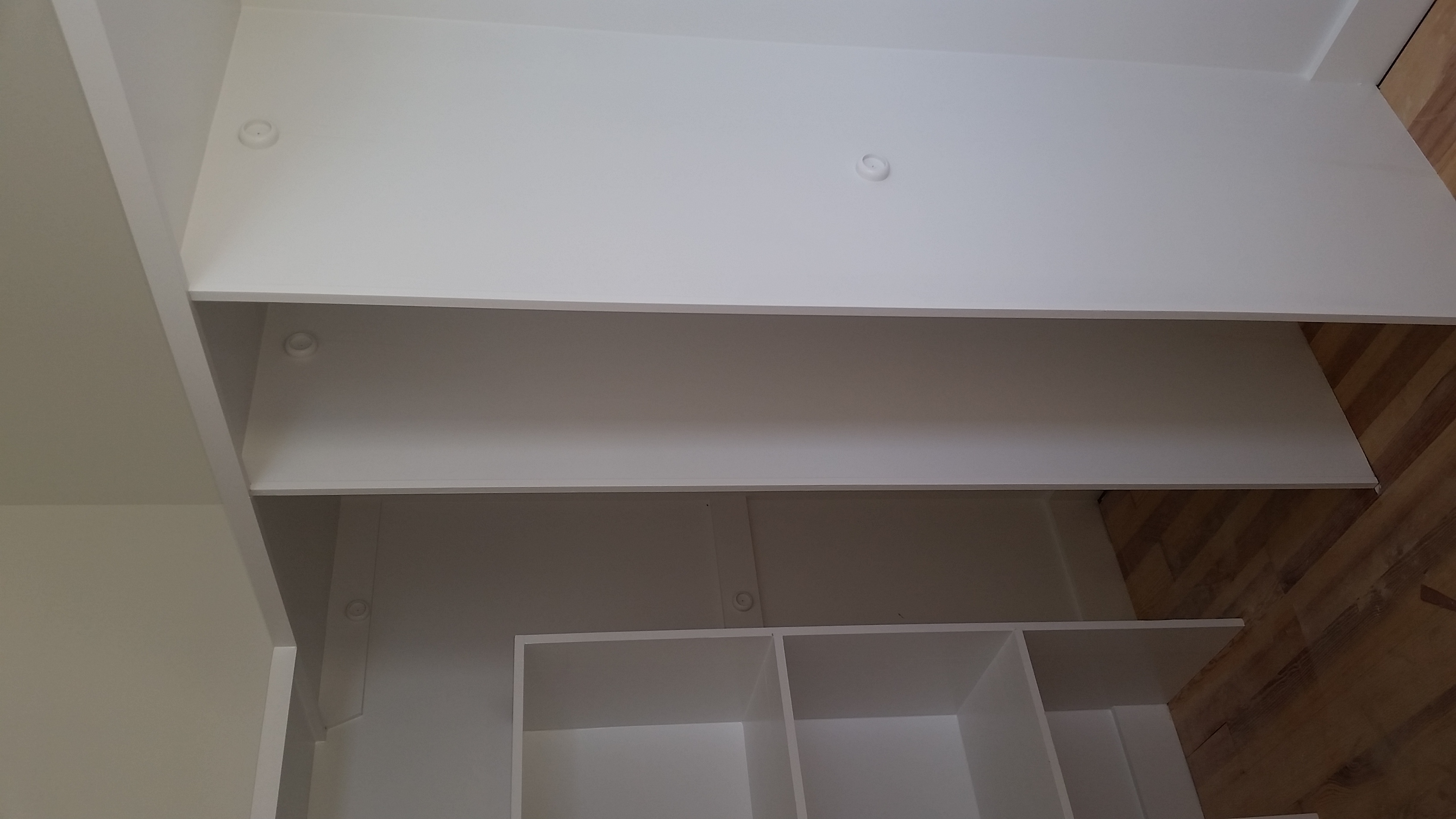 We designed some basic closet organizers, drew the designs with SketchUp and Archie's finish carpenters built everything onsite. The closets in the hall and guest bedrooms are pretty basic with hanging and open shelf storage in lieu of a dresser or armoire. The walk-in closet in the master bedroom is a bit more elaborate with open cubbies on two walls in addition to a wall of hanging storage. Some of the closet details are also shown in the Painting section, below.