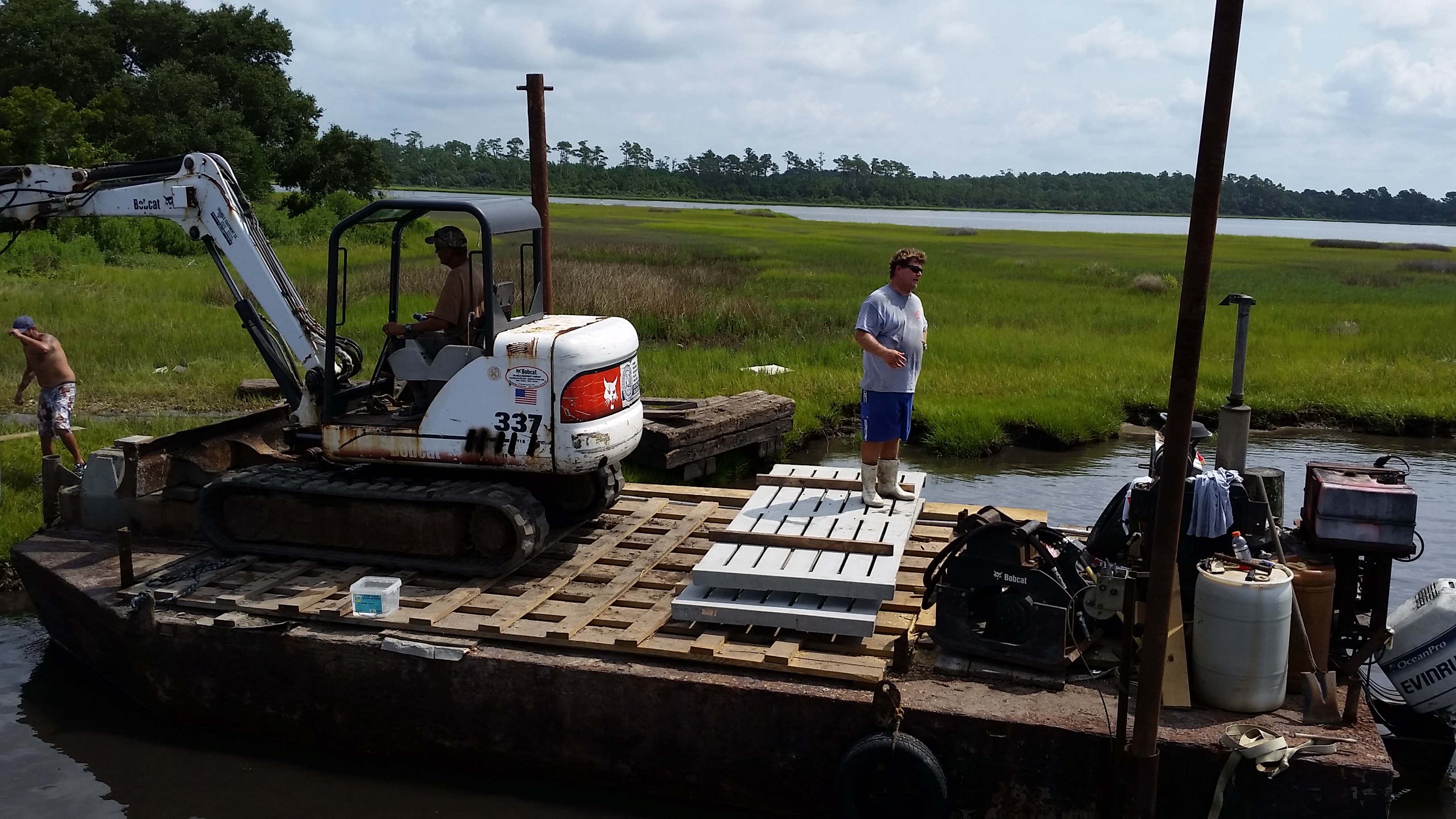 As shown in the last picture of this sequence, placing the decking goes pretty quickly. By moving the mats outward at low tide, they hope to be able to use the Bob Cat Excavator to place most of the decking. Luckily there is a hard sandy bottom on this side of the point. Clams and oysters abound between the new dock and the point and are easy to harvest at low tide.
