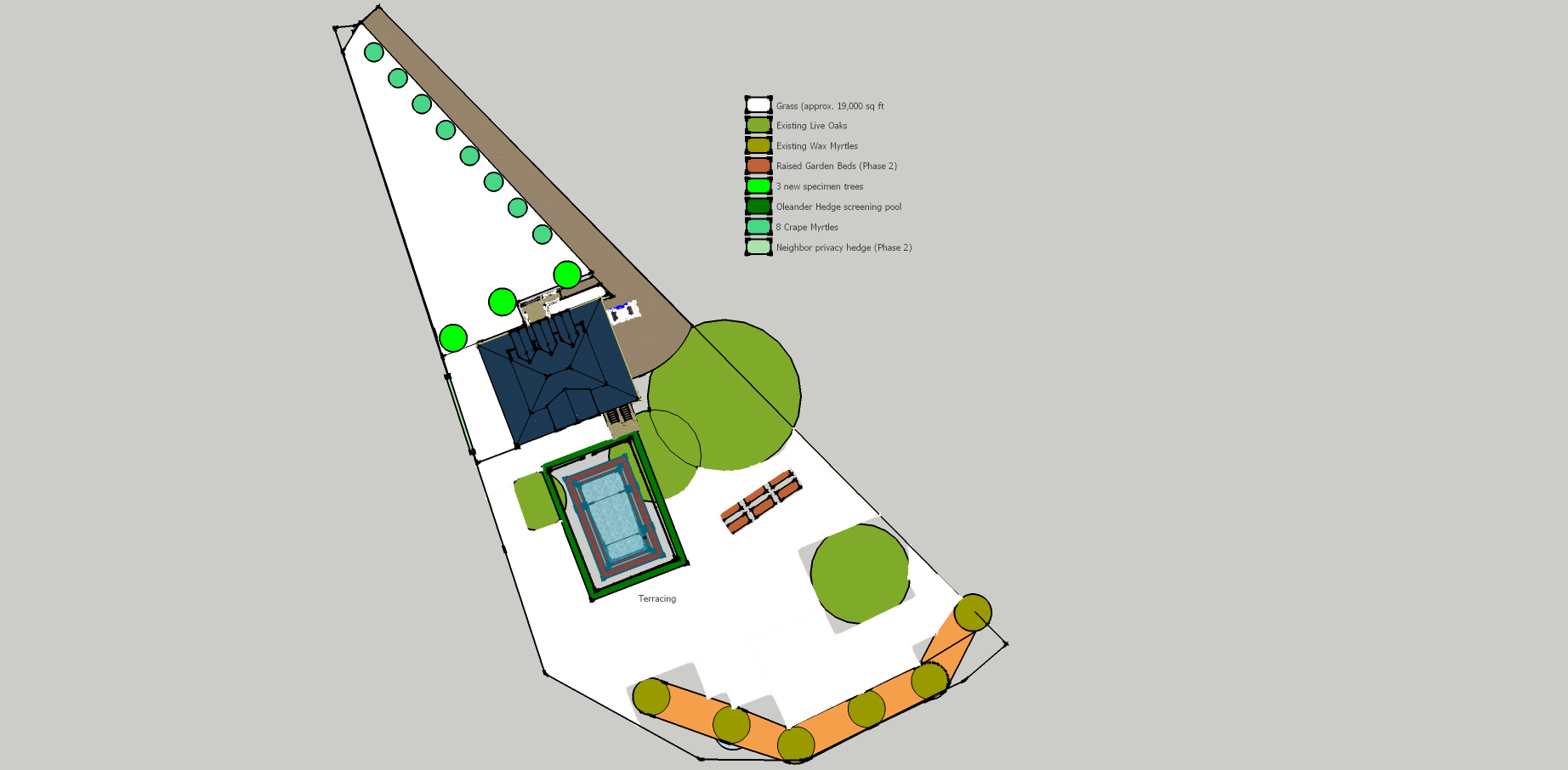 We met with one landscaper and discussed some preliminary ideas. We outlined some basic concepts in SketchUp in order to get a rough idea of the areas involved. We'd like to include an irrigation system and a rainwater cistern, but will have to see what is left of the budget. Except for the pool and the dock and upgrades for roof, flooring, beadboard in the master bath and cable railings on the porch, we seem to be in good shape on the original estimate.